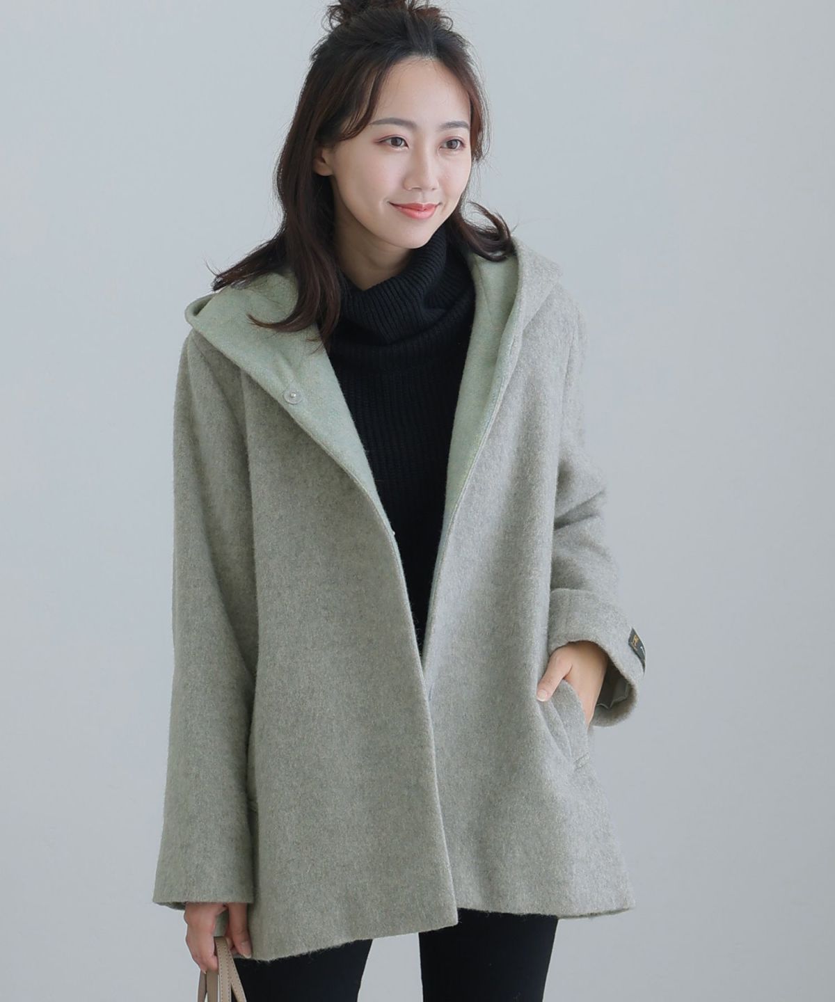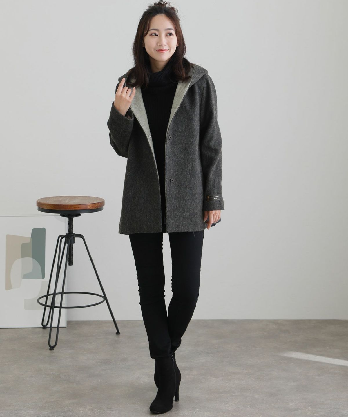 ■寒い冬にピッタリなウールシャギージャケットフード付きのシンプルなコートです。様々な服装に合わせやすいデザイン。普段使いから通勤まで幅広くご使用いただけます。