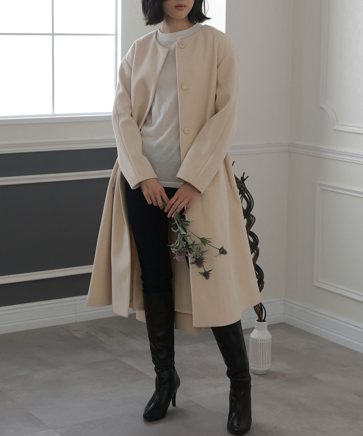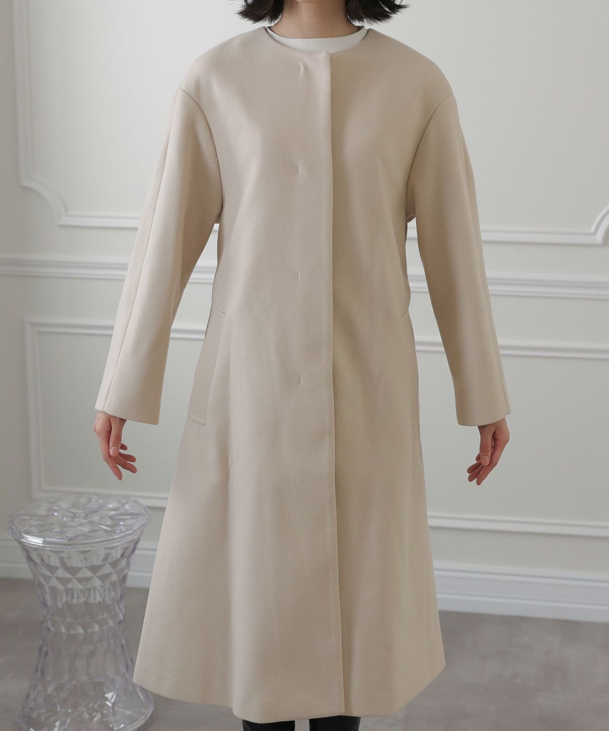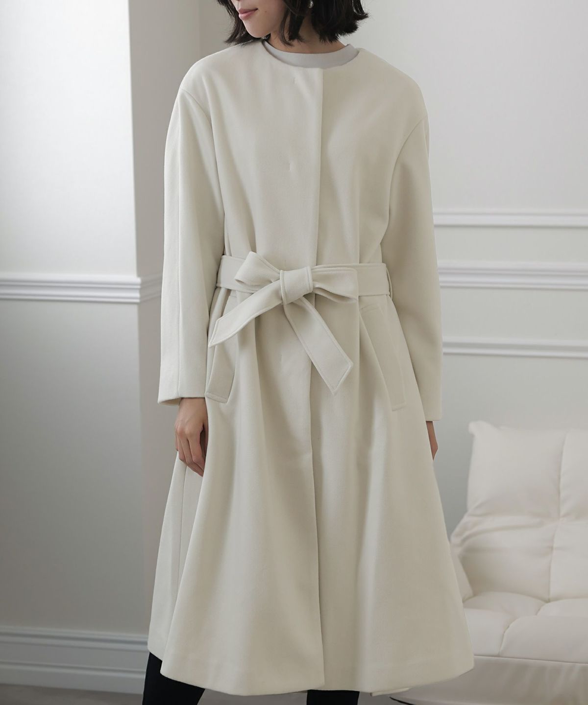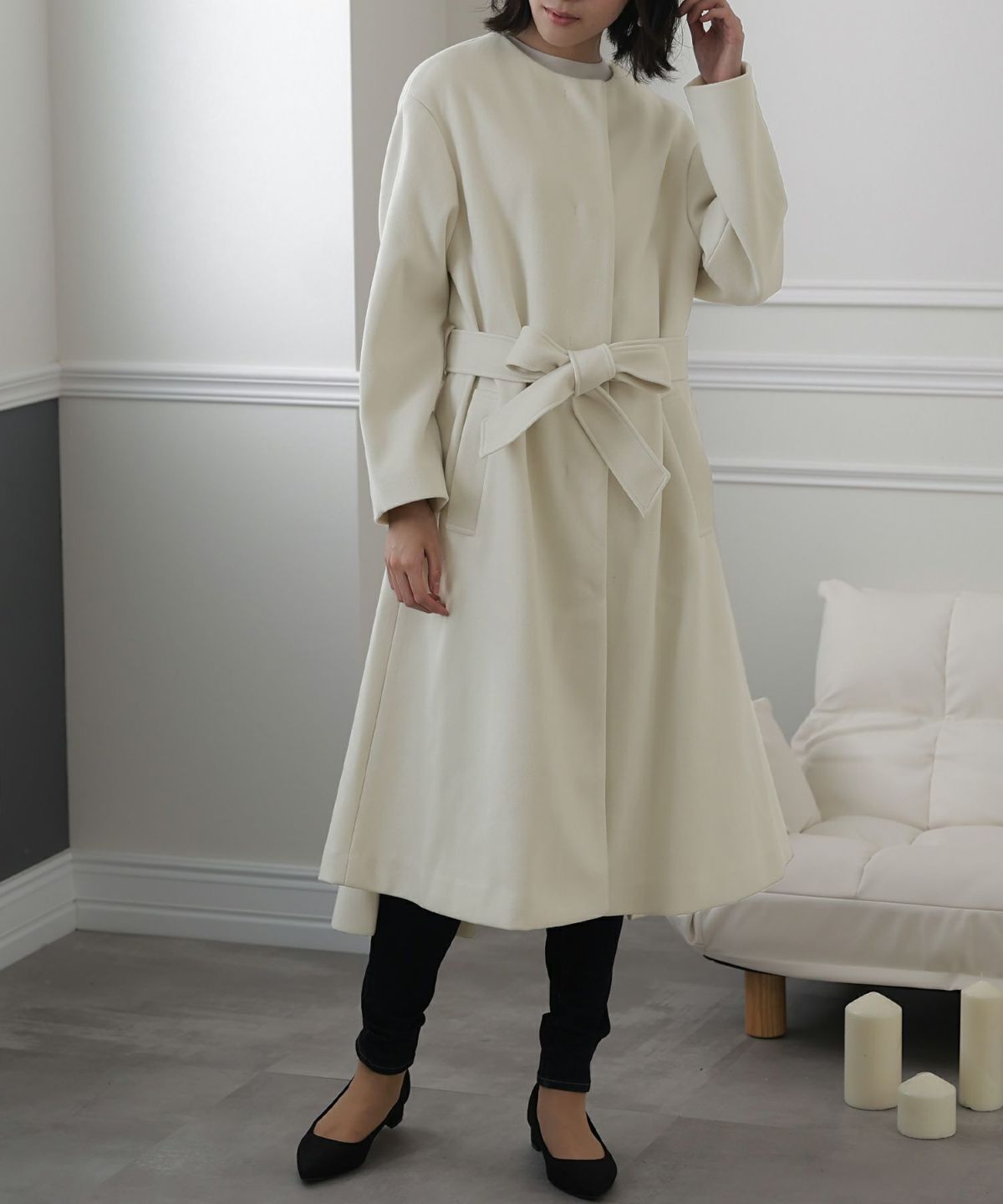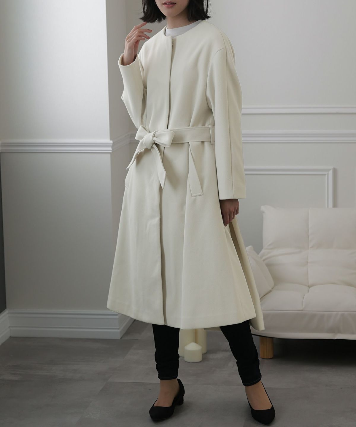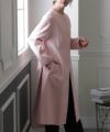 背面のタックとベルトデザインが可愛いコート。裾が広がるAラインのシルエットはスタイルアップ見せも叶える嬉しいアイテム。