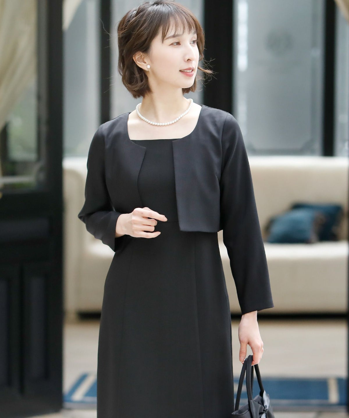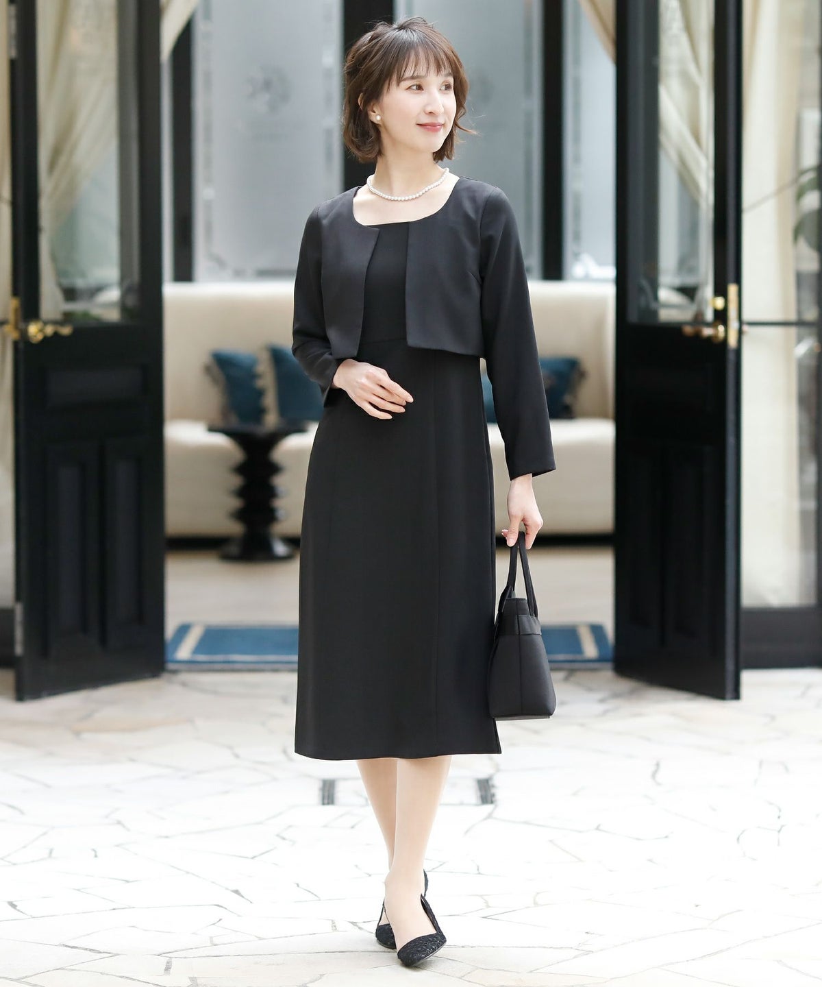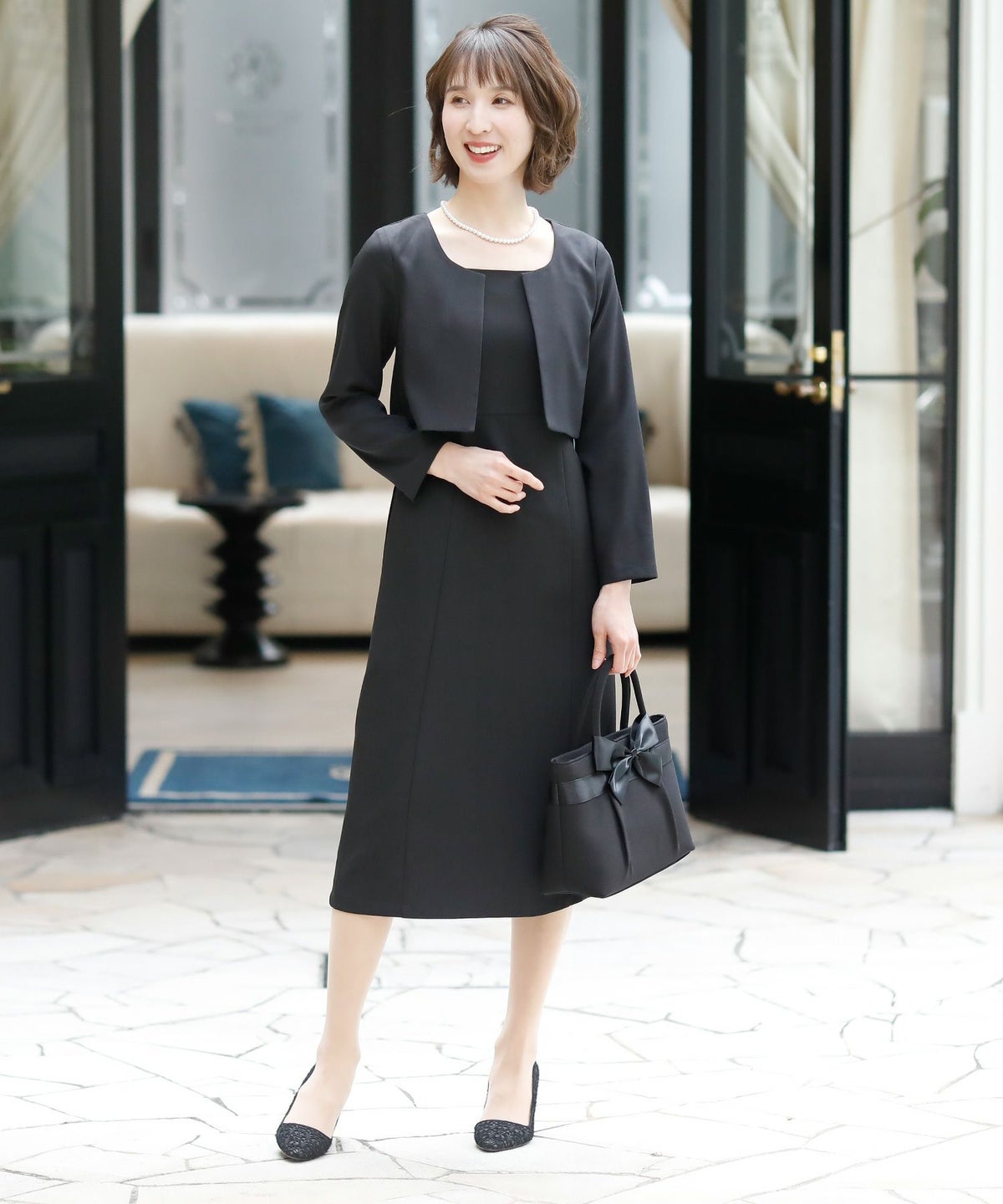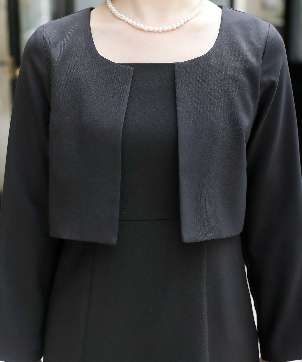 ★体型カバーポイント------------------------------------------------------------【二の腕】【脚】【ウエスト】【ヒップ】きちんと感のあるスッキリとした着こなしが出来る羽織風ワンピース。丈が長めで、座った時に安心です♪★トロンプルイユワンピース☆------------------------------------------------------------冠婚葬祭や学校行事等、幅広いシーンに対応できるジャケット一体型ワンピース♪だまし絵の意味を持つトロンプルイユ。ジャケットを羽織った様に見えますが、1枚でさらっと着て頂ける優秀ワンピースです!★シルエットが綺麗!------------------------------------------------------------ジャケットとワンピースを一体化することによってもたつきが無くなりスマートな印象。ウエストラインが綺麗に見えてスタイル良く見えます♪★素材感------------------------------------------------------------程よい光沢感が上品で、高級感がある生地感です。★こんなシーンの利用にオススメ♪------------------------------------------------------------【結婚式】【二次会】【同窓会】【食事会】【セレモニー】【発表会】【オフィス】でもご利用いただけます。