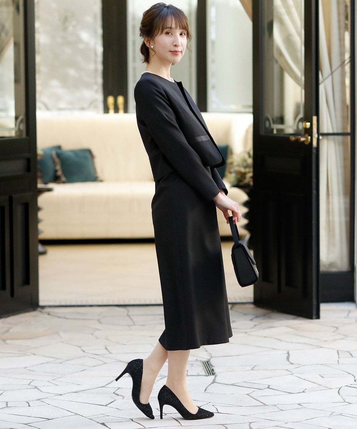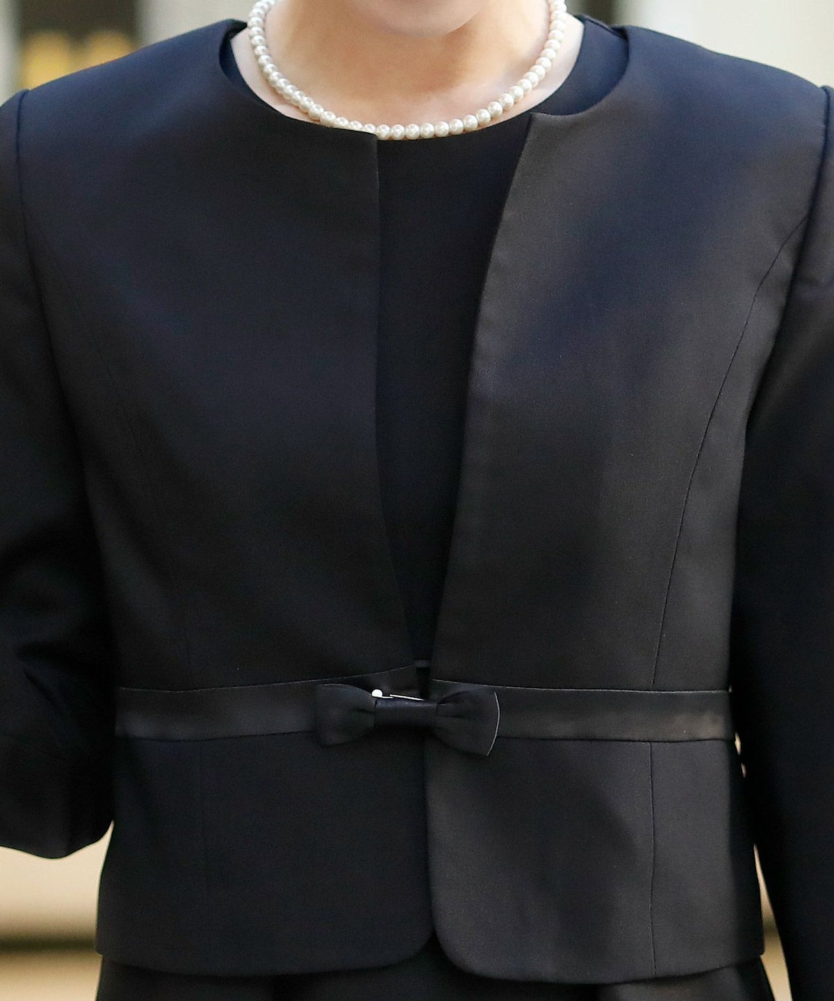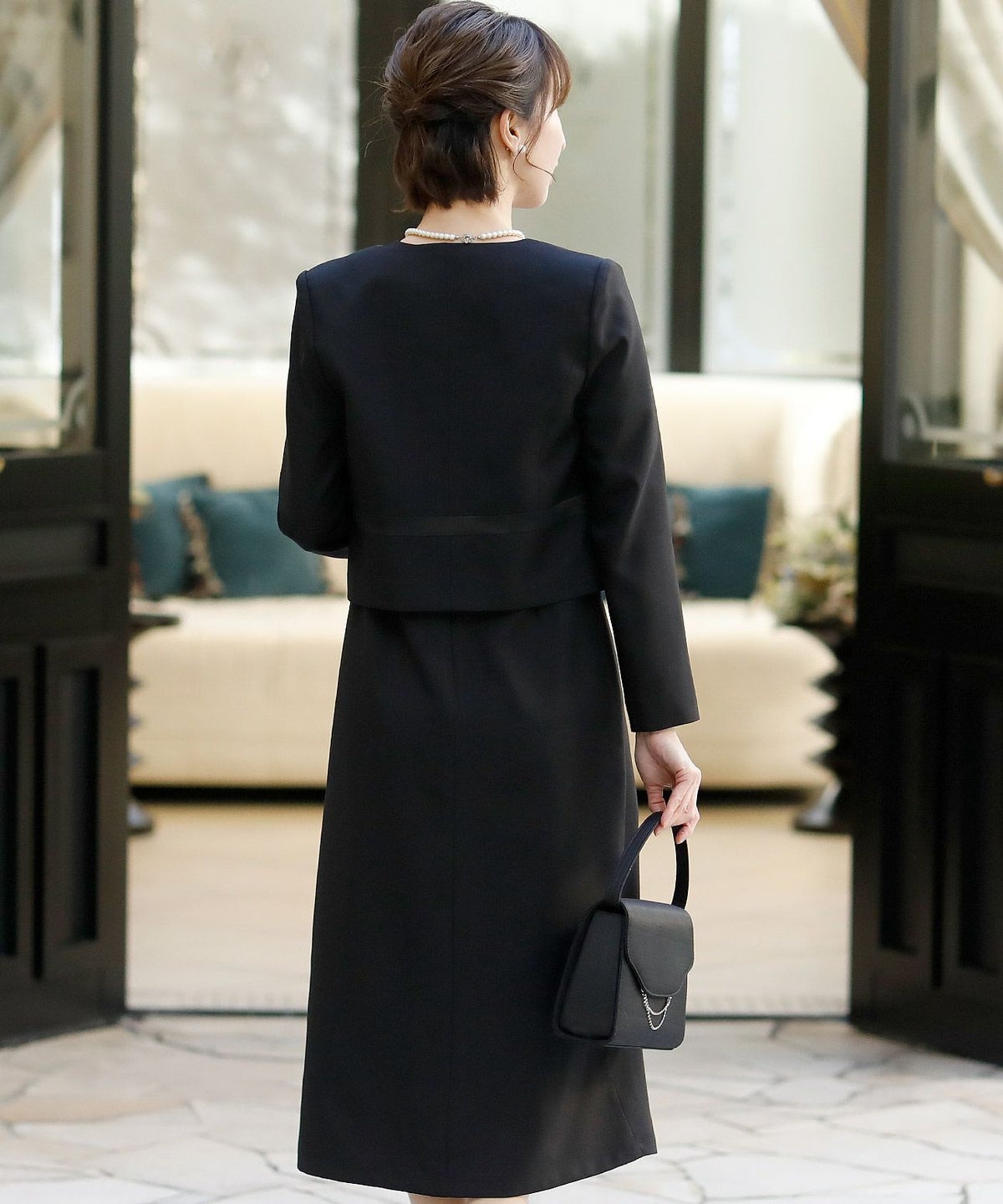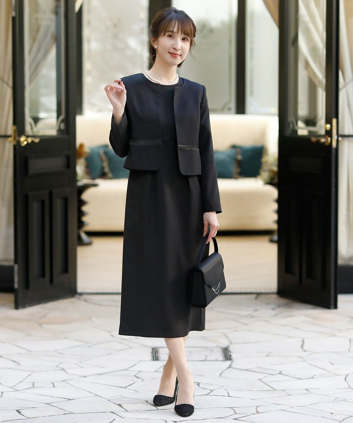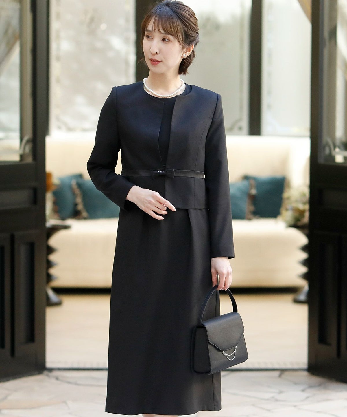 ★体型カバーポイント------------------------------------------------------------【二の腕】【脚】【ウエスト】【ヒップ】ウエスト部分にはサテンテープを使い、ウエスト位置を高く細く見せながら、足長効果も期待できる!★上品清楚なリボンジャケットとワンピースのアンサンブル♪------------------------------------------------------------夏場や暑い季節はワンピースで、その他の季節はアンサンブルとして着用でき一年中季節を間に合わずお使いいただけます。別々に着て頂くことで、様々なシーンに対応!このセットで結婚式等の華やかなシーンからフォーマルなお式まで幅広く活躍できるスーツセットです。★上品な印象♪取外し可能リボン付きジャケット------------------------------------------------------------首元はすっきりして見えるノーカラータイプです。デコルテが美しく見え、また肩パット入りなので品のある女性を演出!ウエスト部分のリボンは取り外し可能なので、気分に合わせて使用できます。★オシャレかつスタイルがよく見えるワンピース♪------------------------------------------------------------高めのウエスト位置から伸びる切り替え&タックで、体のラインをほっそり綺麗に見せてくれます。また、機能性だけではなく、デザイン性もあり1枚で着ても様になる優れものです♪★素材感------------------------------------------------------------しっかりとした生地感で高級感があり上品な印象♪ストレッチがあり着やすく動きやすいのもポイントです!★こんなシーンの利用にオススメ♪------------------------------------------------------------【セレモニー】【結婚式】【披露宴】【同窓会】【演奏会】でもご利用いただけます。