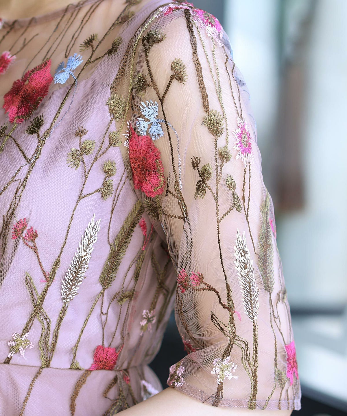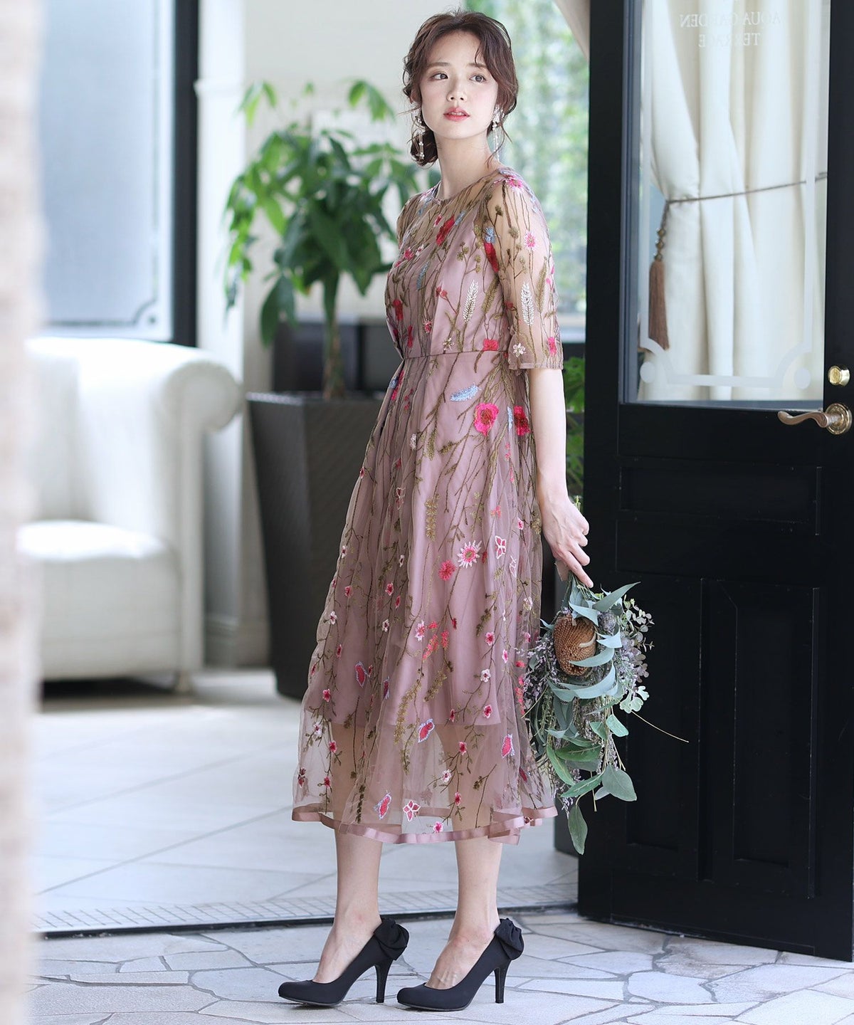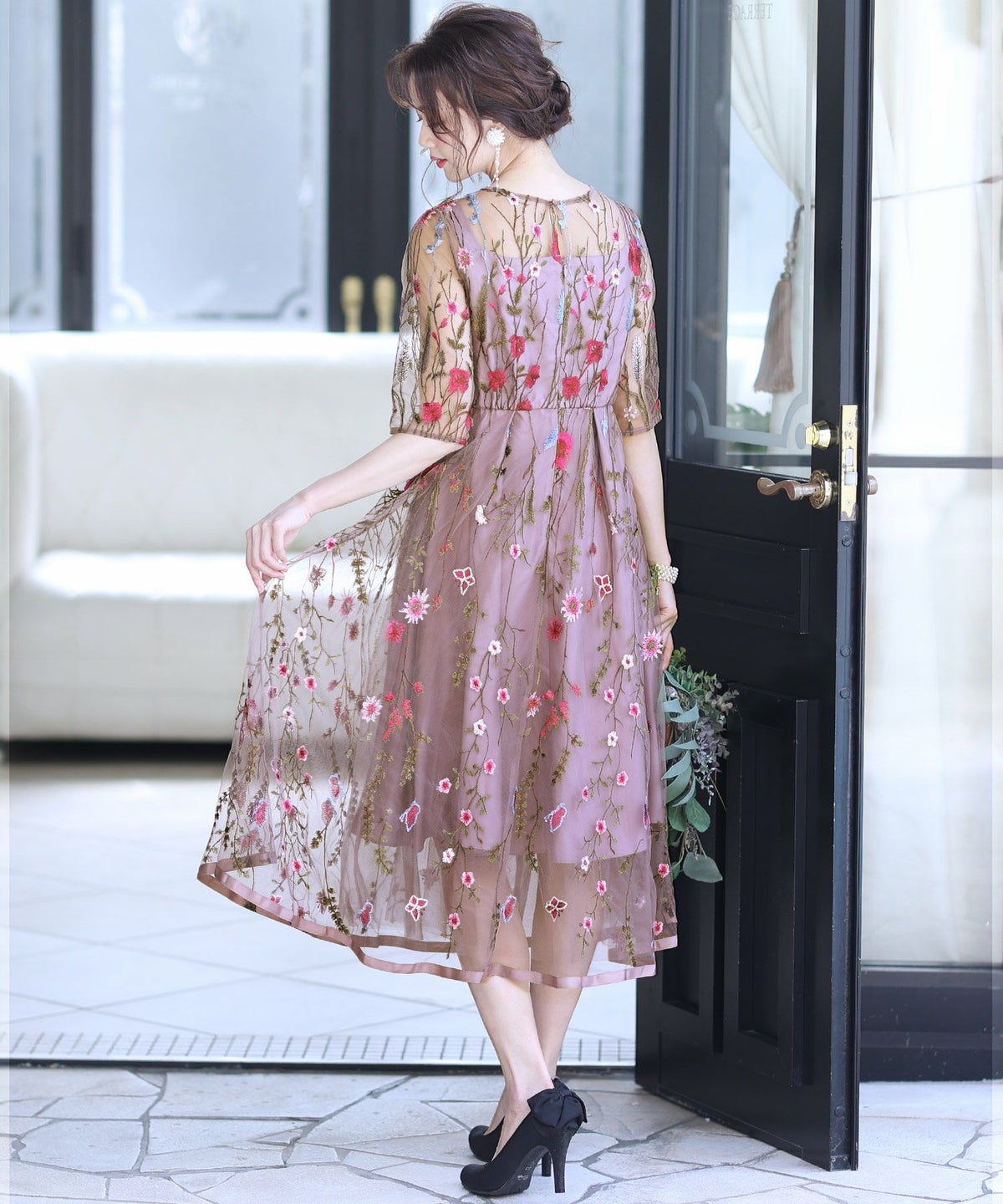 ★体型カバーポイント------------------------------------------------------------【腕】【脚】【ウエスト】【ヒップ】ハイウエストから裾に向かって広がるロング&リーン(縦長)シルエットが背を高く見せます細見えもかなえる女性らしい華奢さをアピール♪★ヴィンテージ刺繍------------------------------------------------------------シアーな素材感とニュアンスカラーでまとめたロマンティックワンピース。フラワーカラーの刺繍レースを贅沢に使用した華やかなスタイルです。★これ1枚で主役になれる------------------------------------------------------------ほんのりヴィンテージ感を漂わすクラシックなレディスタイルはどこから見ても、360度完成されたシルエットです。裏地の色で打ち立つような立体感を与え、刺繍の持つ繊細な美しさを際立たせています。★着脱しやすいデザインワンピース------------------------------------------------------------後ろウエストはゴム入り。見た目ゴムだと分かりにくいデザインなのでシルエットもばっちり。ファスナーは着脱しやすい後ろ仕様なのも◎★素材感------------------------------------------------------------刺繍レースとチュールを重ね、裏地と合わせた3枚重ねのデザイン。※花柄を一つ一つ刺繍しているため、柄周りに多少のシワが入っておりますが、デザインの特性上問題ございませんので、予めご了承ください。★こんなシーンの利用にオススメ♪------------------------------------------------------------【結婚式】【二次会】【同窓会】【食事会】【セレモニー】【発表会】でもご利用いただけます。