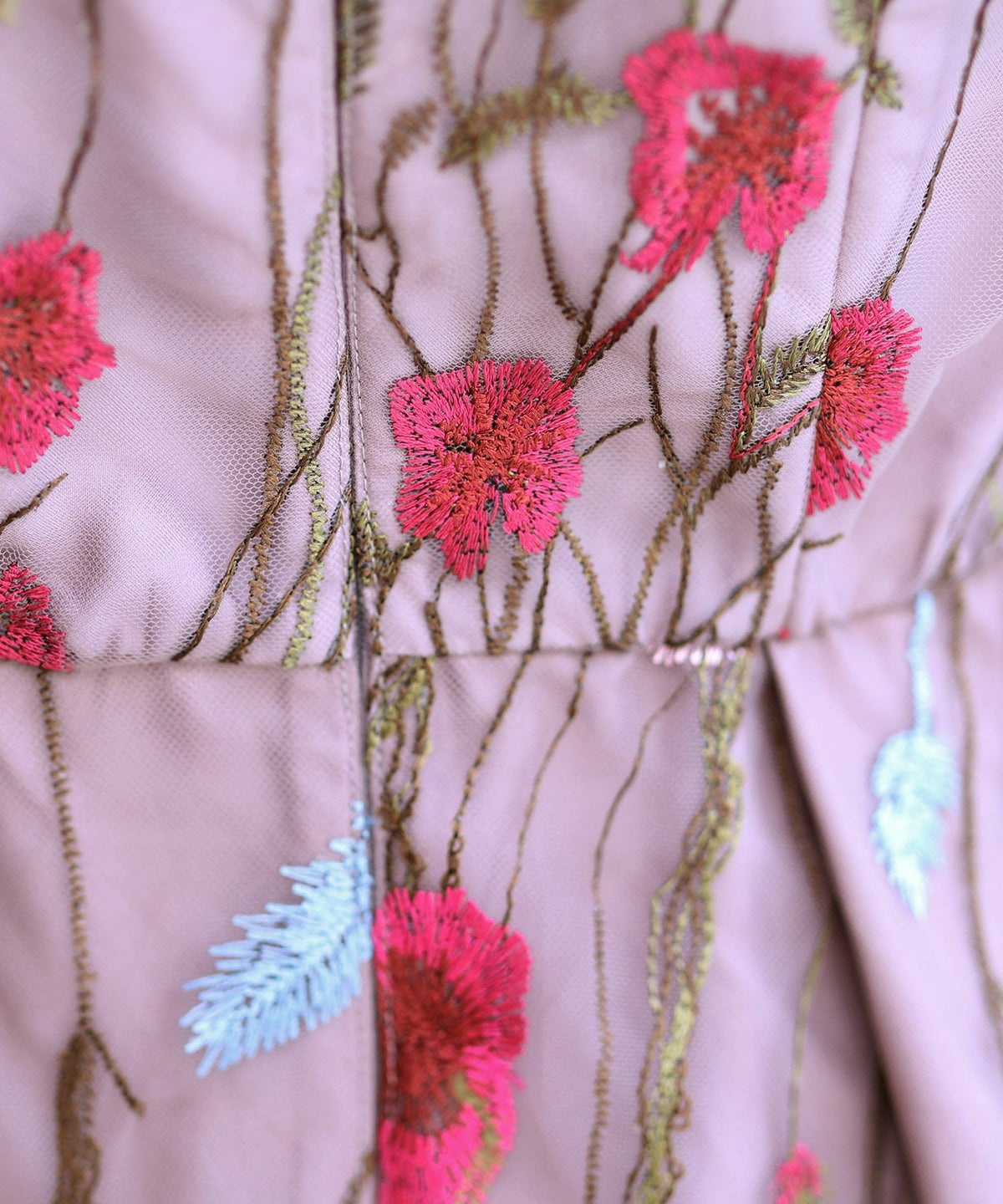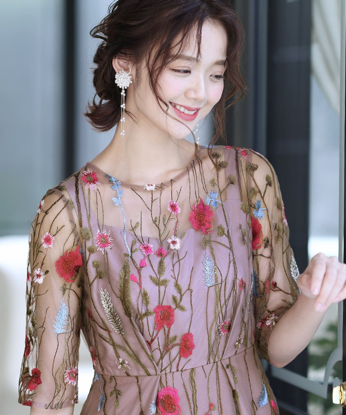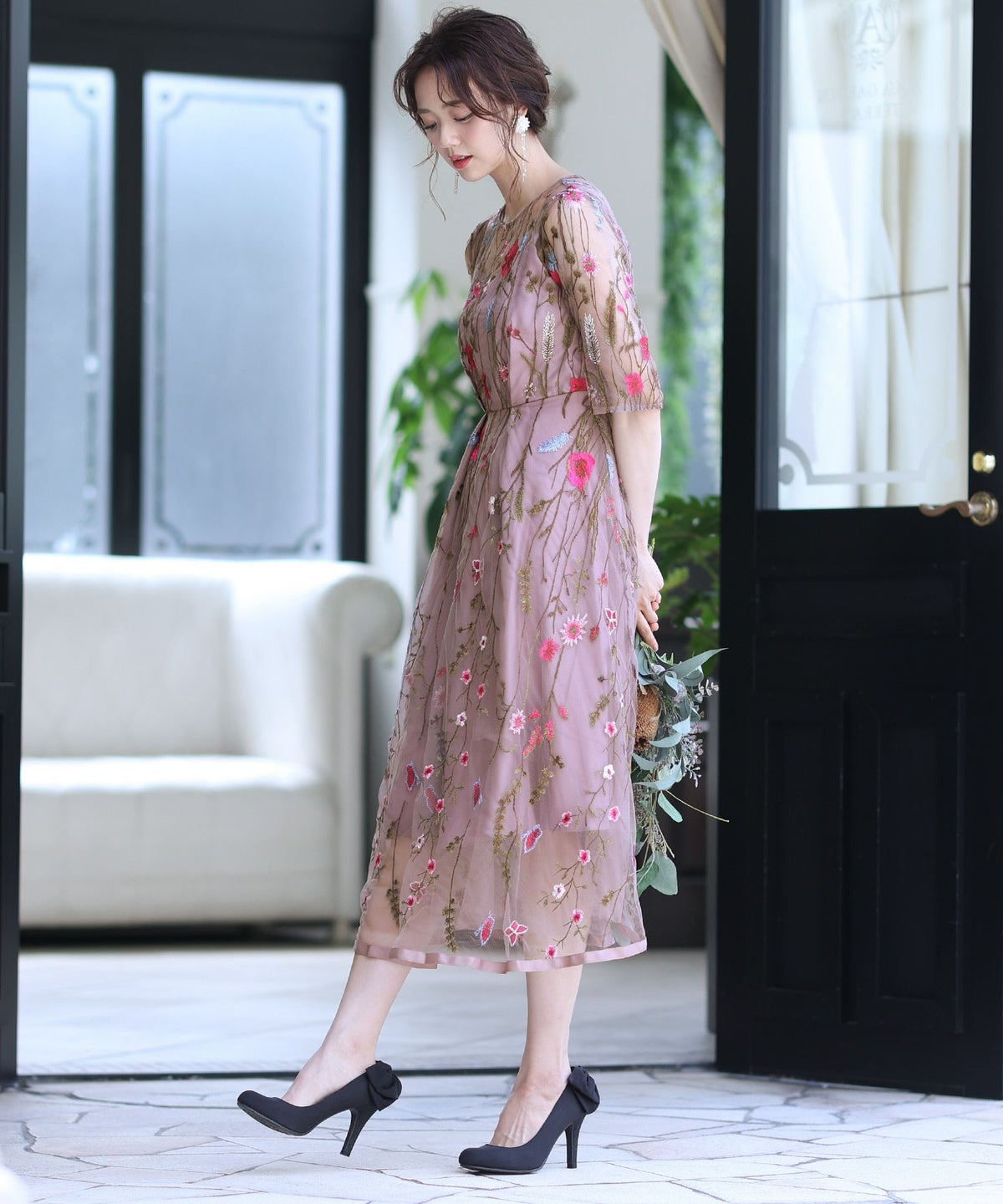 ★体型カバーポイント------------------------------------------------------------【腕】【脚】【ウエスト】【ヒップ】ハイウエストから裾に向かって広がるロング&リーン(縦長)シルエットが背を高く見せます細見えもかなえる女性らしい華奢さをアピール♪★ヴィンテージ刺繍------------------------------------------------------------シアーな素材感とニュアンスカラーでまとめたロマンティックワンピース。フラワーカラーの刺繍レースを贅沢に使用した華やかなスタイルです。★これ1枚で主役になれる------------------------------------------------------------ほんのりヴィンテージ感を漂わすクラシックなレディスタイルはどこから見ても、360度完成されたシルエットです。裏地の色で打ち立つような立体感を与え、刺繍の持つ繊細な美しさを際立たせています。★着脱しやすいデザインワンピース------------------------------------------------------------後ろウエストはゴム入り。見た目ゴムだと分かりにくいデザインなのでシルエットもばっちり。ファスナーは着脱しやすい後ろ仕様なのも◎★素材感------------------------------------------------------------刺繍レースとチュールを重ね、裏地と合わせた3枚重ねのデザイン。※花柄を一つ一つ刺繍しているため、柄周りに多少のシワが入っておりますが、デザインの特性上問題ございませんので、予めご了承ください。★こんなシーンの利用にオススメ♪------------------------------------------------------------【結婚式】【二次会】【同窓会】【食事会】【セレモニー】【発表会】でもご利用いただけます。