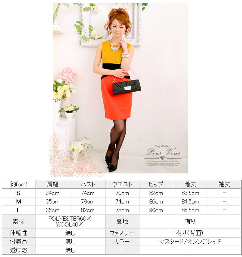 備考太陽光のような元気な印象を与えてくれる、マスタード×オレンジレッドのノースリーブスドレスです。