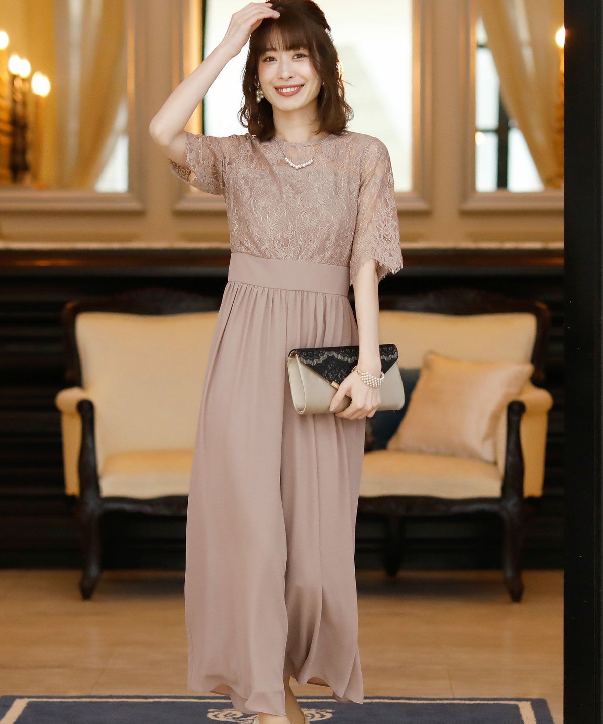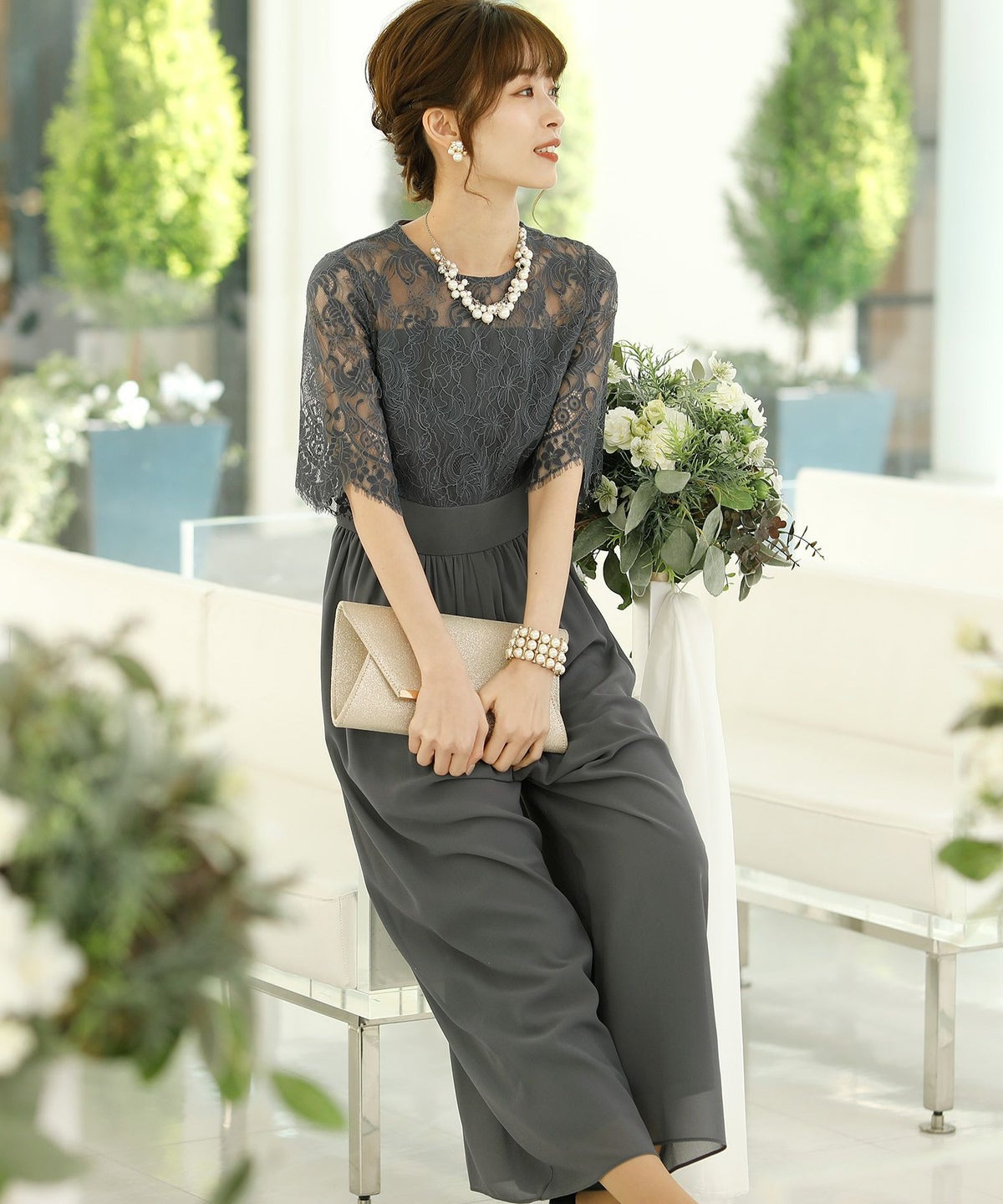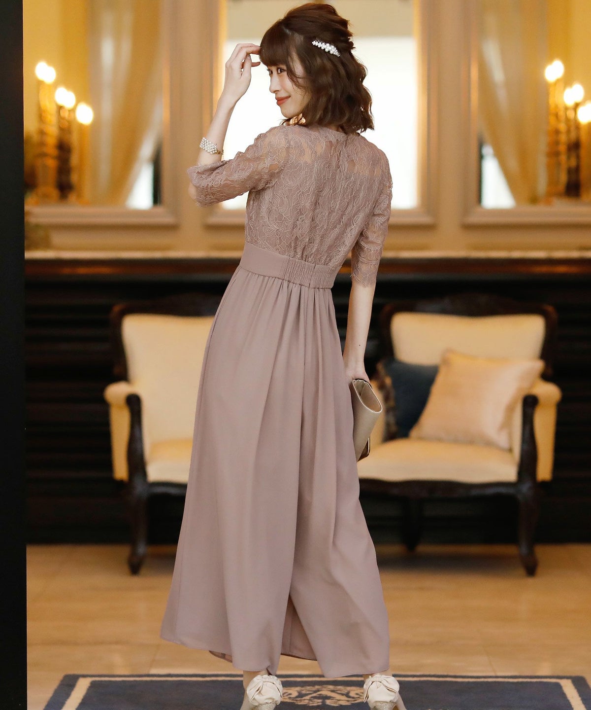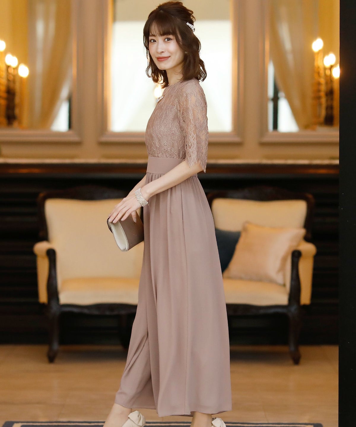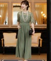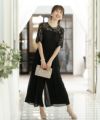 ★体型カバーポイント------------------------------------------------------------【二の腕】【脚】【ウエスト】【ヒップ】しっかりとしたレースの5分袖が綺麗に二の腕をカバー。ウエスト切り替えが高めなのでスタイルアップ効果もあります♪★クールに着こなせるレース×シフォンのパンツドレス♪------------------------------------------------------------縁取りに光沢感あるしっかりとしたレースがきちんとした雰囲気を高めてくれる一枚。ハイウエストなシルエットで女性らしさを出しつつ、抜け感あるクールな印象に仕上がっています。★さり気なく足元をカバーするワイドパンツ------------------------------------------------------------ギャザーが寄せられたウエスト周りがお腹周りやヒップをばっちり隠してカバー。足元をさり気なく隠しながら、シフォンがふわりと広がる様が美しいマキシ丈パンツです。★一枚で着られるオールインワン------------------------------------------------------------袖有りなので羽織物がなくても一枚でコーデが決まるのが嬉しいアイテム♪ウエスト背面はゴム仕様になっており、着用感も安心です。★素材感------------------------------------------------------------コードレースは縁取りにパールのような光沢感があり、しっかりとした生地感。シフォン生地はざらりとしたマット感ありつつ、柔らかです。★こんなシーンの利用にオススメ♪------------------------------------------------------------【結婚式】【二次会】【同窓会】【食事会】【発表会】でもご利用いただけます。