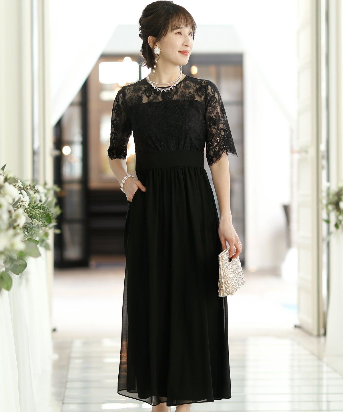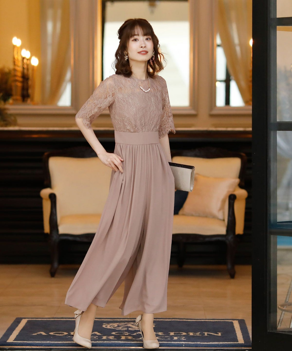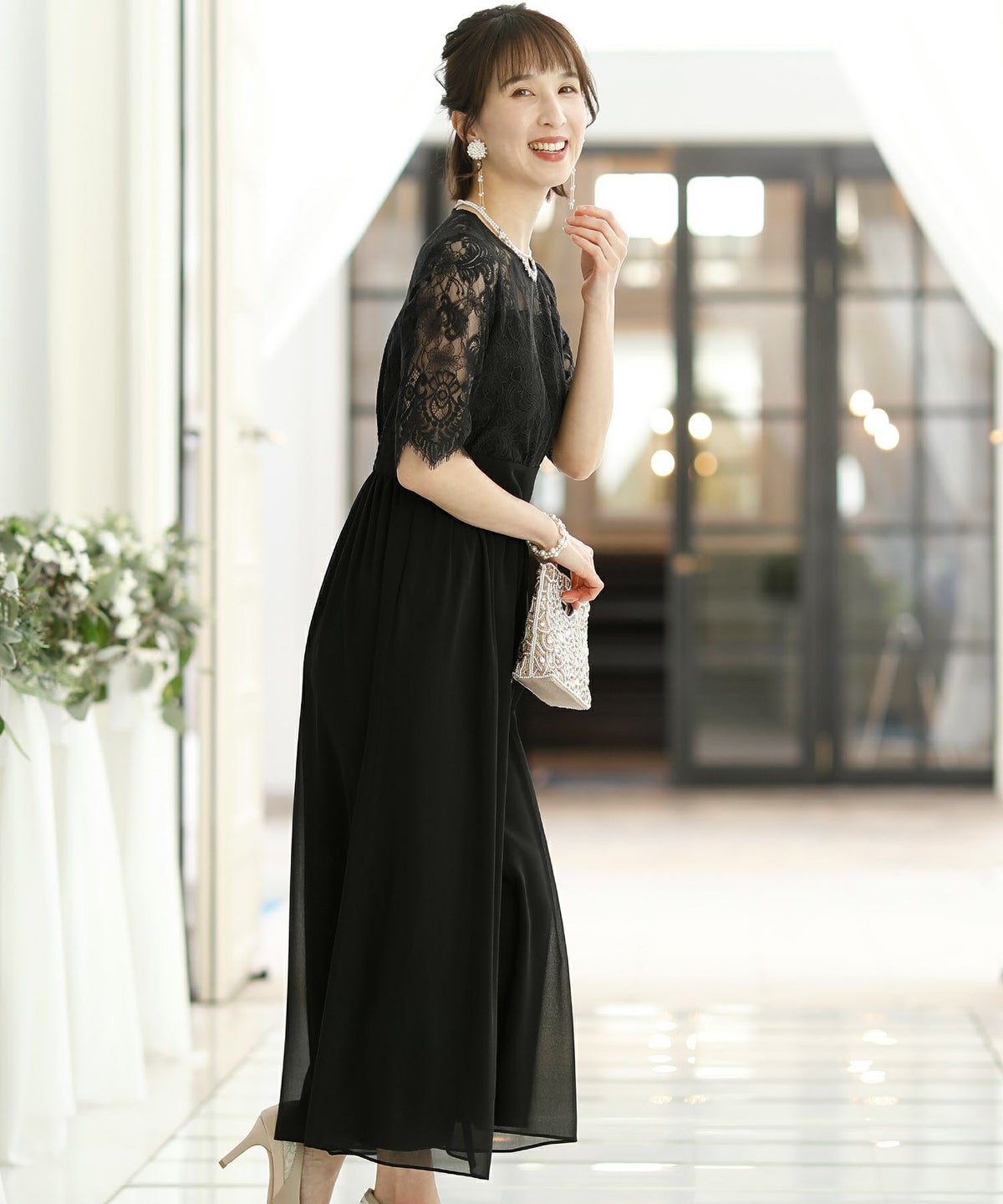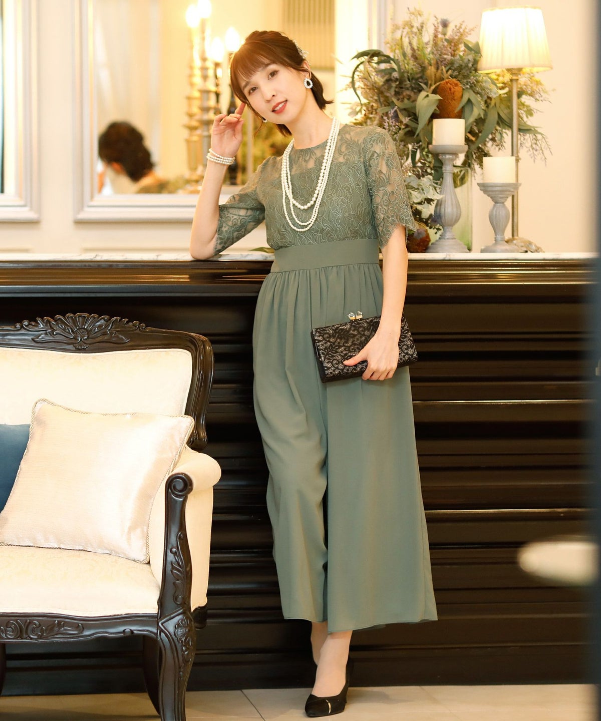 ★体型カバーポイント------------------------------------------------------------【二の腕】【脚】【ウエスト】【ヒップ】しっかりとしたレースの5分袖が綺麗に二の腕をカバー。ウエスト切り替えが高めなのでスタイルアップ効果もあります♪★クールに着こなせるレース×シフォンのパンツドレス♪------------------------------------------------------------縁取りに光沢感あるしっかりとしたレースがきちんとした雰囲気を高めてくれる一枚。ハイウエストなシルエットで女性らしさを出しつつ、抜け感あるクールな印象に仕上がっています。★さり気なく足元をカバーするワイドパンツ------------------------------------------------------------ギャザーが寄せられたウエスト周りがお腹周りやヒップをばっちり隠してカバー。足元をさり気なく隠しながら、シフォンがふわりと広がる様が美しいマキシ丈パンツです。★一枚で着られるオールインワン------------------------------------------------------------袖有りなので羽織物がなくても一枚でコーデが決まるのが嬉しいアイテム♪ウエスト背面はゴム仕様になっており、着用感も安心です。★素材感------------------------------------------------------------コードレースは縁取りにパールのような光沢感があり、しっかりとした生地感。シフォン生地はざらりとしたマット感ありつつ、柔らかです。★こんなシーンの利用にオススメ♪------------------------------------------------------------【結婚式】【二次会】【同窓会】【食事会】【発表会】でもご利用いただけます。