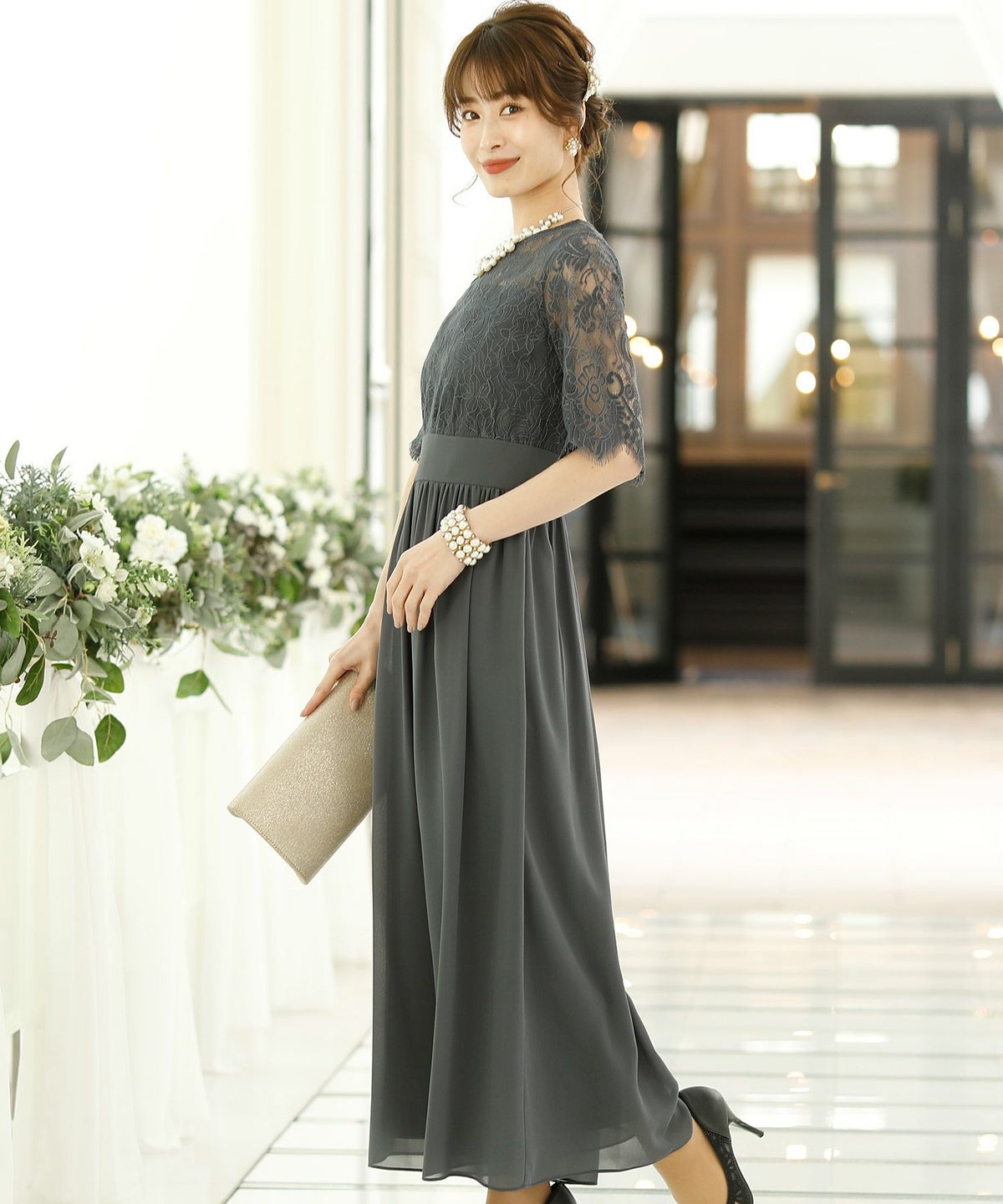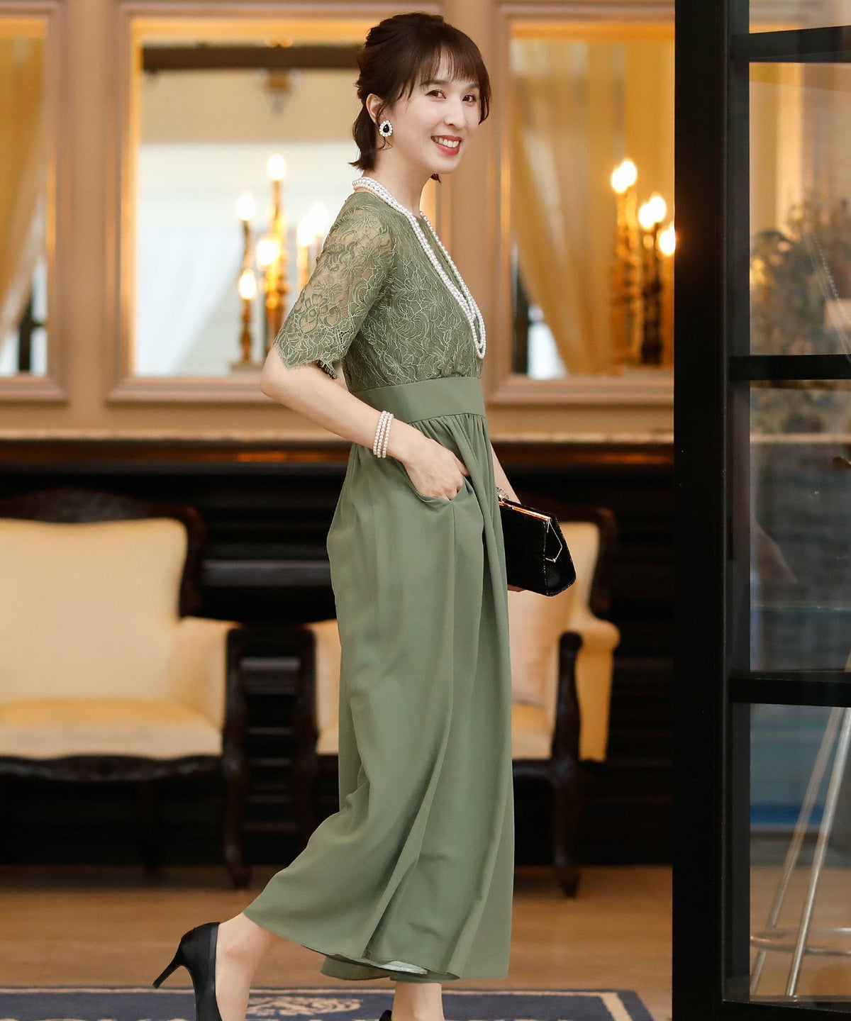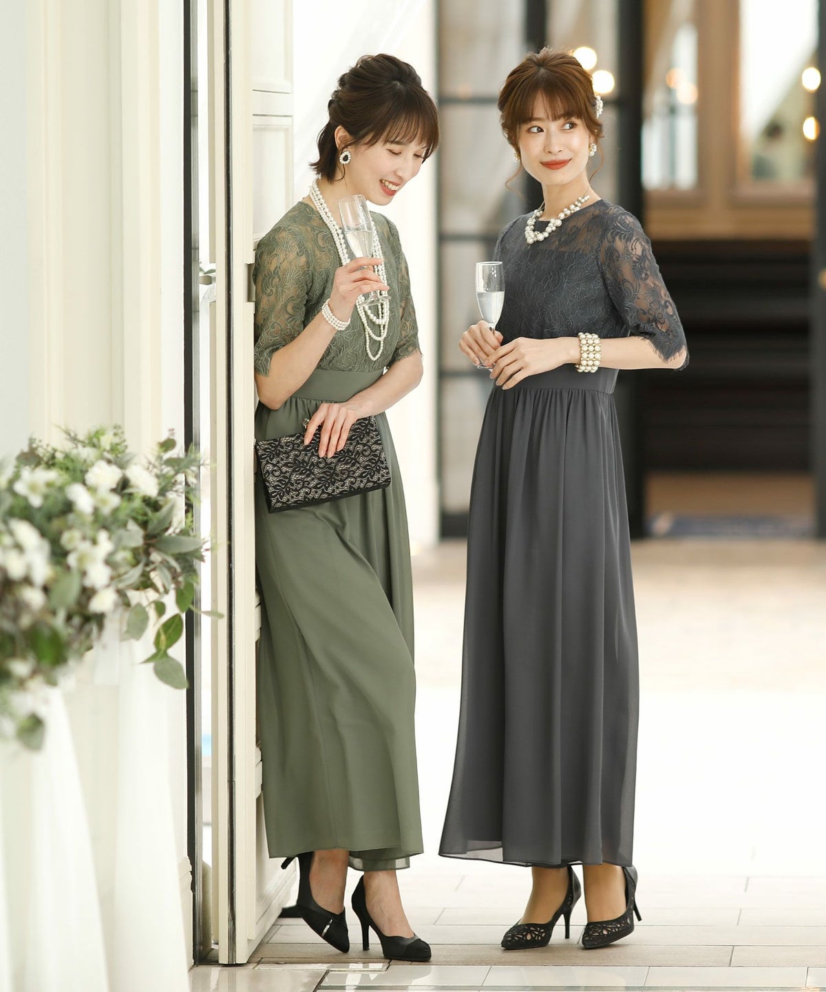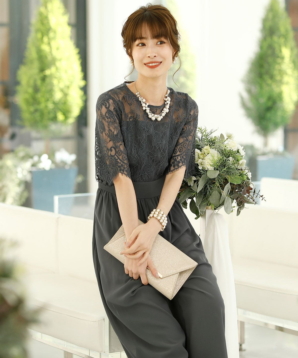 ★体型カバーポイント------------------------------------------------------------【二の腕】【脚】【ウエスト】【ヒップ】しっかりとしたレースの5分袖が綺麗に二の腕をカバー。ウエスト切り替えが高めなのでスタイルアップ効果もあります♪★クールに着こなせるレース×シフォンのパンツドレス♪------------------------------------------------------------縁取りに光沢感あるしっかりとしたレースがきちんとした雰囲気を高めてくれる一枚。ハイウエストなシルエットで女性らしさを出しつつ、抜け感あるクールな印象に仕上がっています。★さり気なく足元をカバーするワイドパンツ------------------------------------------------------------ギャザーが寄せられたウエスト周りがお腹周りやヒップをばっちり隠してカバー。足元をさり気なく隠しながら、シフォンがふわりと広がる様が美しいマキシ丈パンツです。★一枚で着られるオールインワン------------------------------------------------------------袖有りなので羽織物がなくても一枚でコーデが決まるのが嬉しいアイテム♪ウエスト背面はゴム仕様になっており、着用感も安心です。★素材感------------------------------------------------------------コードレースは縁取りにパールのような光沢感があり、しっかりとした生地感。シフォン生地はざらりとしたマット感ありつつ、柔らかです。★こんなシーンの利用にオススメ♪------------------------------------------------------------【結婚式】【二次会】【同窓会】【食事会】【発表会】でもご利用いただけます。