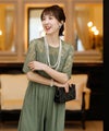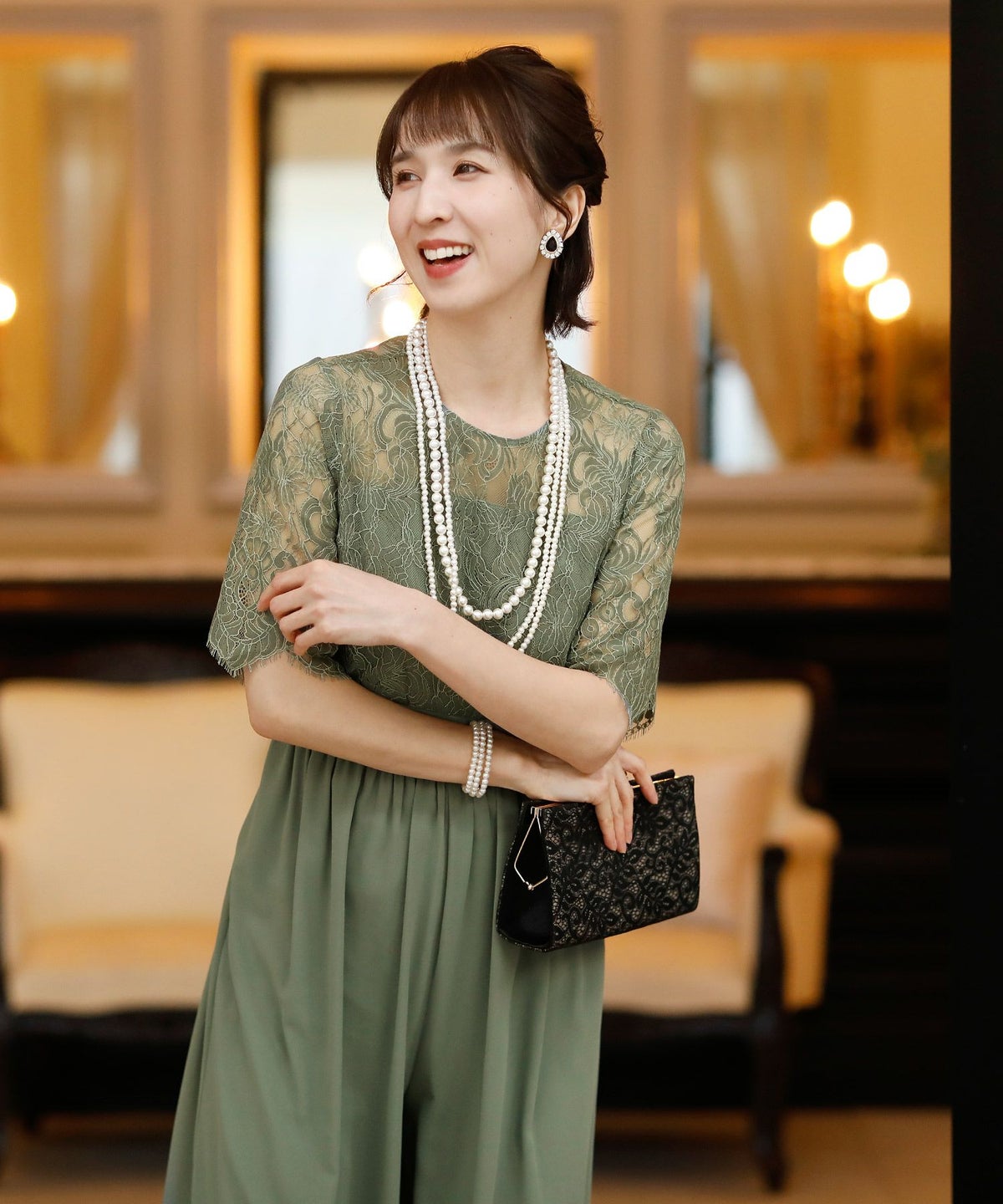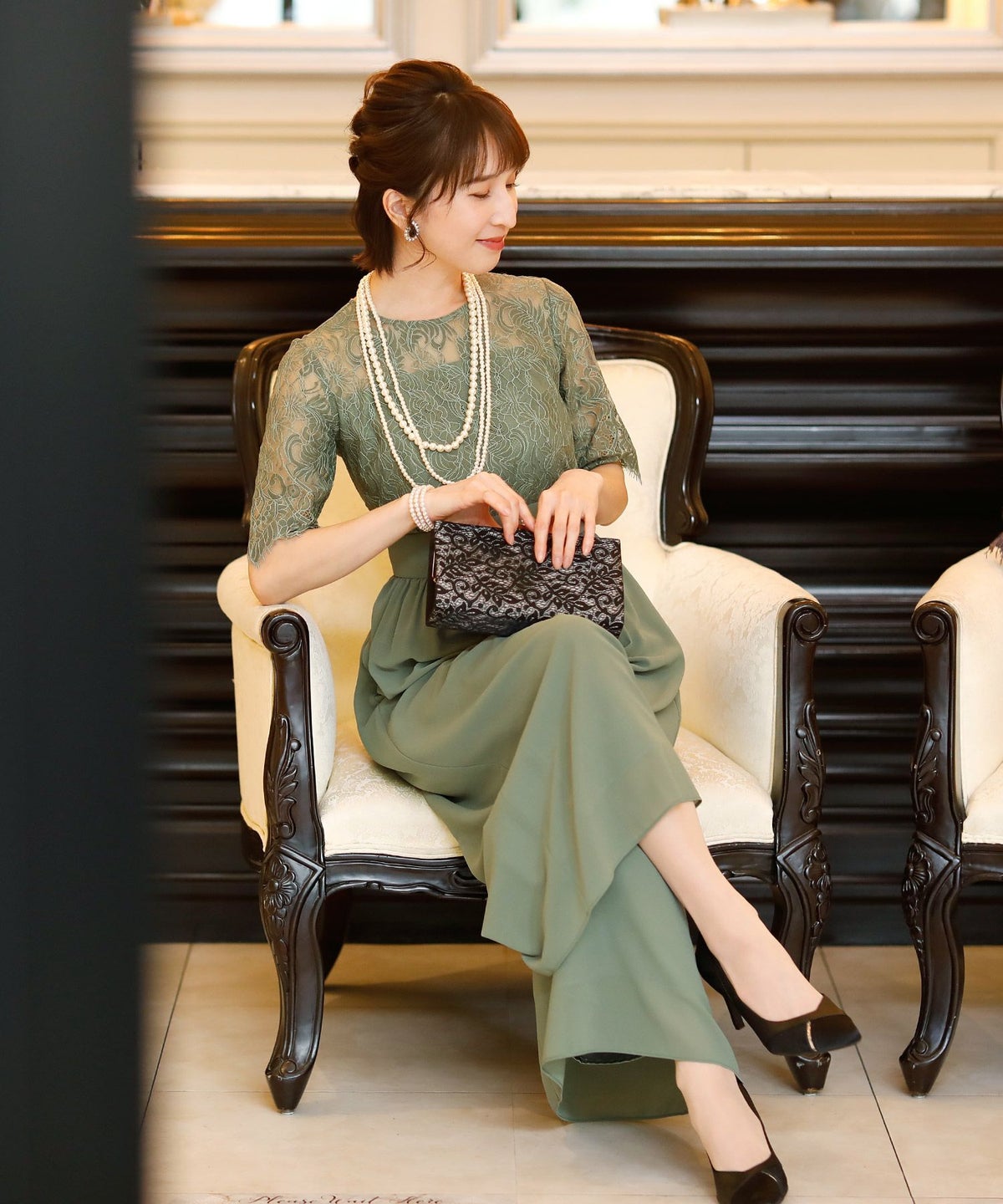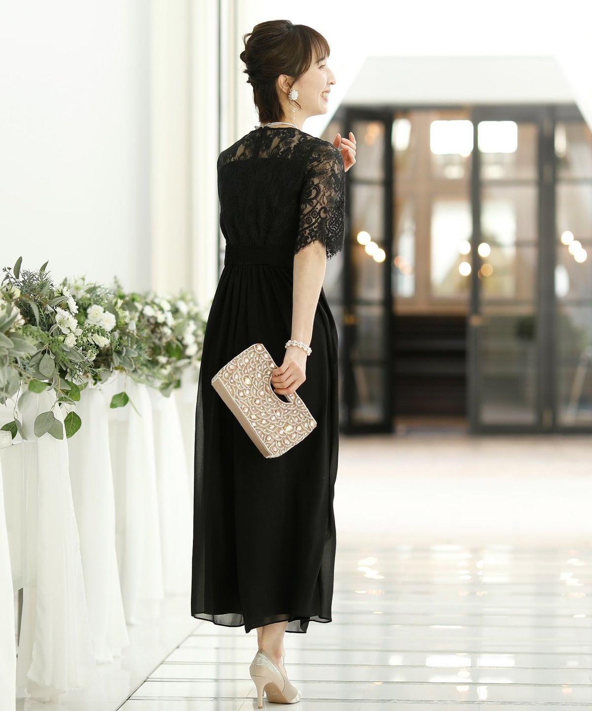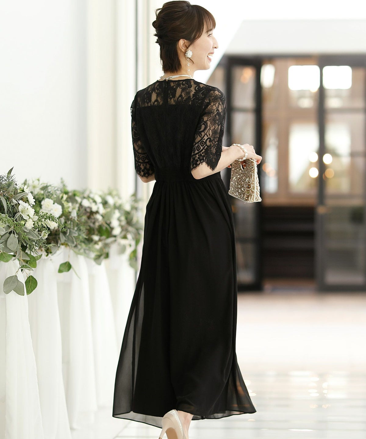 ★体型カバーポイント------------------------------------------------------------【二の腕】【脚】【ウエスト】【ヒップ】しっかりとしたレースの5分袖が綺麗に二の腕をカバー。ウエスト切り替えが高めなのでスタイルアップ効果もあります♪★クールに着こなせるレース×シフォンのパンツドレス♪------------------------------------------------------------縁取りに光沢感あるしっかりとしたレースがきちんとした雰囲気を高めてくれる一枚。ハイウエストなシルエットで女性らしさを出しつつ、抜け感あるクールな印象に仕上がっています。★さり気なく足元をカバーするワイドパンツ------------------------------------------------------------ギャザーが寄せられたウエスト周りがお腹周りやヒップをばっちり隠してカバー。足元をさり気なく隠しながら、シフォンがふわりと広がる様が美しいマキシ丈パンツです。★一枚で着られるオールインワン------------------------------------------------------------袖有りなので羽織物がなくても一枚でコーデが決まるのが嬉しいアイテム♪ウエスト背面はゴム仕様になっており、着用感も安心です。★素材感------------------------------------------------------------コードレースは縁取りにパールのような光沢感があり、しっかりとした生地感。シフォン生地はざらりとしたマット感ありつつ、柔らかです。★こんなシーンの利用にオススメ♪------------------------------------------------------------【結婚式】【二次会】【同窓会】【食事会】【発表会】でもご利用いただけます。