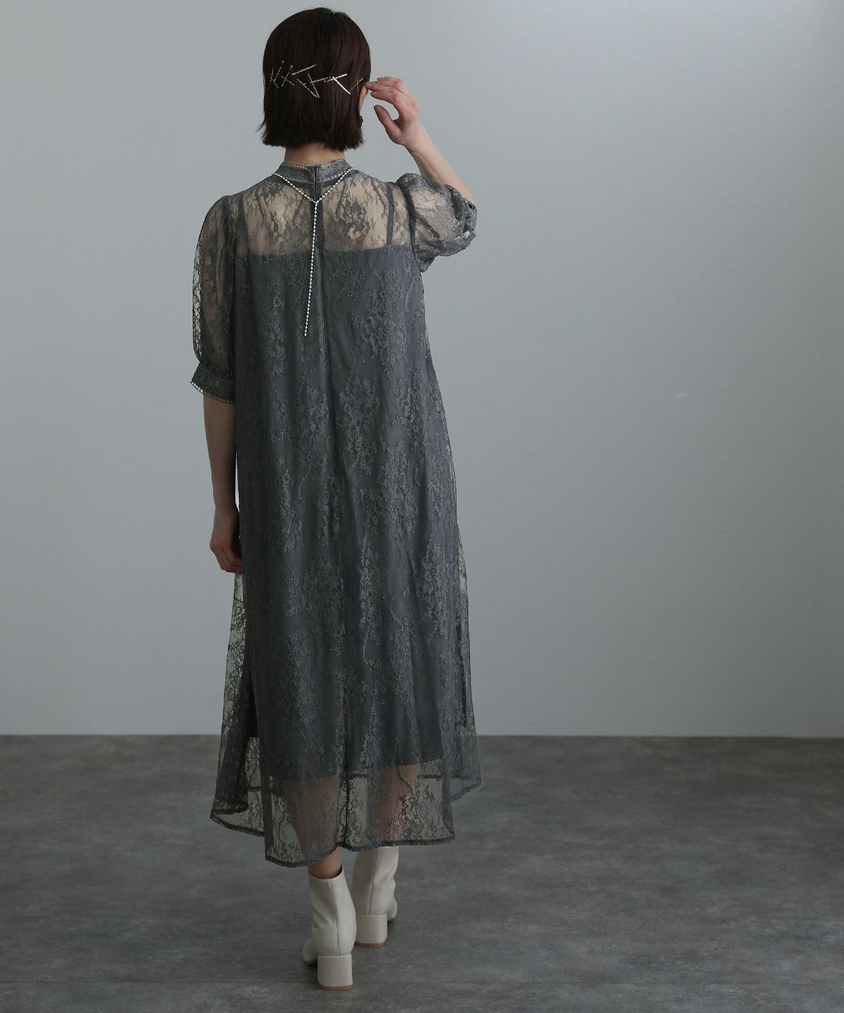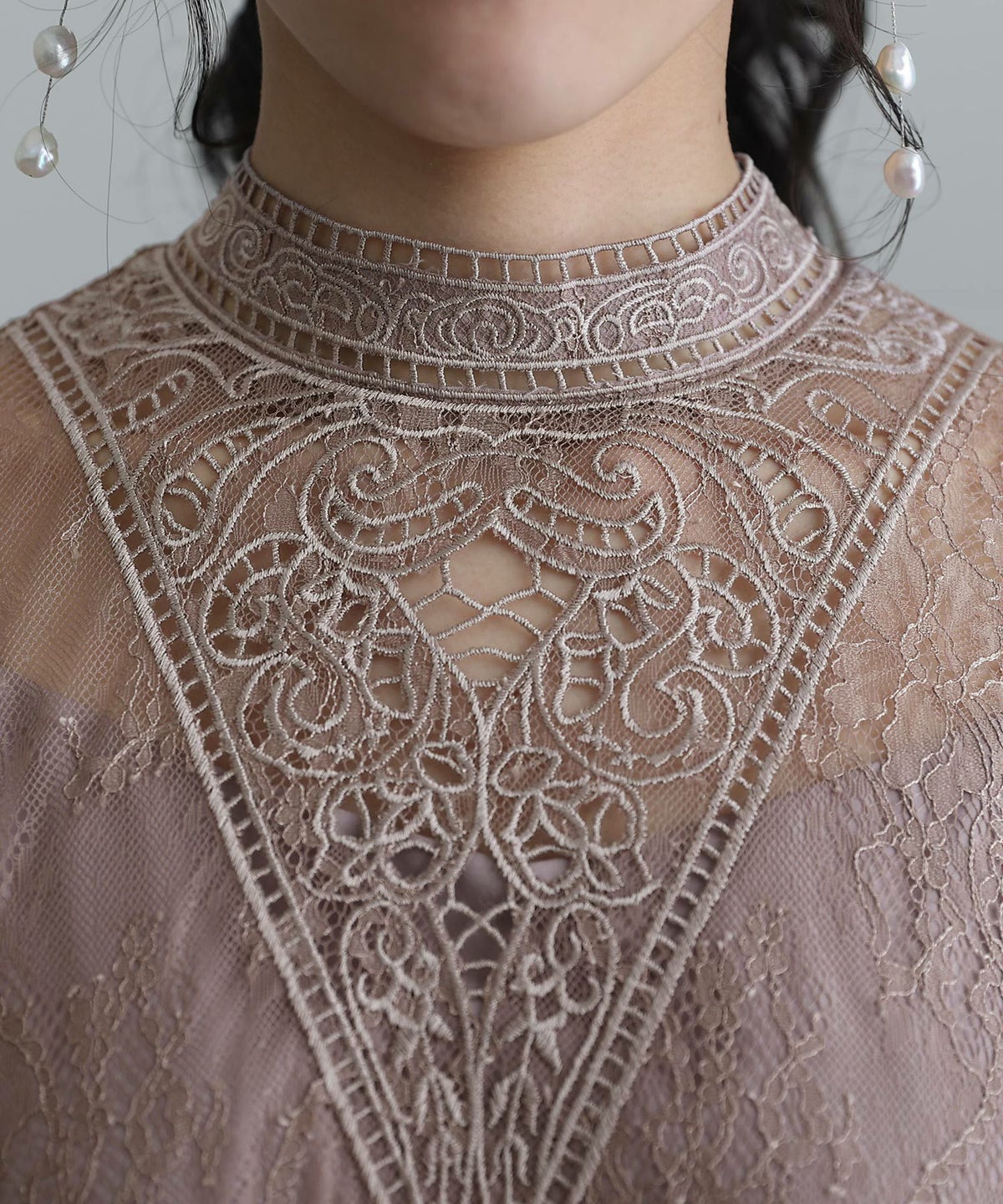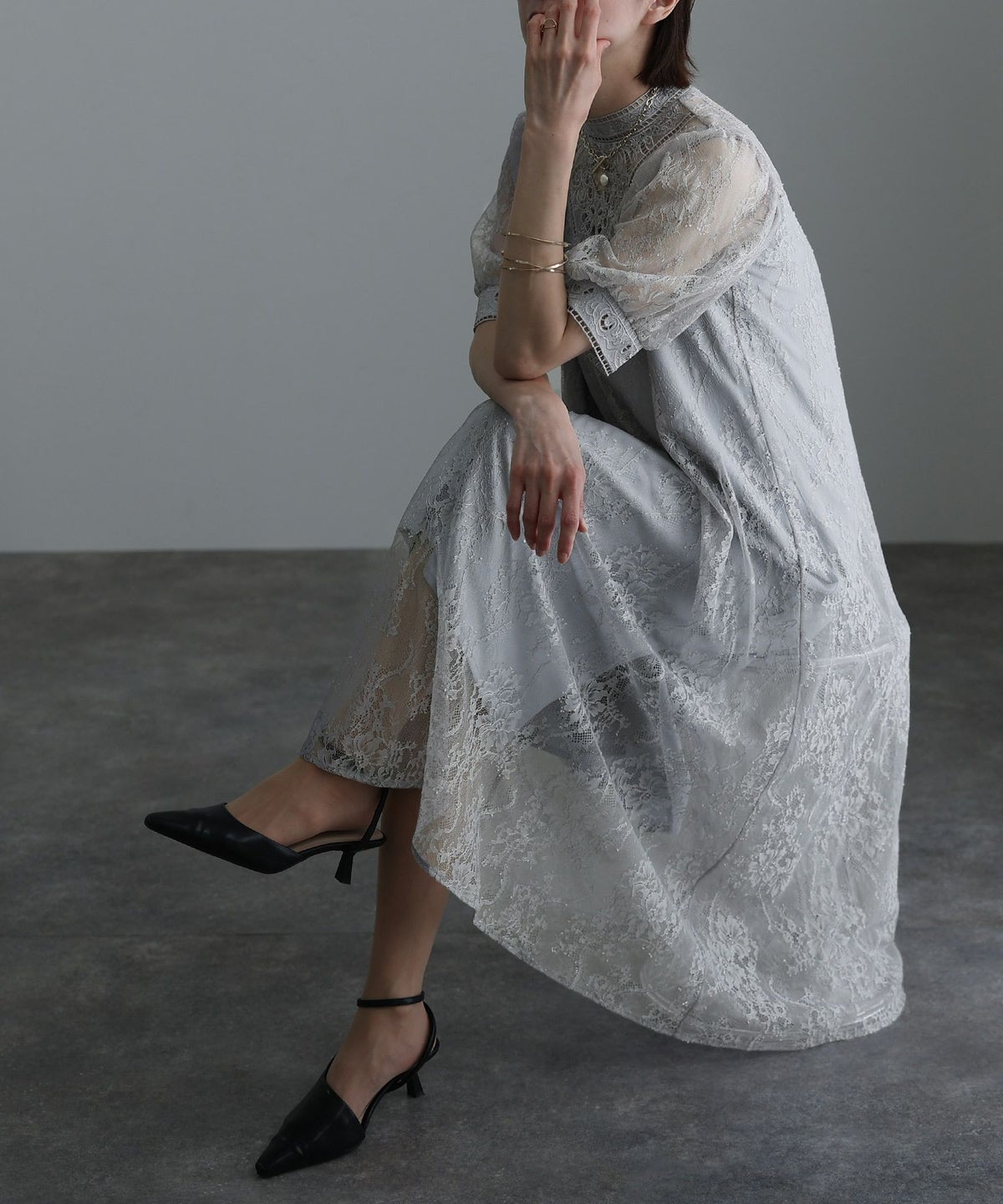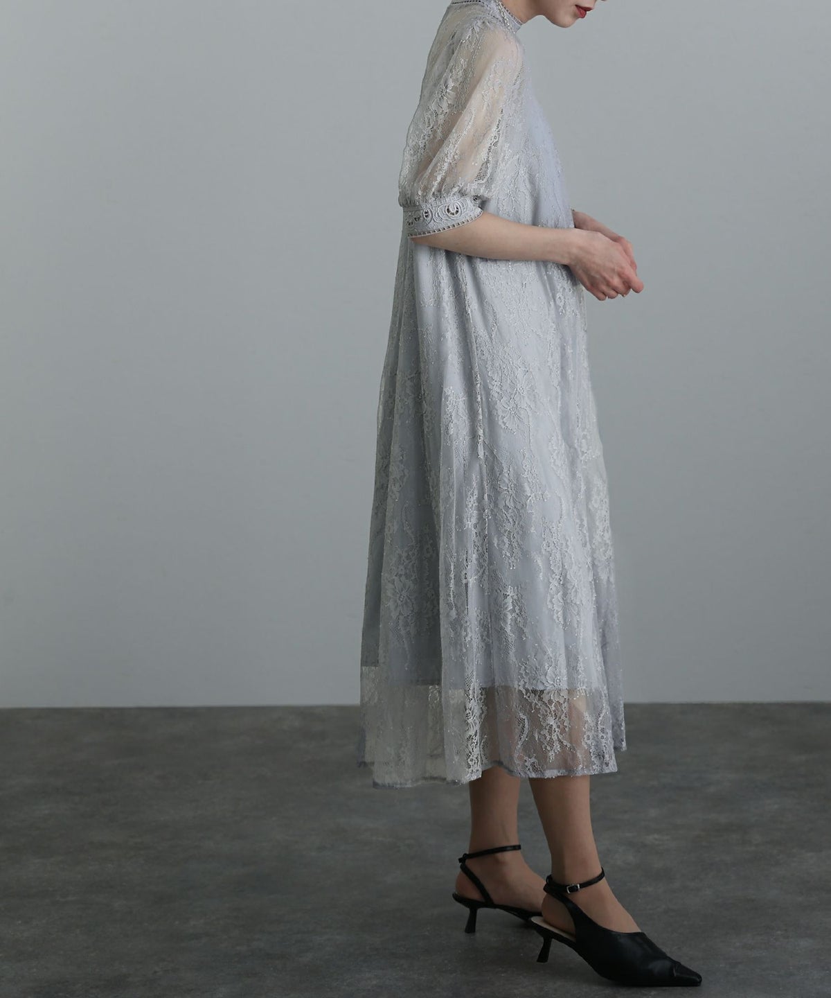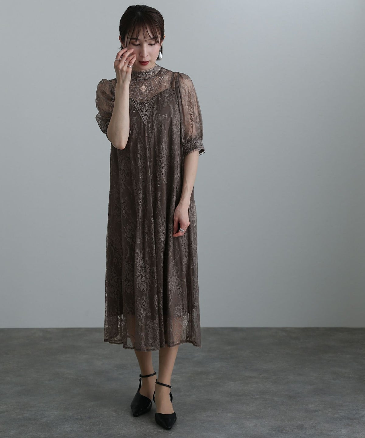 ■ケミカルレース×テントライン胸元、首元、袖口に施されたケミカルレースがクラシカルな一着。ハイネックデザインがエレガントでお洒落なアクセントに。ふんわり透け感のあるレースの袖が女性らしさを演出してくれます。 スカートのレースで足首が少し透け、上品に可愛らしい。 ■楽に着れて可愛いシルエット体型カバーポイント:【二の腕】【脚】【ウエスト】【ヒップ】テントラインのため、体型を気にすることなく着用できます。ハイネックで顔周りをすっきり美しく魅せてくれます。 ■ふんわり広がる透け感レース透け感のあるレースが軽く涼し気な印象に。 ■おすすめ着用シーン【結婚式】【二次会】【同窓会】【食事会】【セレモニー】【発表会】【オフィス】【デイリー】にご利用いただけます。