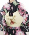 薄いベージュの帯が黒地の浴衣に映えます。