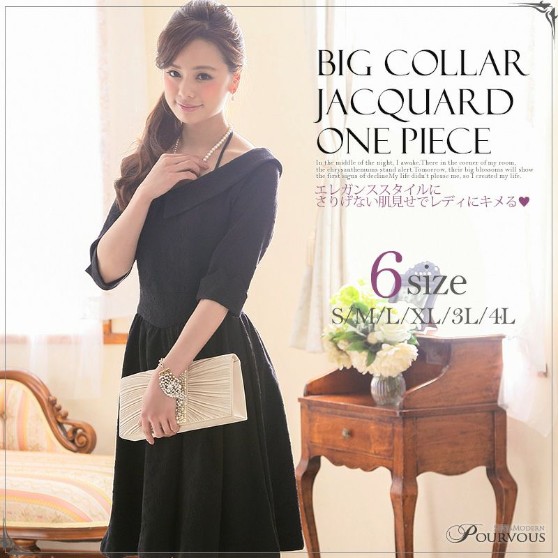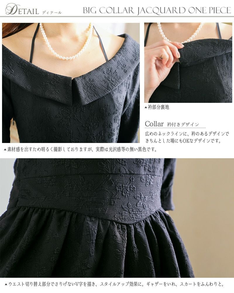 ワンピース 結婚式 ドレス 披露宴 フォーマル パーティー ビッグカラー ジャカード ワンピース 花柄模様 黒
