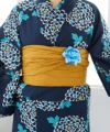 くしゅくしゅした素材のマスタードイエローの帯は、アレンジ自在の可愛い兵児帯となっています♪