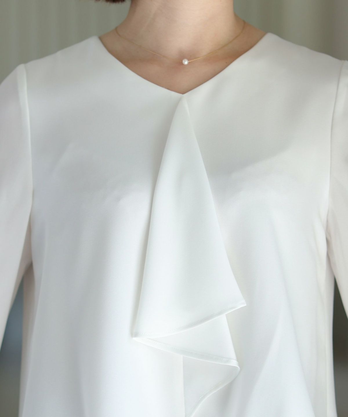 ■女性らしさと知的な印象を与えるブラウスほどよい透け感が上品さを演出。Vネックの首回りで顔周りもすっきり見えます。