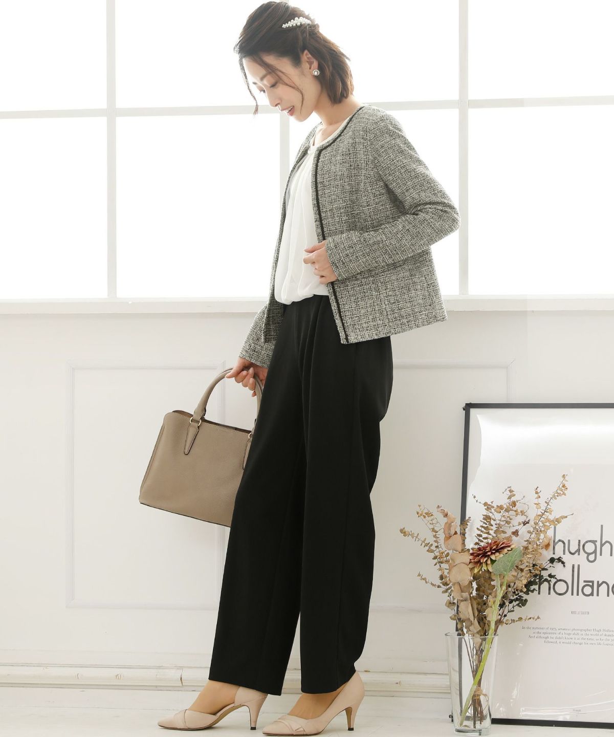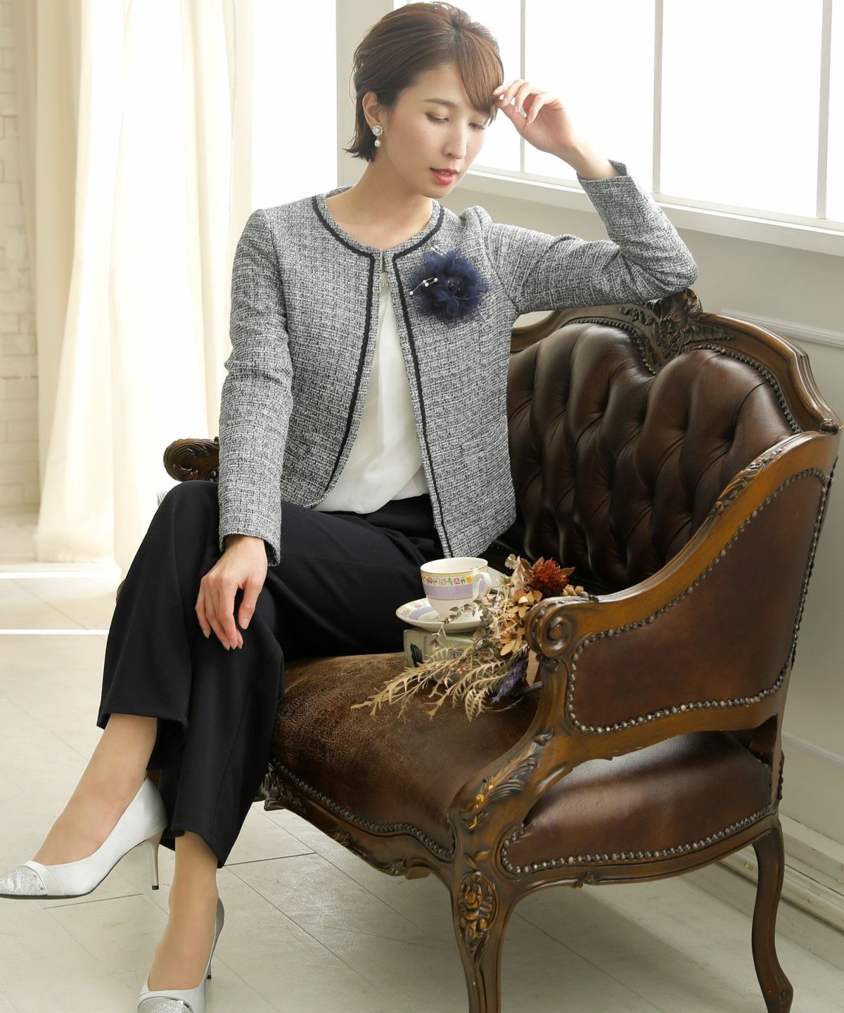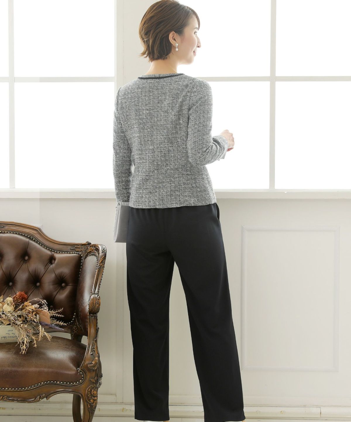 ツイードのノーカラージャケットとブラウス・パンツのスーツ3点セット。
