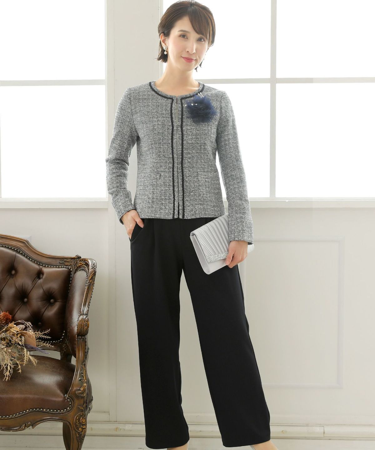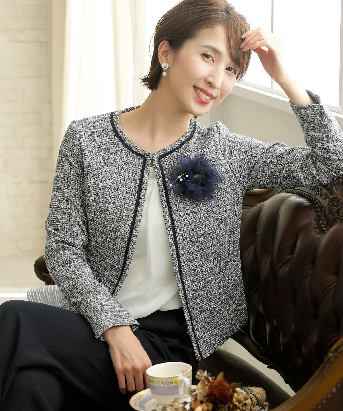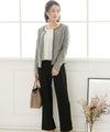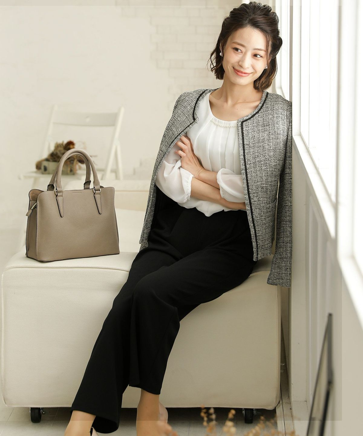 ツイードのノーカラージャケットとブラウス・パンツのスーツ3点セット。