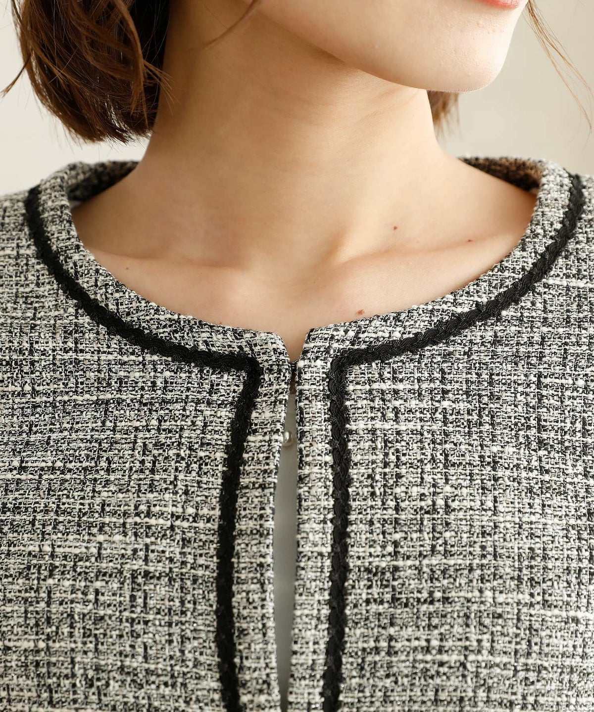 ラメを織り込んだミックスツイードのノーカラージャケット。