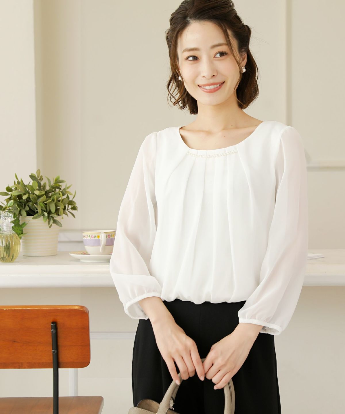 ブラウスはタックが華やかなデザインで、デコルテ部分にはパールがあしらわれています。