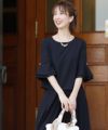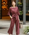 ワイドパンツなのでスタイリッシュでクールな印象に。さらに5分丈袖で二の腕をカバー♪