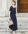 キーネックデザインが今っぽいオシャレなセットアップ。アクセントのゴールドバーが付いているので、アクセサリーなしでも◎