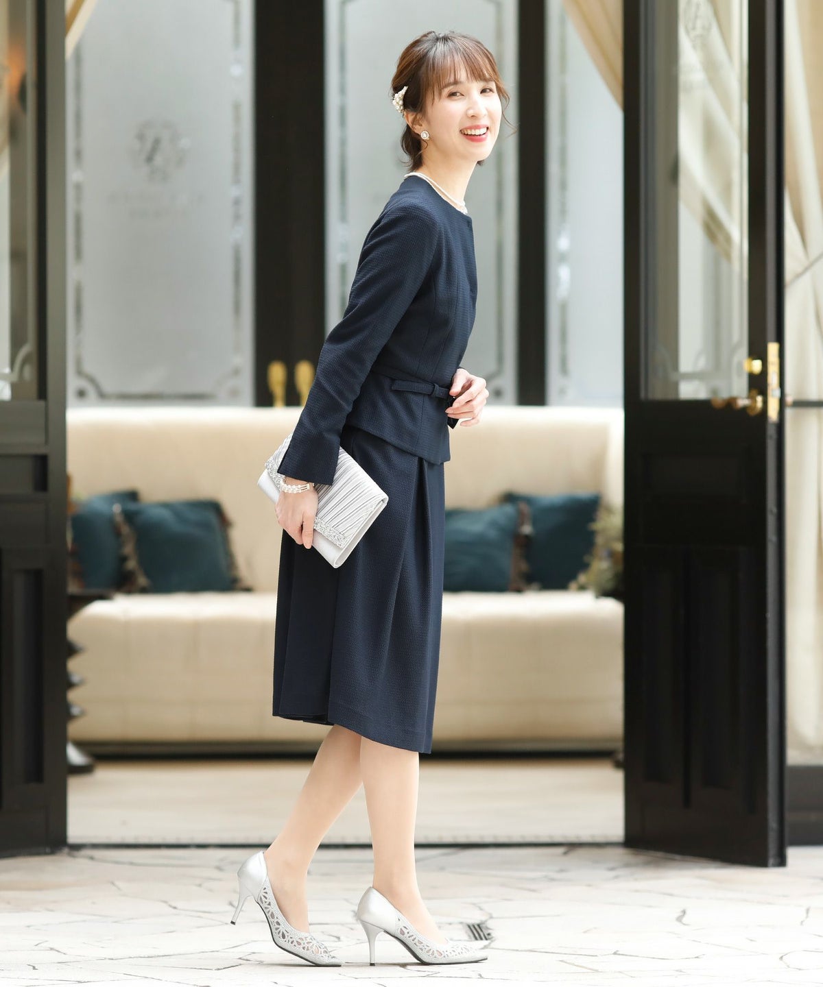★体型カバーポイント------------------------------------------------------------【二の腕】【脚】【ウエスト】【ヒップ】ジャケットのペプラムデザインがウエストとヒップをさり気なくカバーしてくれる嬉しいスーツセット♪★軽くストレッチの効いたスーツセット------------------------------------------------------------ありそうでなかった、軽くストレッチの効いたカロリーナニットを使用したスーツ。スッキリとしたノーカラージャケットはペプラムデザインが可愛い作りに。★細見え叶うウエストベルト付き------------------------------------------------------------ウエストベルトで細見せが叶い、ペプラムの広がりがラインをキュッと引き締めて見せてくれます。高めにウエストマークすることでスタイルアップ&脚長効果もあり♪★フィット&フレアワンピースでフェミニンに------------------------------------------------------------ハイウエスト切り替えで美ライン見えする女性らしいワンピース。スカートはウエストのリボンからタックを入れて裾にボリュームを出しているので、歩くたび揺れて可愛い♪★素材感------------------------------------------------------------ワッフル生地のようなデザインが可愛いカロリーナニットを使用。軽く、やや伸縮性あるストレッチ生地感が特徴です。★こんなシーンの利用にオススメ♪------------------------------------------------------------【結婚式】【二次会】【同窓会】【食事会】【セレモニー】【発表会】【オフィス】でもご利用いただけます。