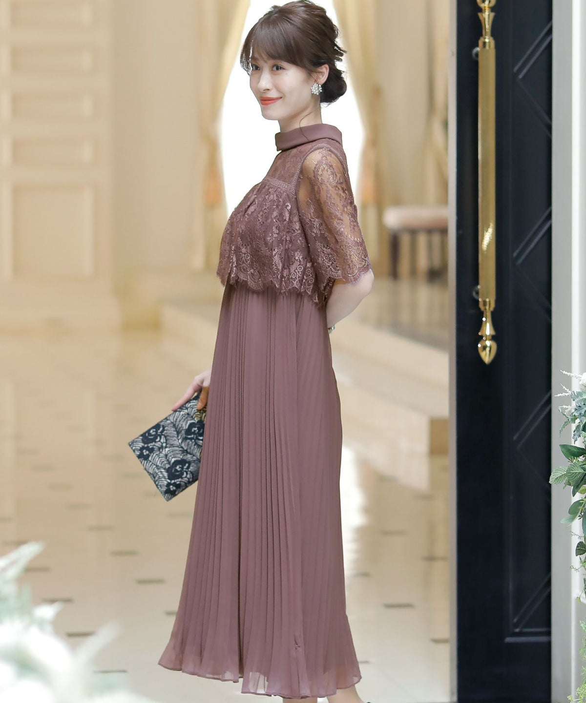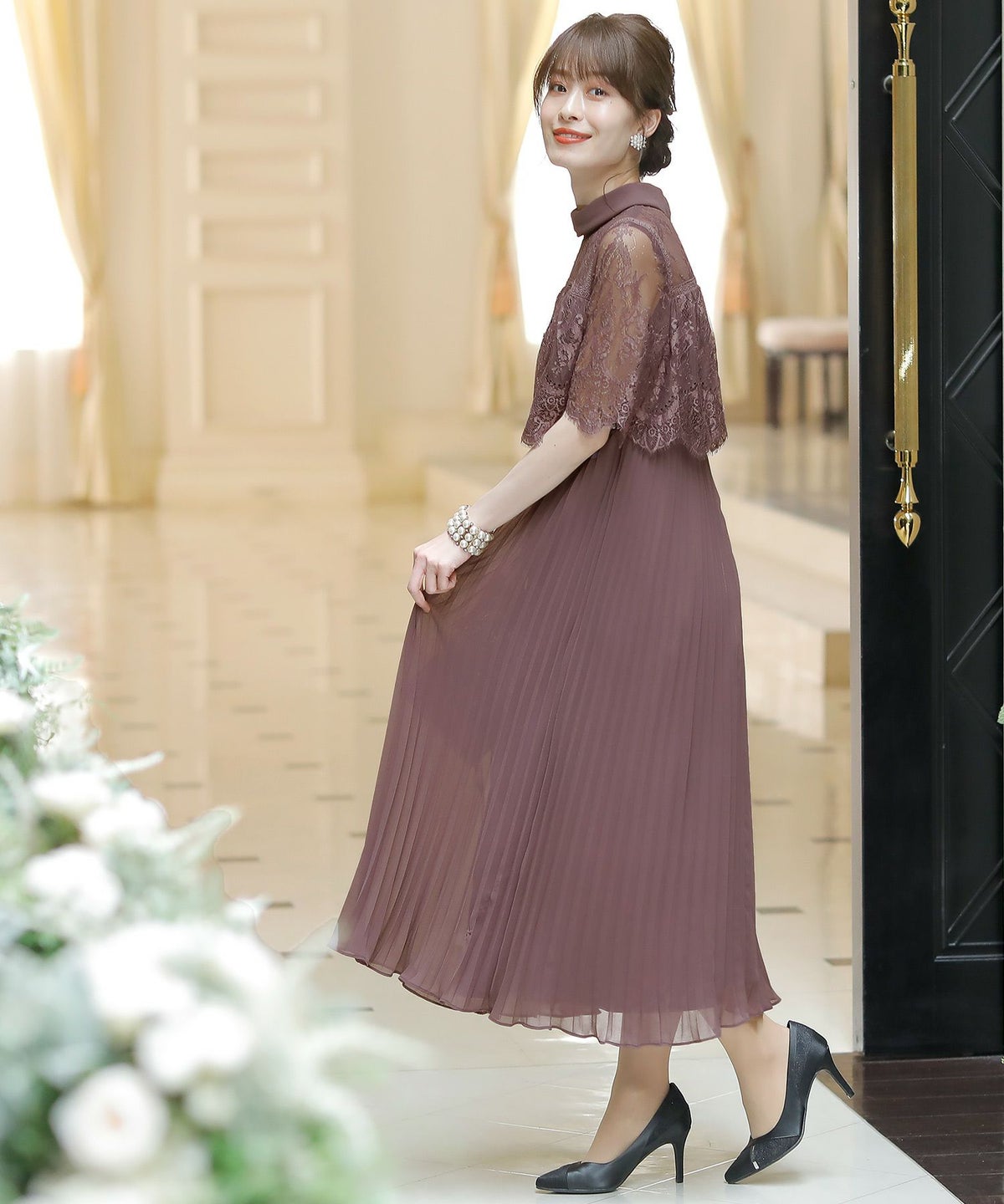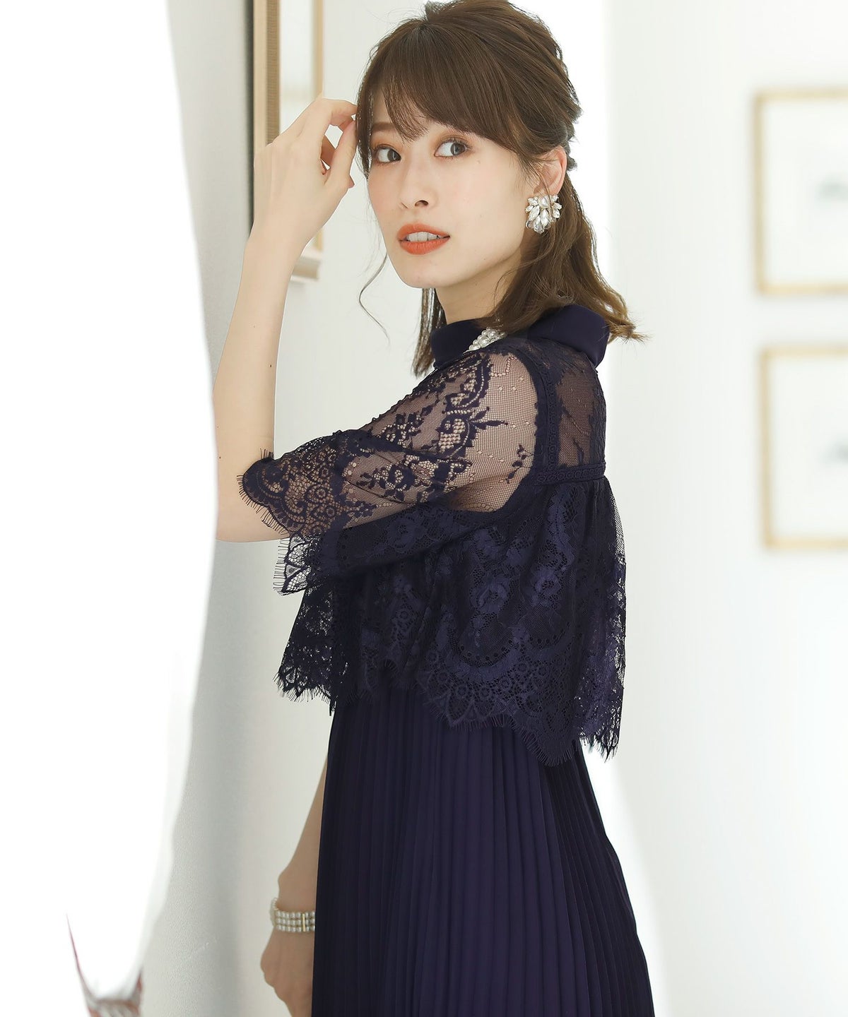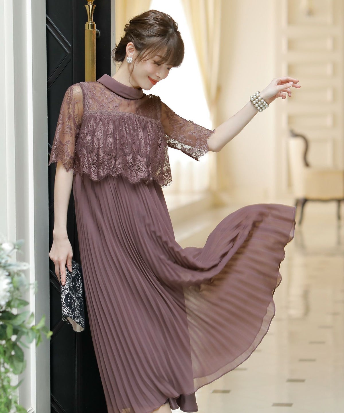 ★体型カバーポイント------------------------------------------------------------【二の腕】【脚】【ウエスト】【ヒップ】プリーツスカートでウエスト周りやお尻をカバー。繊細なレースが二の腕を隠してくれます。★ジョーゼットプリーツ加工デザインと繊細なレース------------------------------------------------------------派手過ぎないレースとプリーツの組み合わせが綺麗なドレス。折り返しハイネックで女性らしさと肩の透け感が詰まり過ぎないデザインに★★上品&体型カバー叶える技ありドレス------------------------------------------------------------ウエスト切り替えを高めにし、脚長効果は間違いなし。ペプラムデザインで気になるお腹周りを隠し、体型カバーしながら綺麗なシルエットに。★少し長めな丈でスタイリッシュに見えるデザイン------------------------------------------------------------ロング丈プリーツスカートが歩くたびふわりと広がり、とても優雅な印象です。後ろ切替でどこから見ても美しいデザインに仕上げました。★素材感------------------------------------------------------------ジョーゼット生地と繊細なレースの組み合わせ。★こんなシーンの利用にオススメ♪------------------------------------------------------------【結婚式】【二次会】【同窓会】【食事会】【セレモニー】【発表会】でもご利用いただけます。