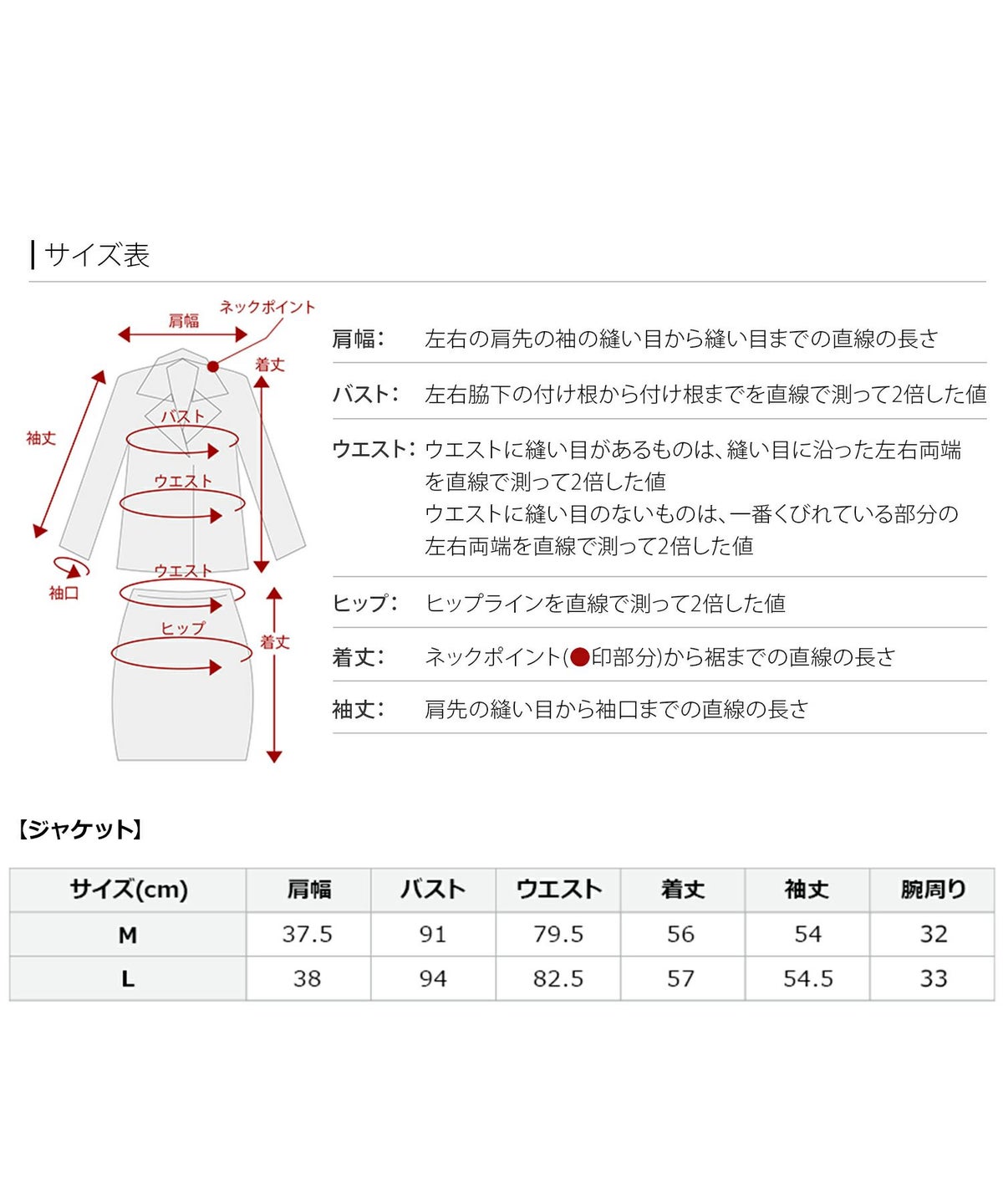 サイズ(cm)肩幅バストウエスト着丈袖丈腕周り