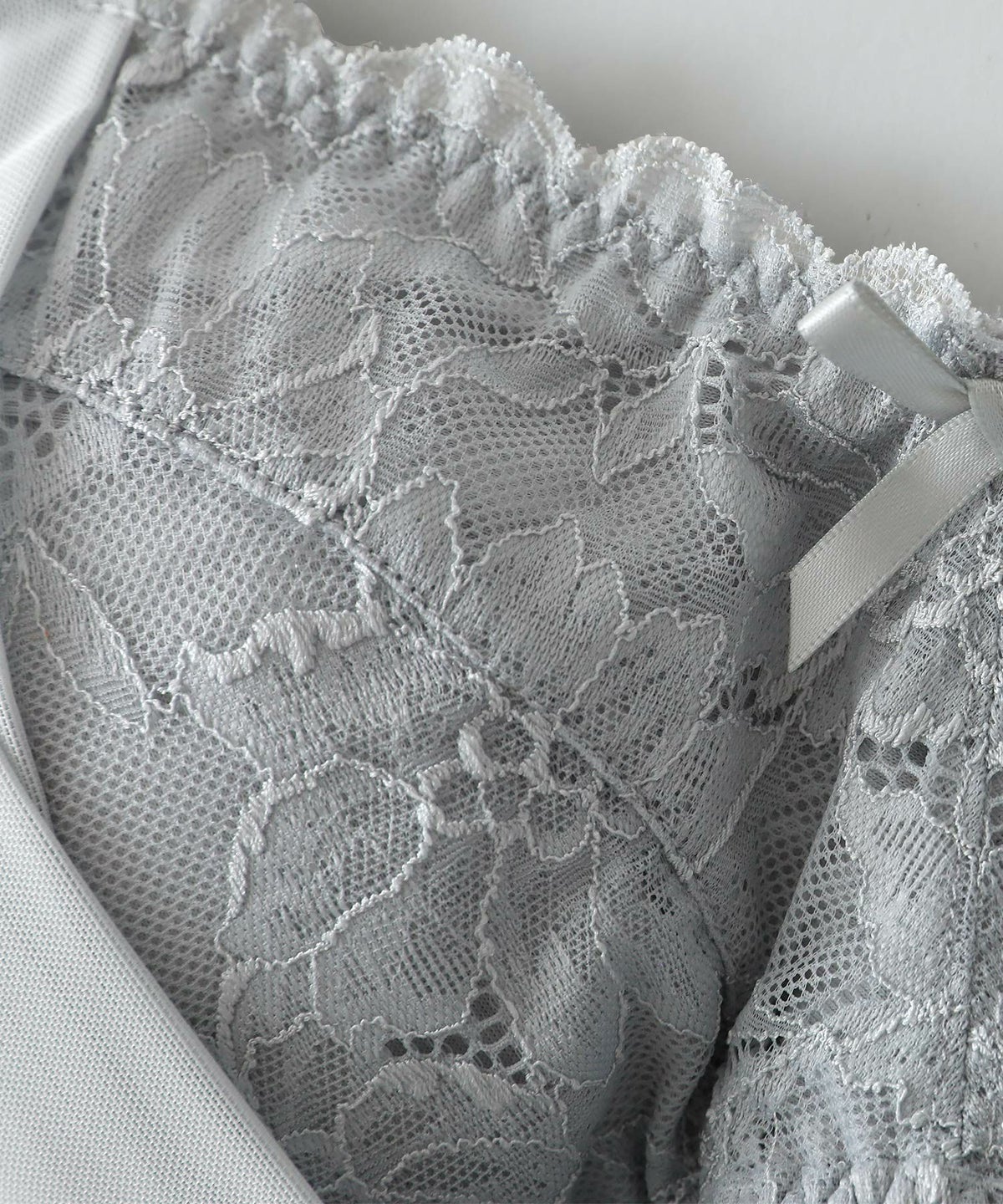フリルレースが可愛く、背面やフロントホック部はストレッチの効いた心地いい生地感。