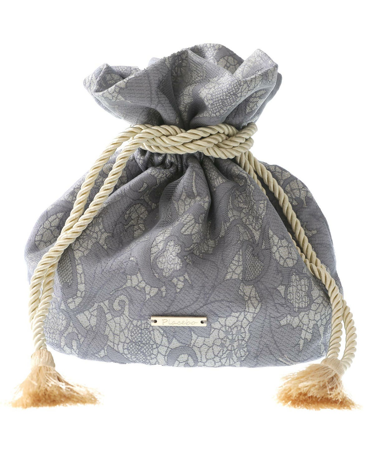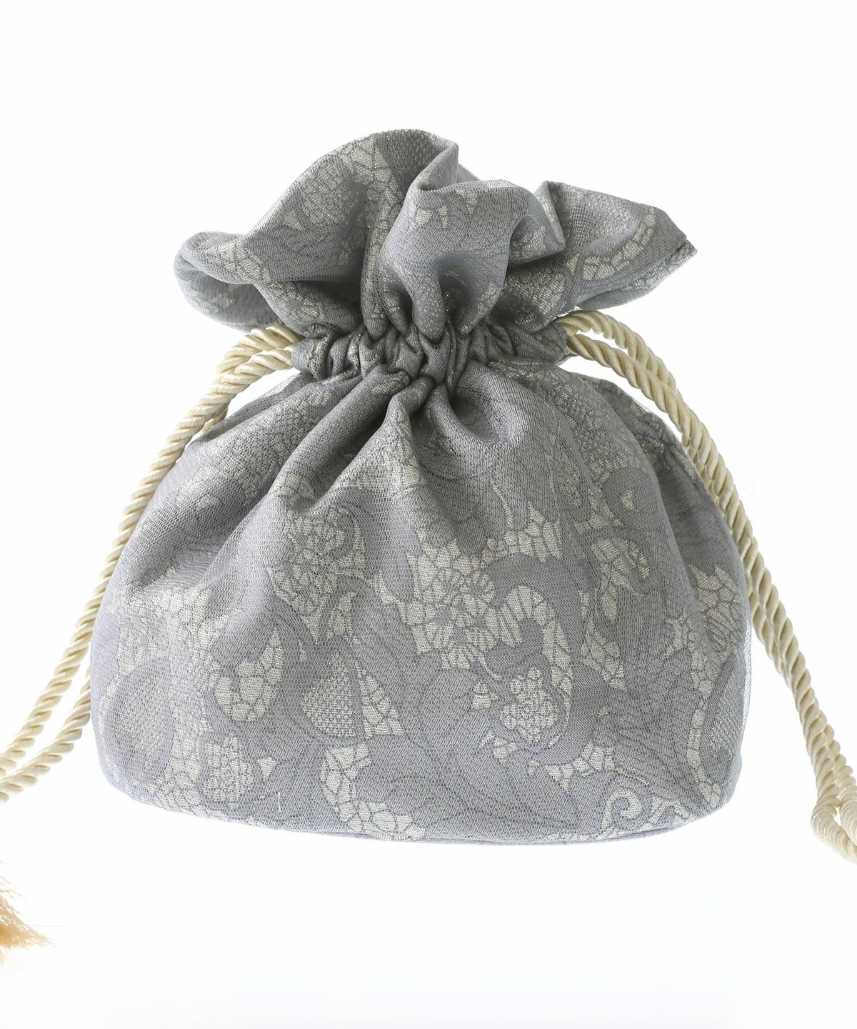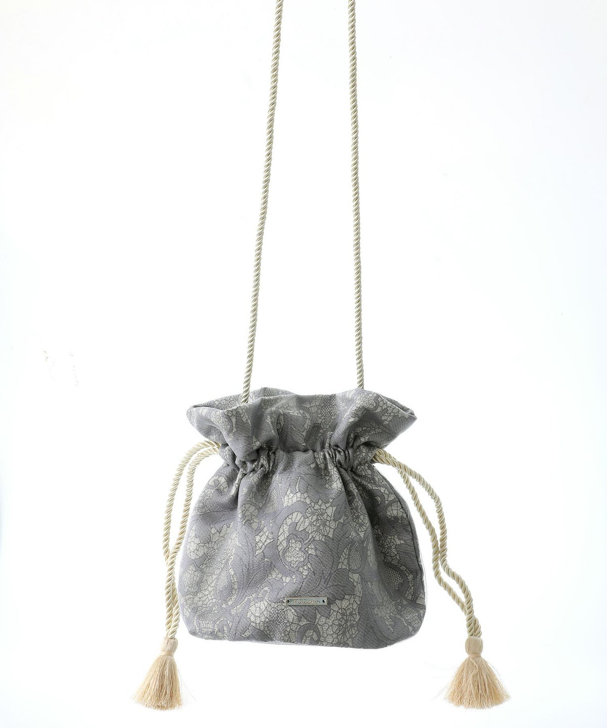 ★ラメジャガードにチュールを重ねた上品な巾着バッグ------------------------------------------------------------チュールを重ねることで控えめに煌めくラメジャガードが上品なデザイン。タッセル付きのロープ紐がエレガントな雰囲気を高めます。★ロープショルダーがかわいい------------------------------------------------------------光沢あるロープショルダーが可愛いアイテム。中はサテン地を使用し、開けた際にも高級感損なわない作りに。★素材感------------------------------------------------------------ラメを織り込んだボタニカル調のジャガード生地に繊細なチュールを重ねています。