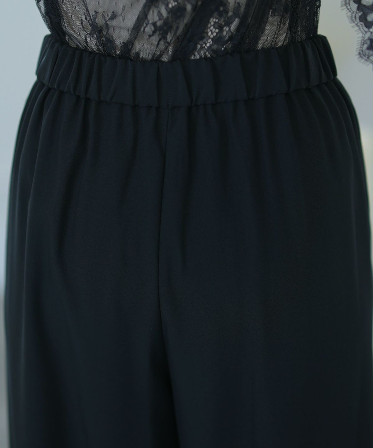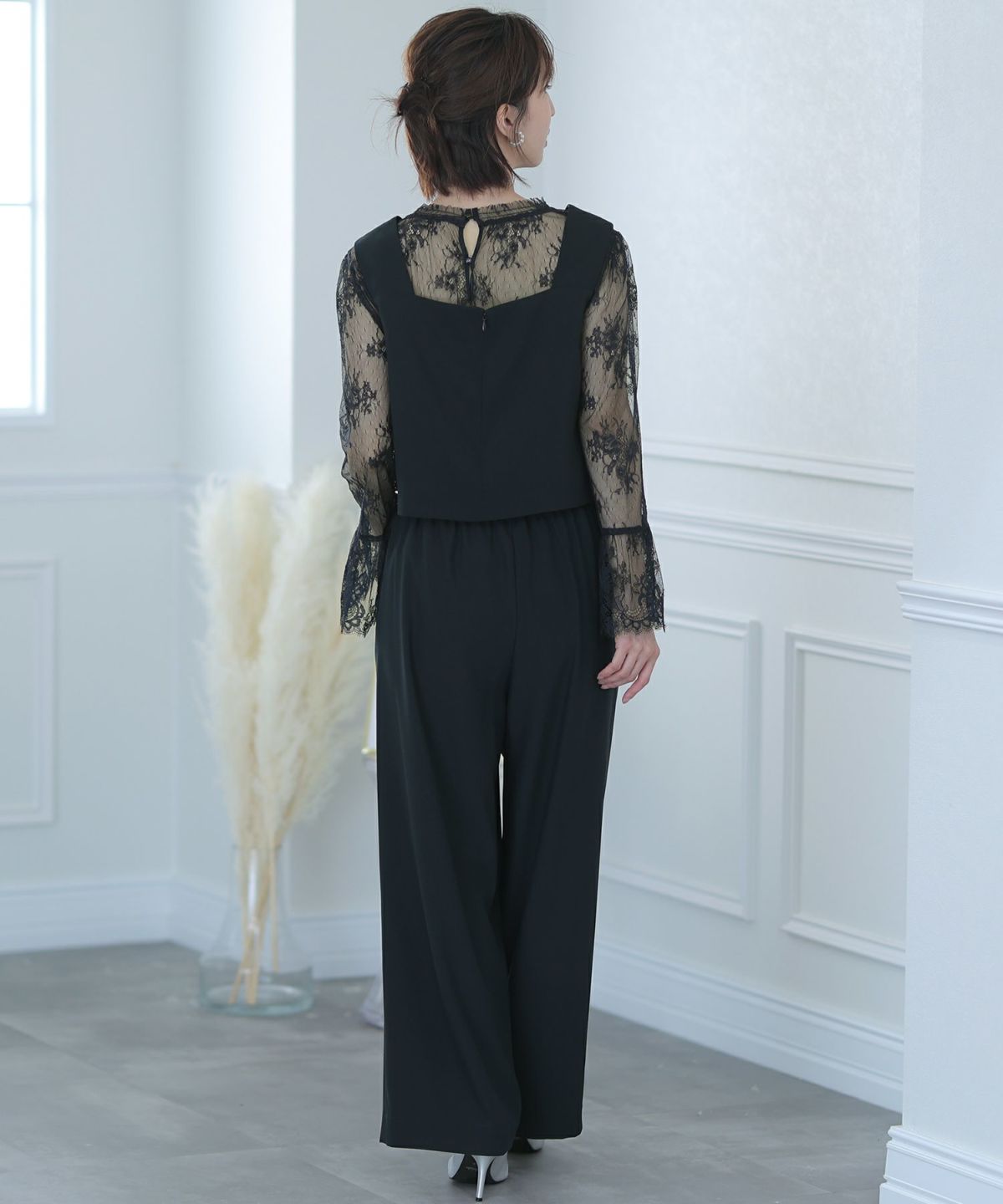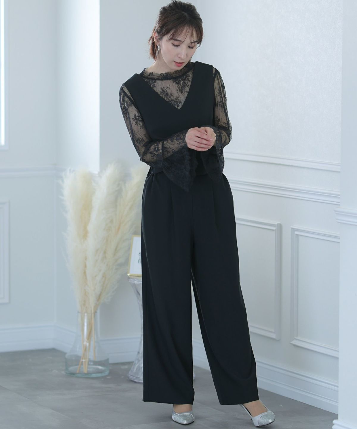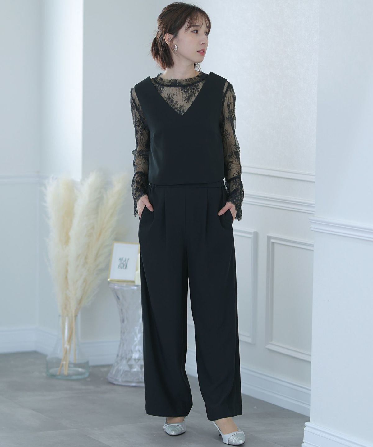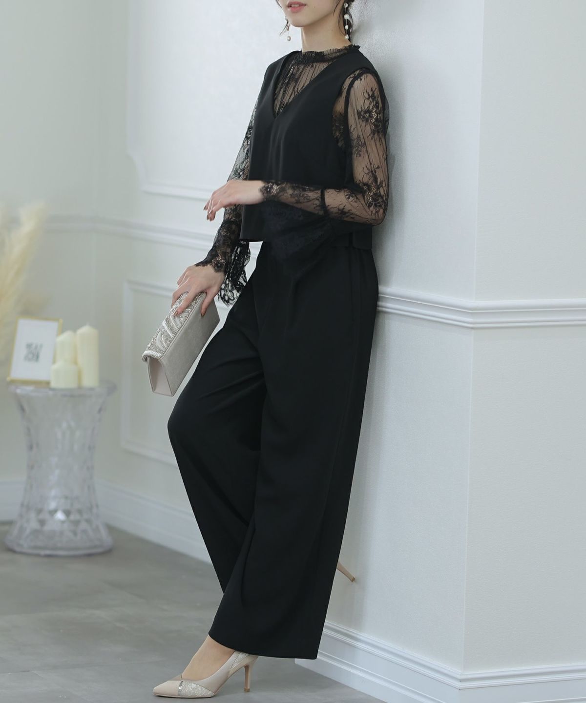 ★体型カバーポイント------------------------------------------------------------【二の腕】【脚】【ウエスト】【ヒップ】ベストが丈が短めなので着るだけでスタイルアップが叶う優れもの。脚長効果があり細見えするパンツドレスです。★インナー・ブラウス・パンツセットでコーディネートの仕方はあなた次第------------------------------------------------------------3点セットのままで着てもこなれ感たっぷりで上品なパンツドレス。お手持ちのお洋服と組み合わせるとさらにコーディネートの幅が広がるお得なアイテム。★シアー×上品の絶妙なバランス------------------------------------------------------------透け感がありつつ繊細なレースとスタイリッシュなシルエットで上品にまとまった1着。大人っぽくモードな印象に仕上げたい方にぴったりのパンツドレスです。★脚長効果でスタイルアップも------------------------------------------------------------トップスを敢えて短めにしているので脚長効果もばっちりのパンツドレスです。ワントーンアイテムなので小物やアクセサリーを合わせやすいもの嬉しいポイント。★素材感------------------------------------------------------------繊細なレーストップスと、しっかりしたジョーゼット生地のベスト・パンツがセットになったパンツドレスです。★こんなシーンの利用にオススメ♪------------------------------------------------------------【結婚式】【二次会】【同窓会】【食事会】【セレモニー】【発表会】【オフィス】でもご利用いただけます。
