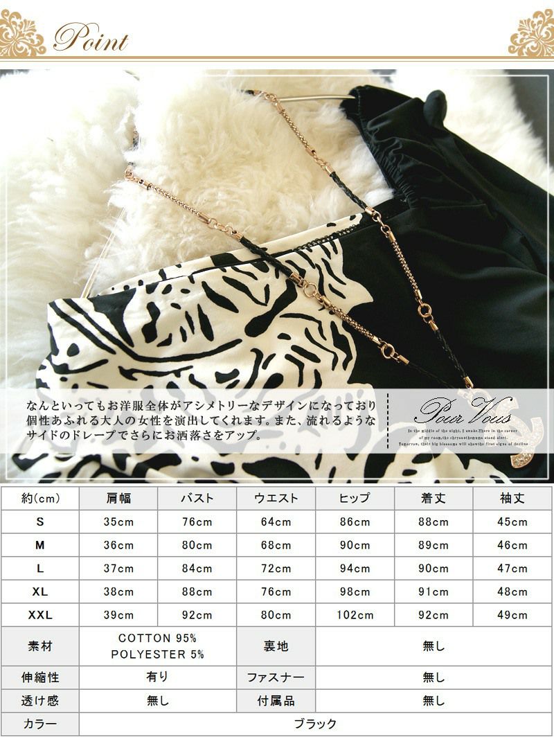 インパクトのあるゼブラ柄のワンピースです。ワンピースが全体的アシンメトリーなデザインとなっています。個性的なデザインで、人の目を引くこと間違いなしです。サイドに入った美しいドレープは、お洒落な大人の女性にぴったりです。ワンランク上のスタイリングを楽しみたい大人の女性にぴったりのワンピースです。