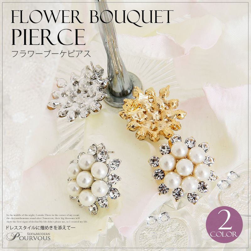 パールとビジューをフラワーブーケのようにデザインした、オシャレなピアス&イヤリング。
