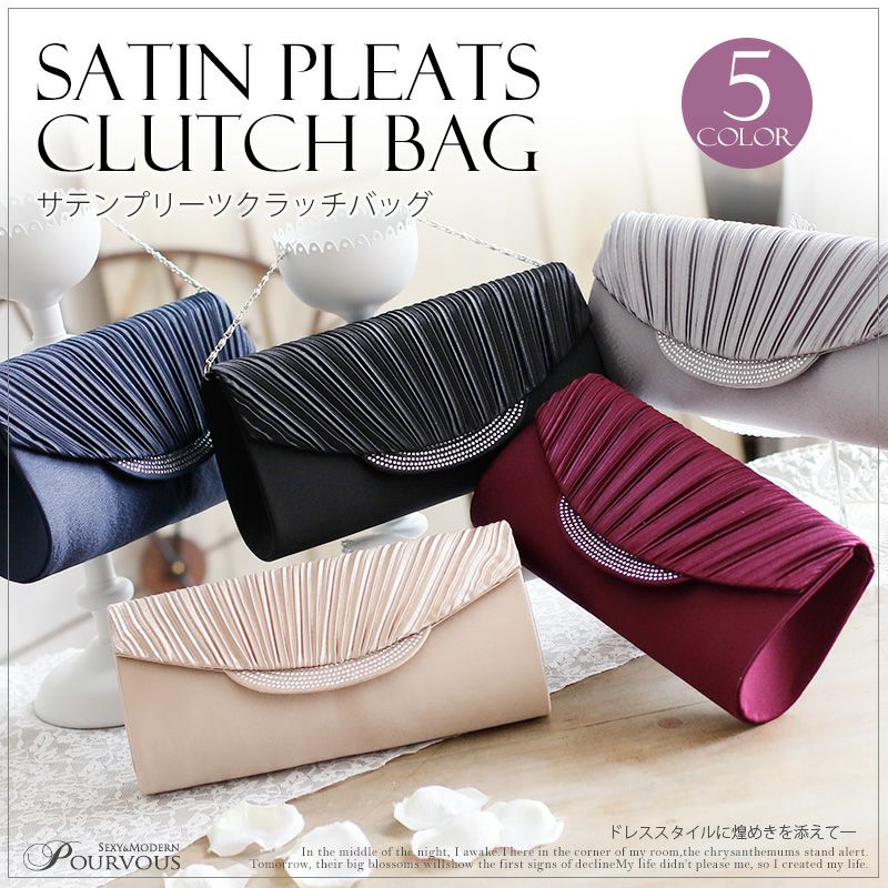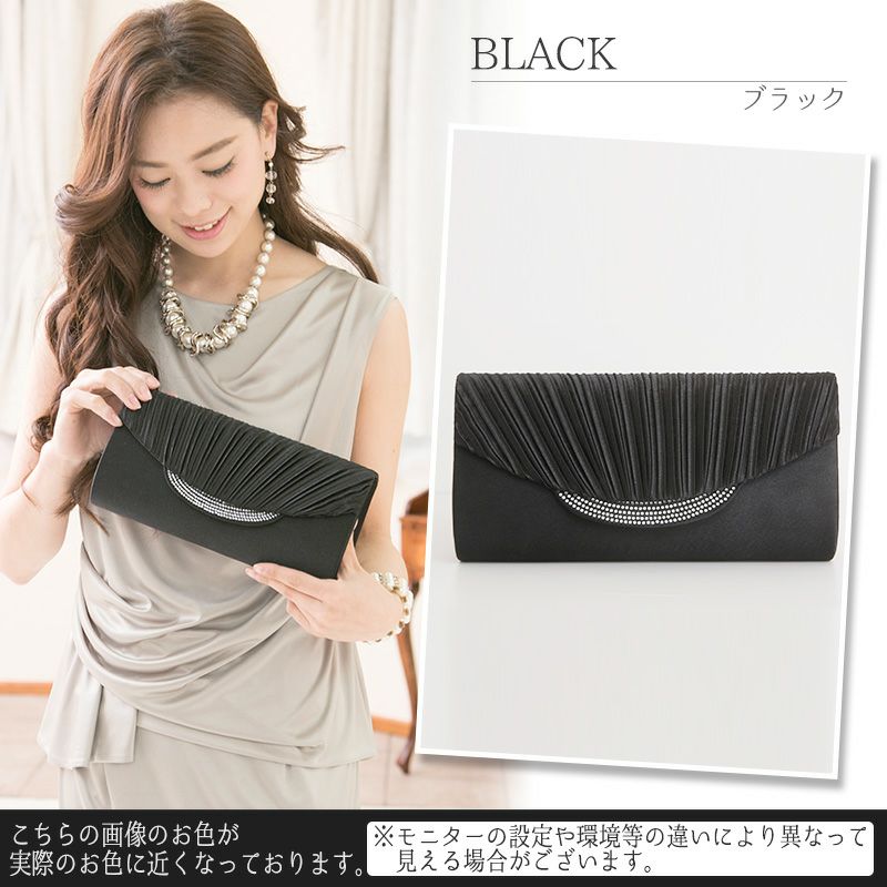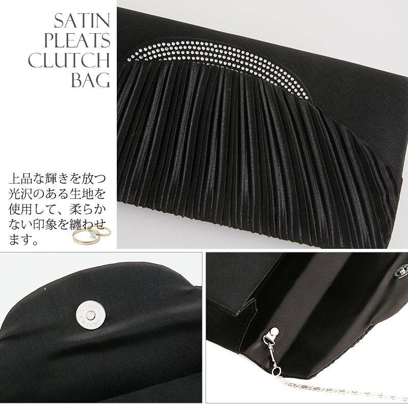 サテン プリーツ クラッチバッグ ラインストーン ビジュー