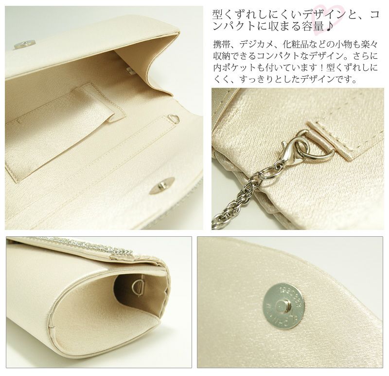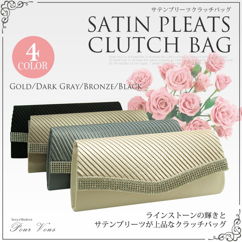 きらきら輝くラインストーンとプリーツサテンが素敵なクラッチバッグです。