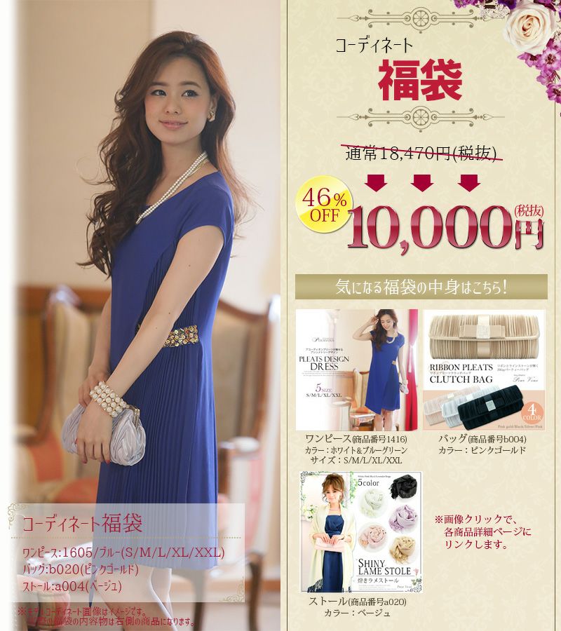 他の画像を見る ※ご好評につき期間延長!※福袋 ワンピース 結婚式 パーティドレス 謝恩会 Aライン 上品 コーディネート 膝丈 パーティー 通販 服装 セット 【福袋】 3点セット<ワンピース・バッグ・ストール> 即日発送 販売価格 ¥ 11,000 税込 会員特別価格 ¥ 10,000 税込 販売を終了しました。 在庫切れ 詳細を見る お気に入りに登録する