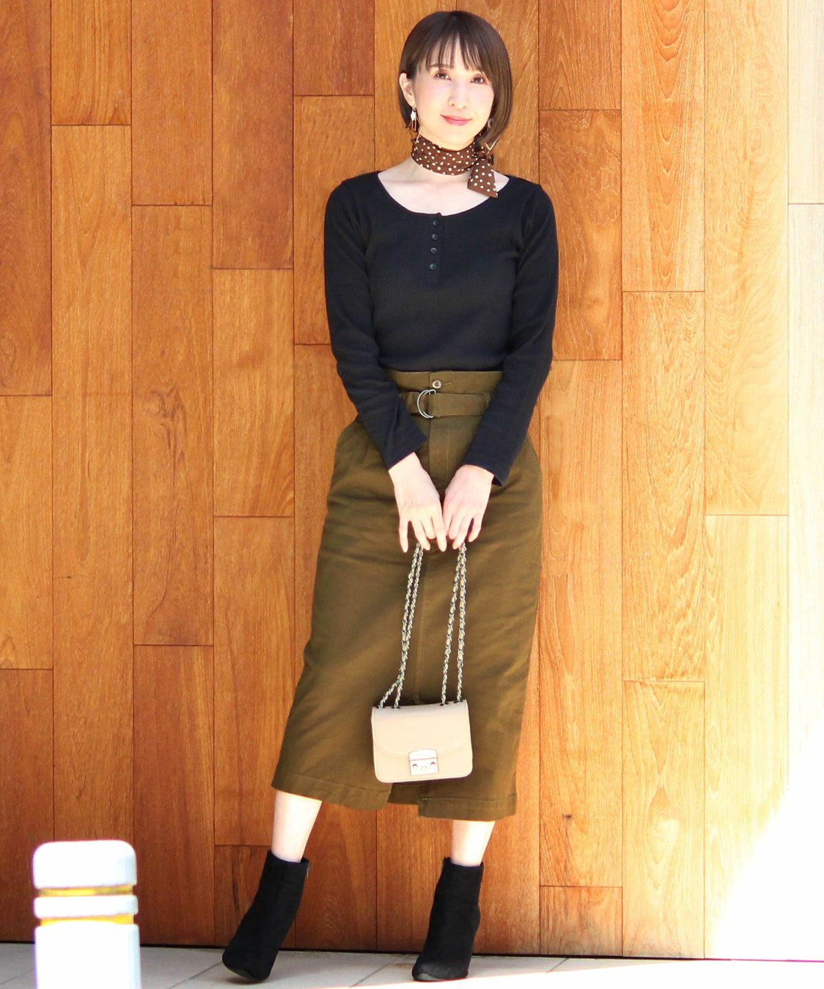 ハイウエストで脚長効果もあるタイトスカート。付属ベルトでスッキリしたシルエットに仕上がり、大人可愛いスタイルに。