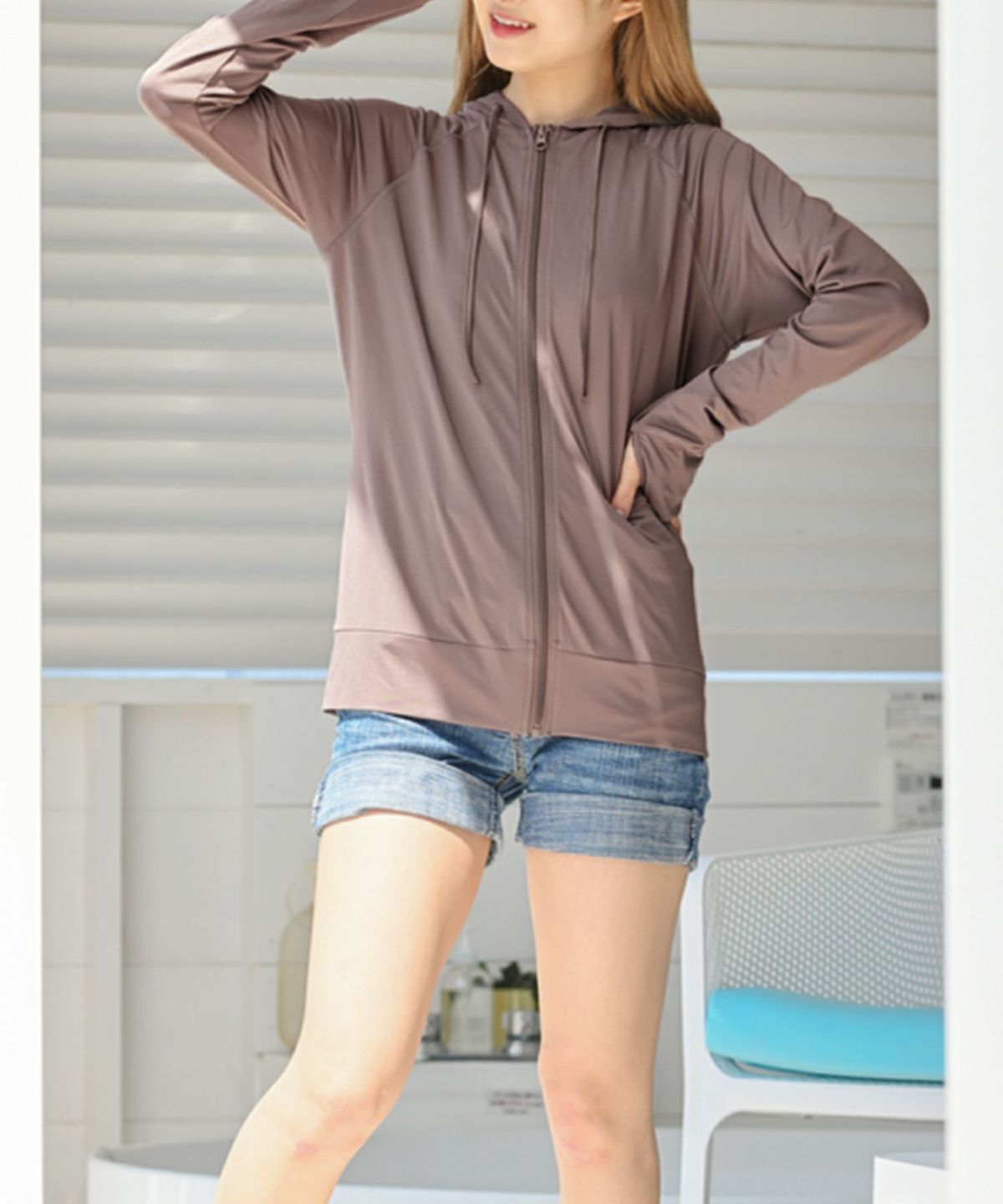 指穴ありの長い袖丈なので、手の甲までしっかりとカバーできるのが嬉しいポイント!フード付きでアウトドアシーンでも活躍してくれます。喉元までしっかりとファスナーが閉まるので、デコルテもしっかりケア。