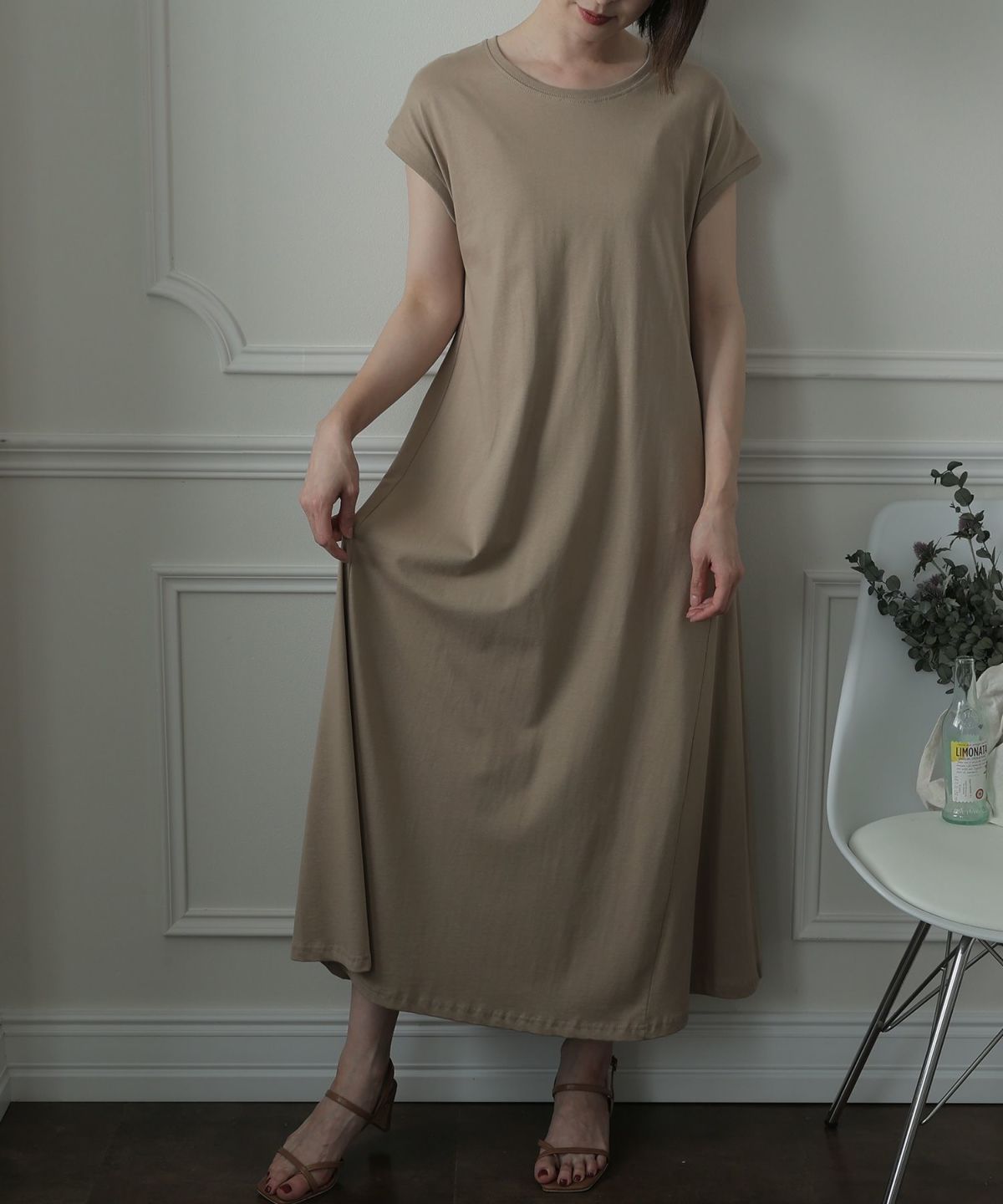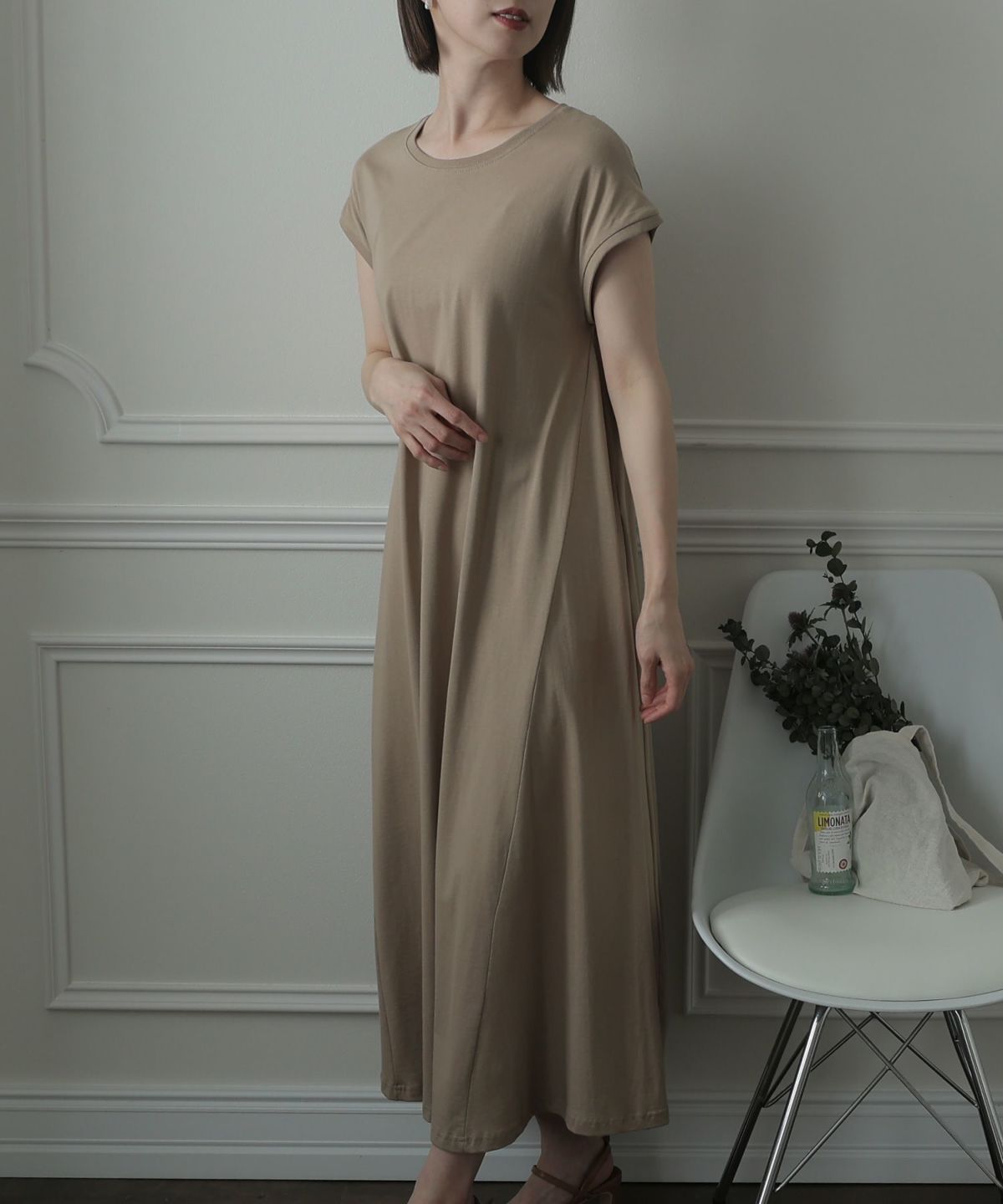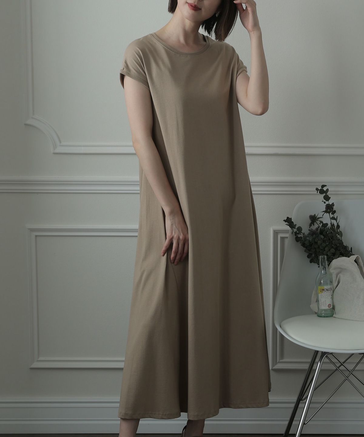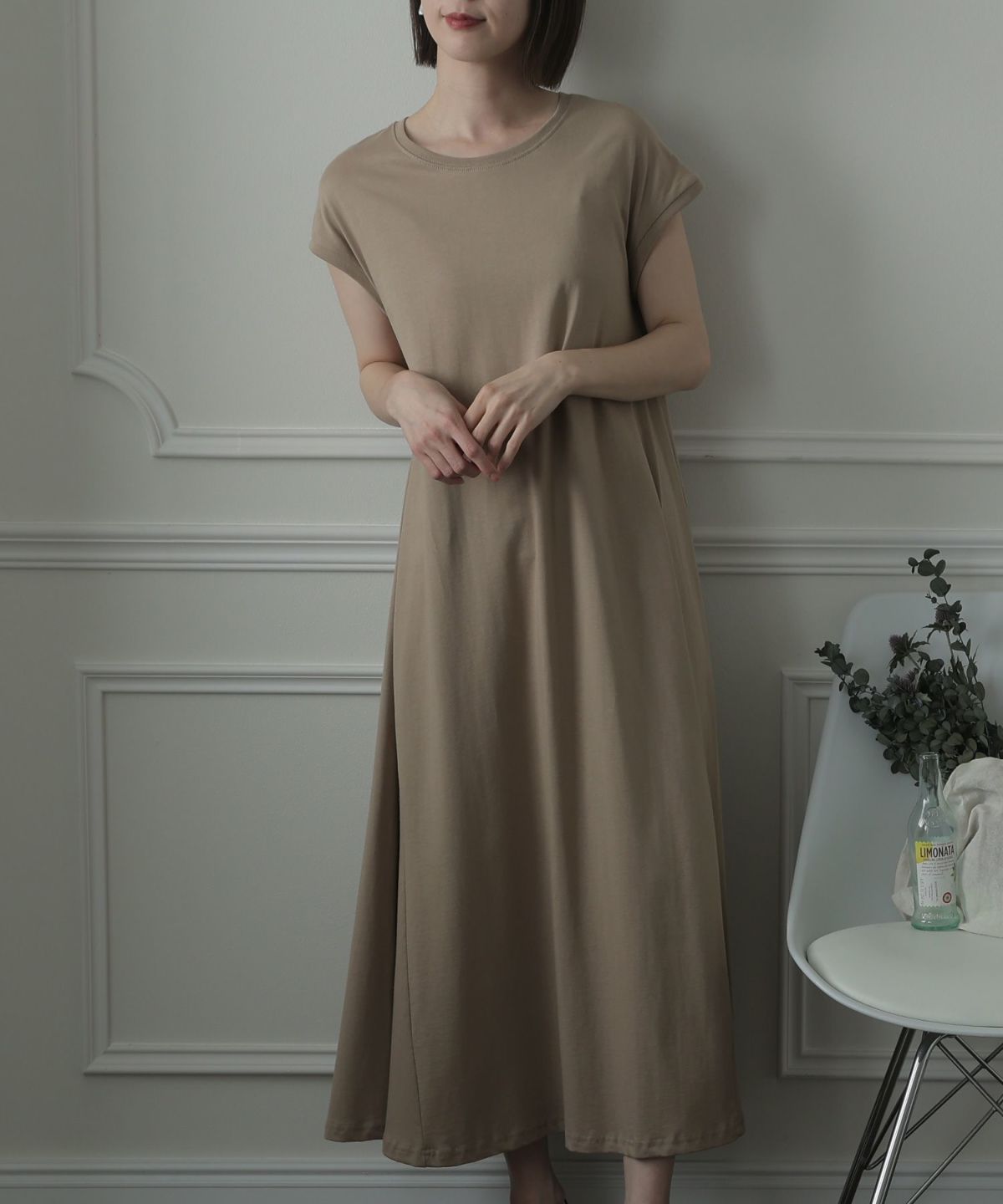 フレンチスリーブでさり気なく肩をカバーできるワンピース。Aラインなので裾の広がりが可愛く、クルーネックが首元をすっきりと見せてくれます。
