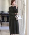 ■プチハイネックのアクセントが女性らしいワンピースふわっとしたシルエットが肉感を拾わず、ウエストゴムで着心地もラクチン。