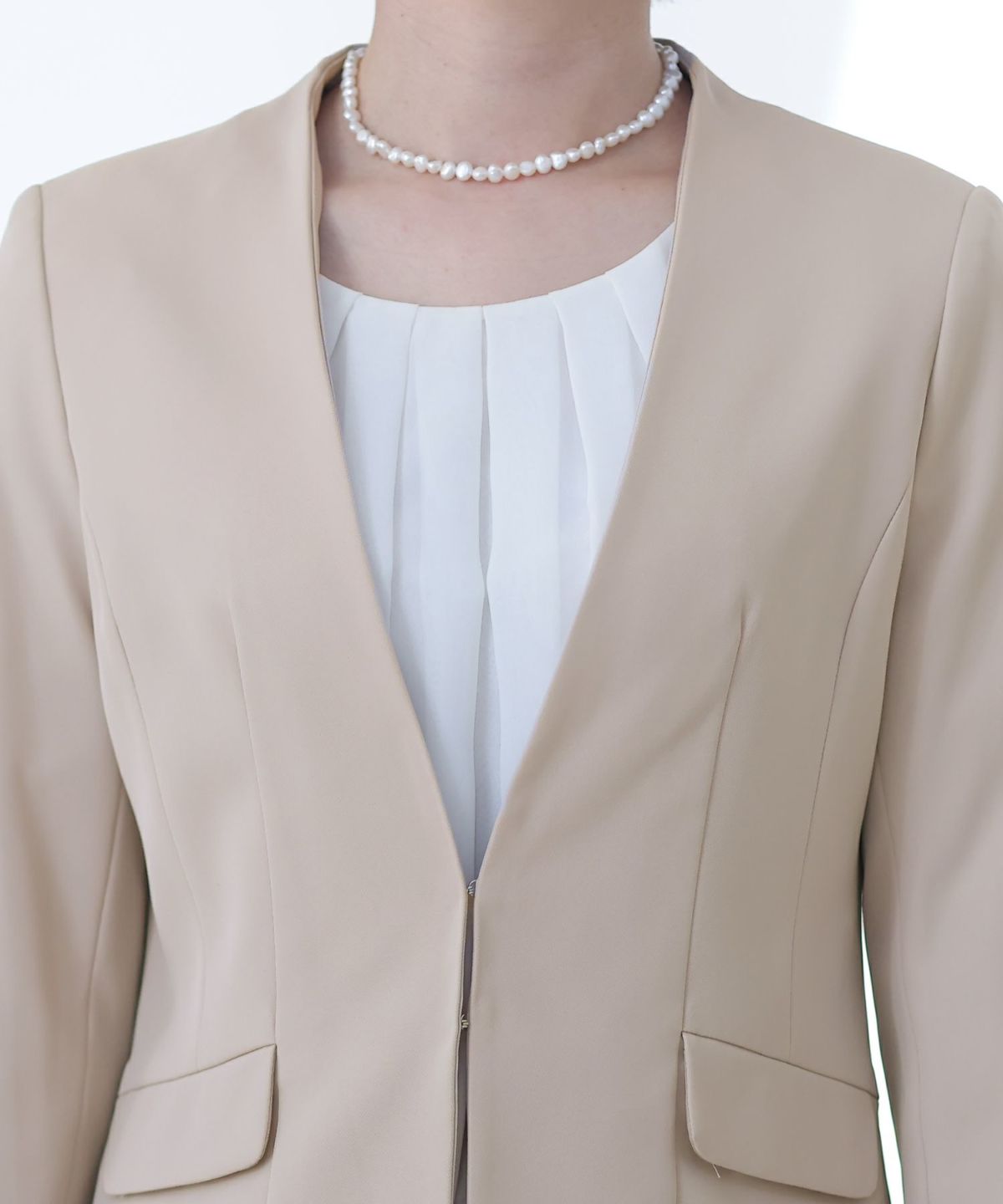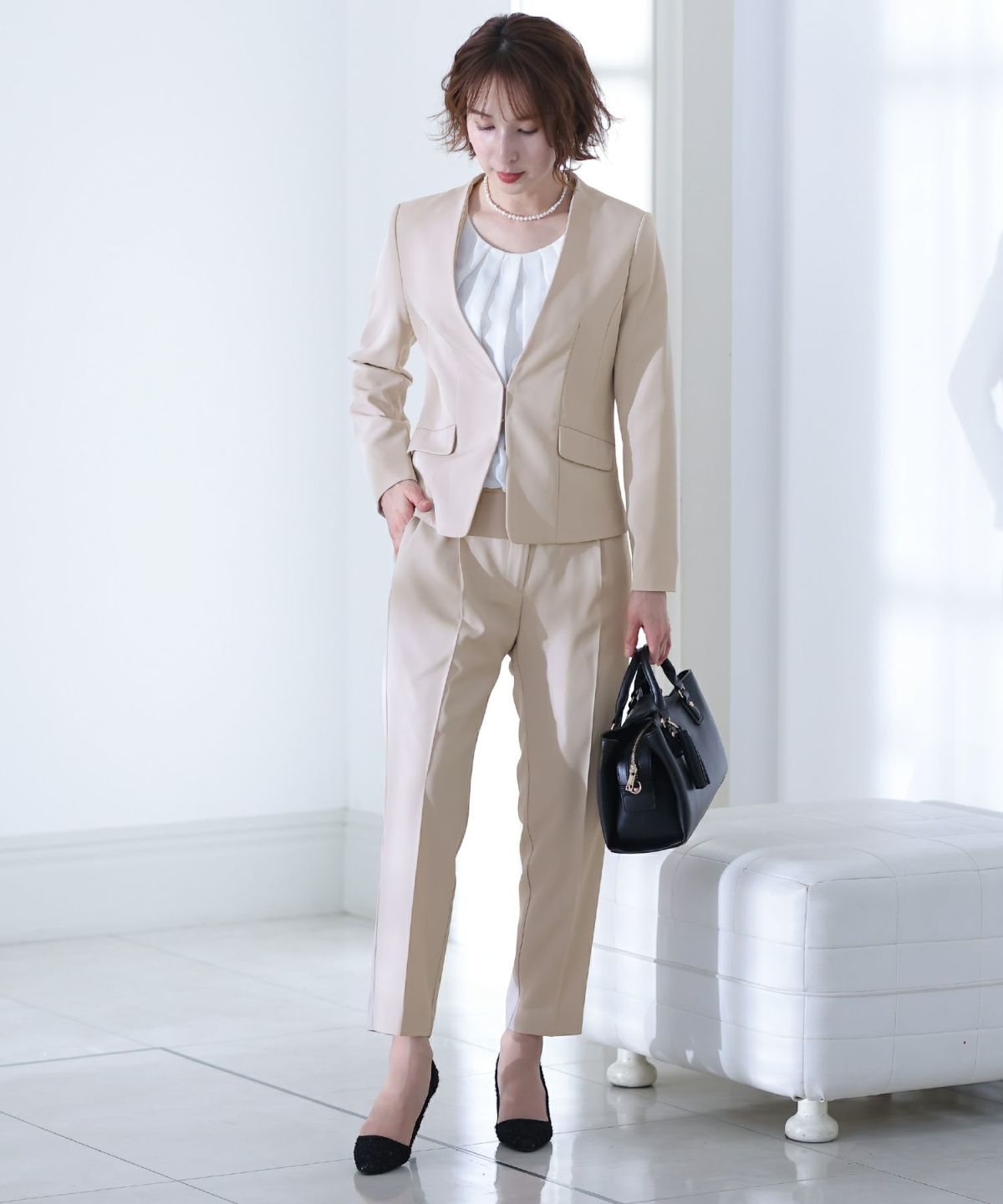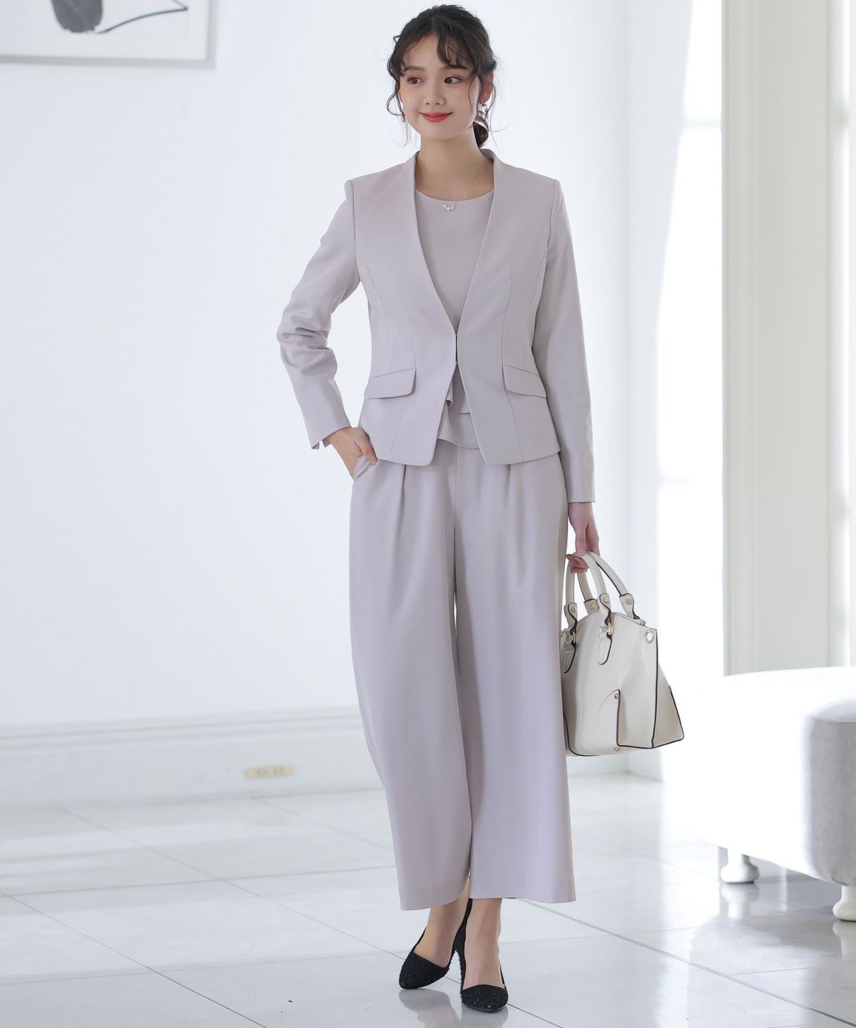 ■2タイプパンツ×ノーカラーJK気分やTPOで選べる2種類のパンツとノーカラージャケットの3点セットです。セットアップではもちろん、それぞれ単品での着回しも◎すっきりとしたデザインがスタイリッシュと女性らしさを両立させます。オケージョンシーンではもちろん、ビジネスや様々なシーンで大活躍♪