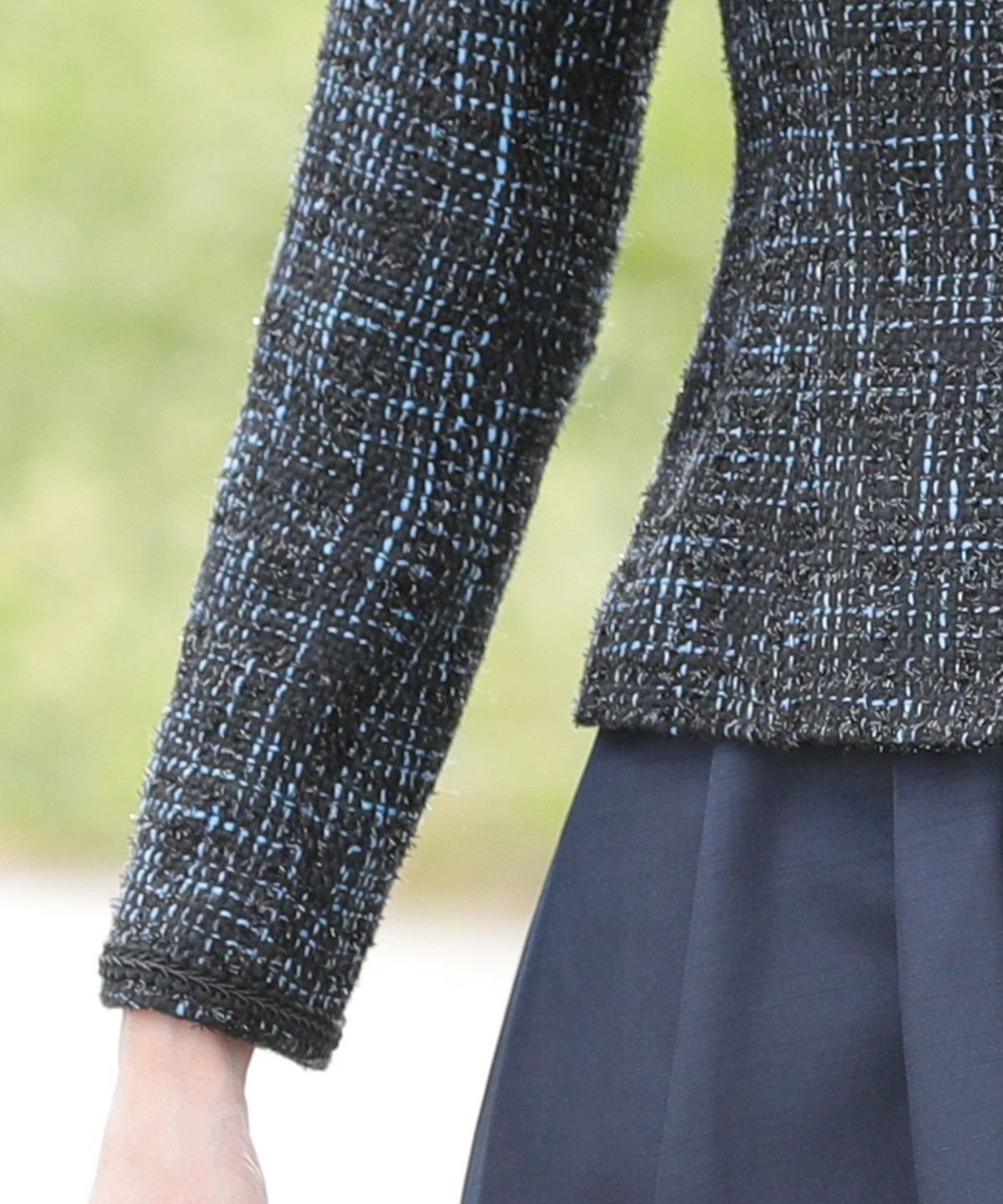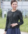 ツイード生地のノーカラージャケットには高級感ある先染め素材使用。