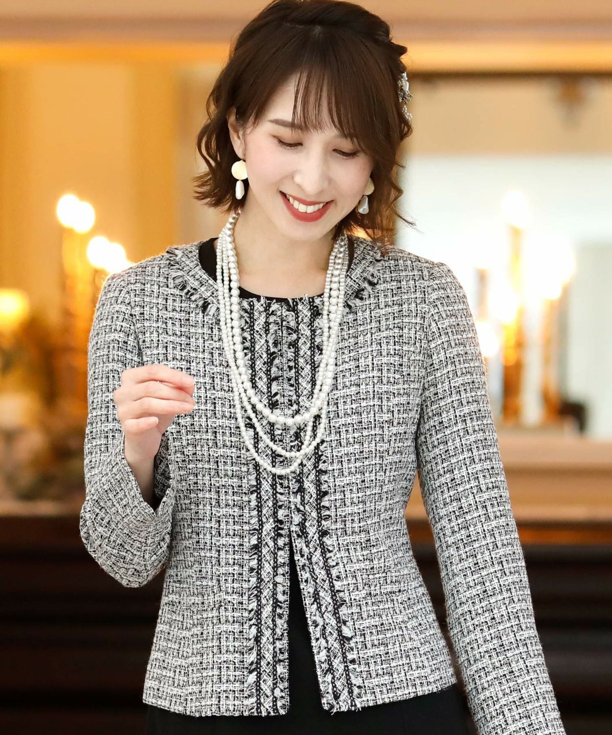 ざっくりとした織りが特徴のラメ感あるツイードを使用し、セレモニーに相応しい一着に。