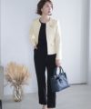 ■ツイード×テーパードパンツノーカラージャケットとブラウス、テーパードパンツがセットになったスーツです。ぺプラムになったトップスに付属のリボンをつけると可愛さアップ。セットでの着用はもちろん別々での着用もおすすめ。入学式や卒業式はもちろん様々なオケージョンシーン、お食事会で活用していただけます。
