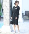 ■体型カバーポイント【二の腕】【脚】【ウエスト】【ヒップ】タイトなスカートですがゆったりとしているので気になるヒップや太ももをカバーしてくれます。腕回りは窮屈になりすぎずゆとりがあるので、二の腕もさり気なくカバー