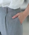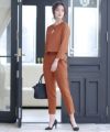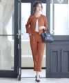 ■体型カバーポイント【二の腕】【脚】【ウエスト】【ヒップ】ジャケットはスタイルアップ効果のあるややショートの丈感。パンツにはタックが施されており、脚長効果も◎