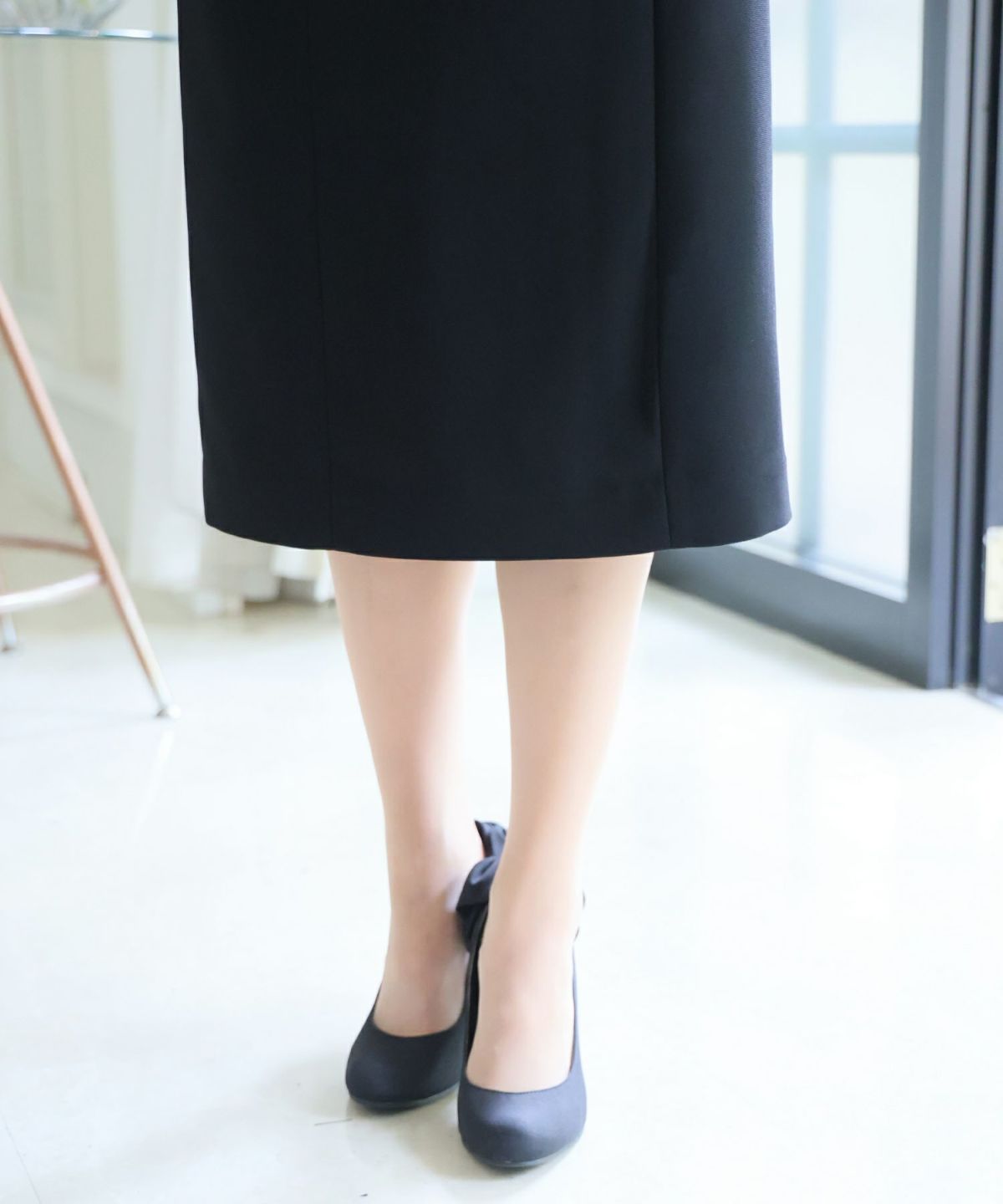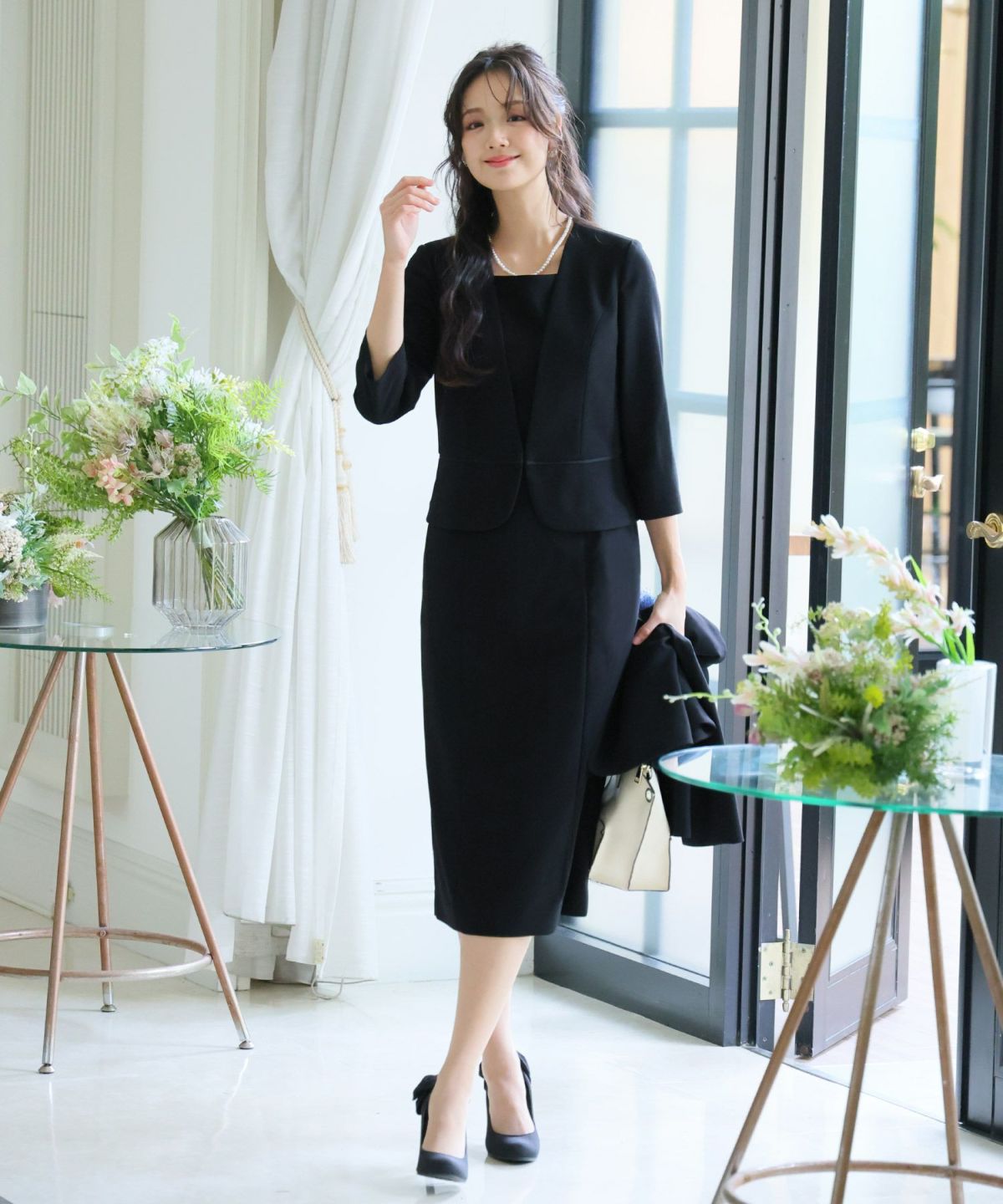 ワンピース単体でもフォーマルに着こなせます。