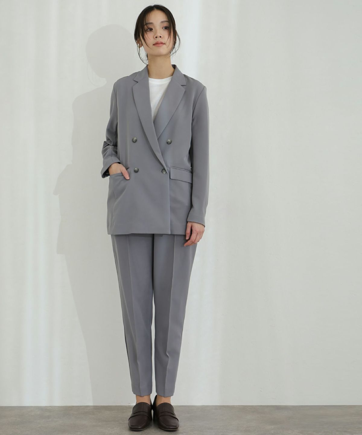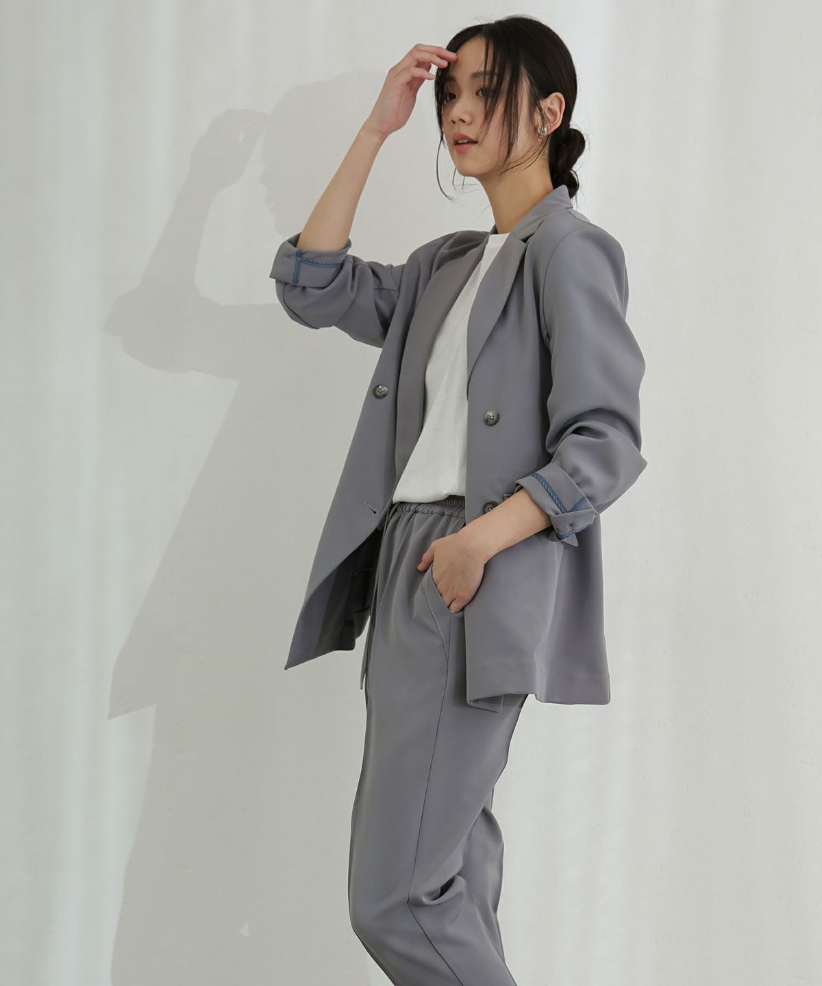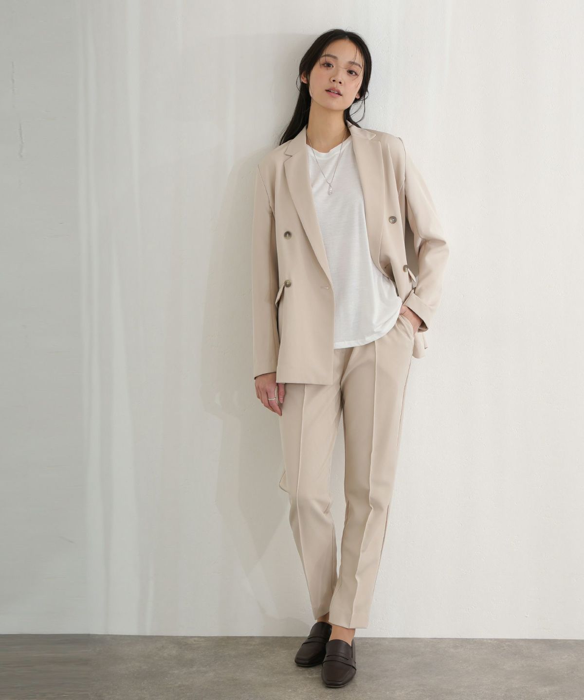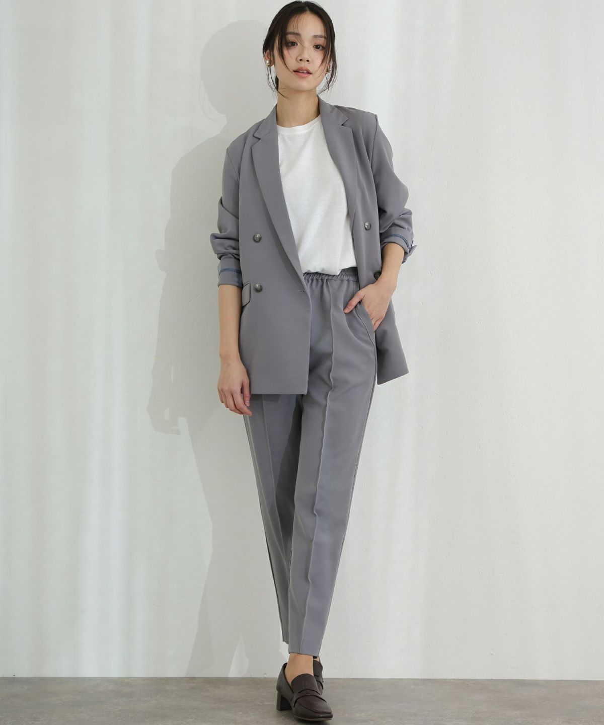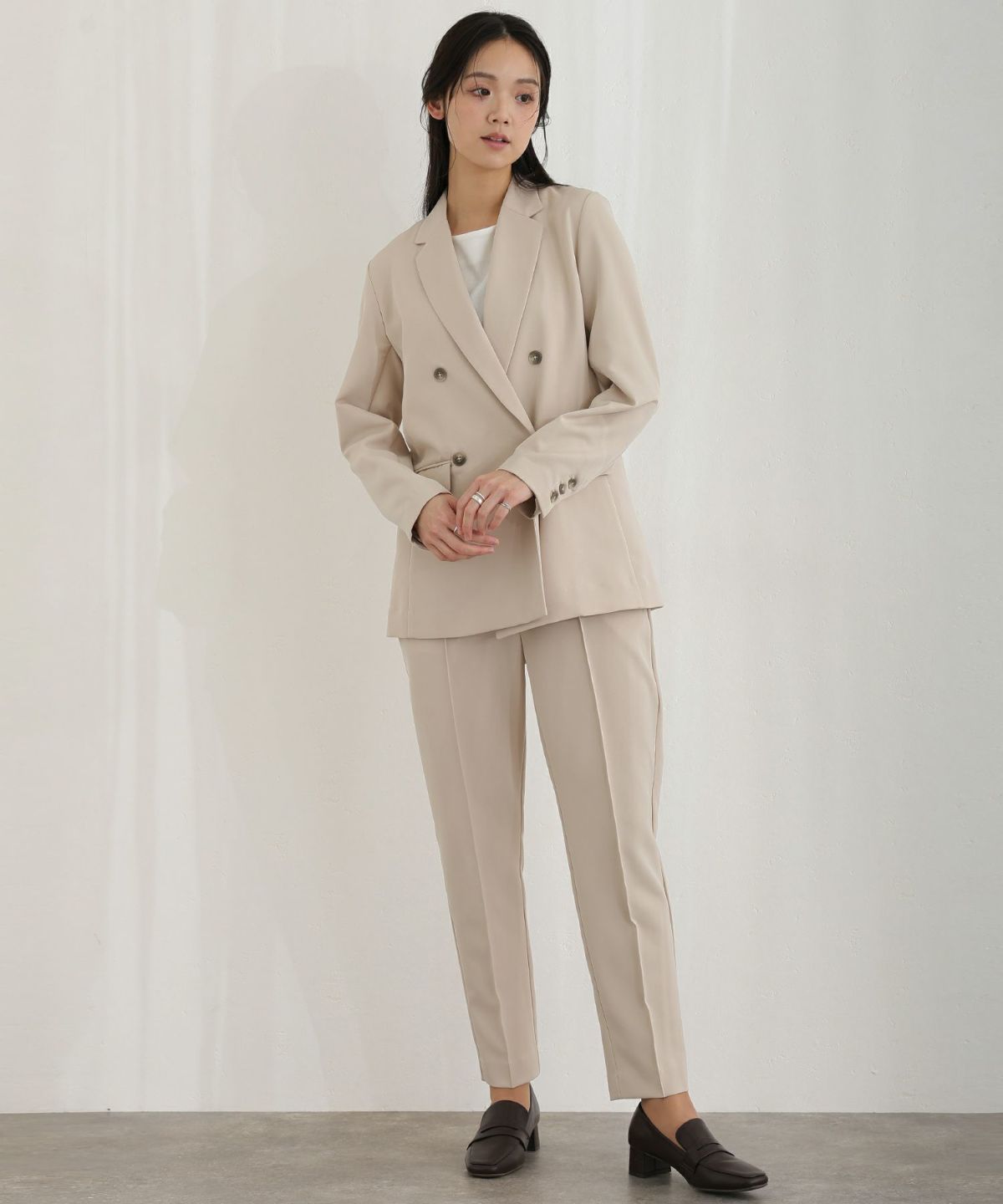 ダブルカラーのジャケットと美しいセンタープレスパンツでスタイリッシュな印象に。