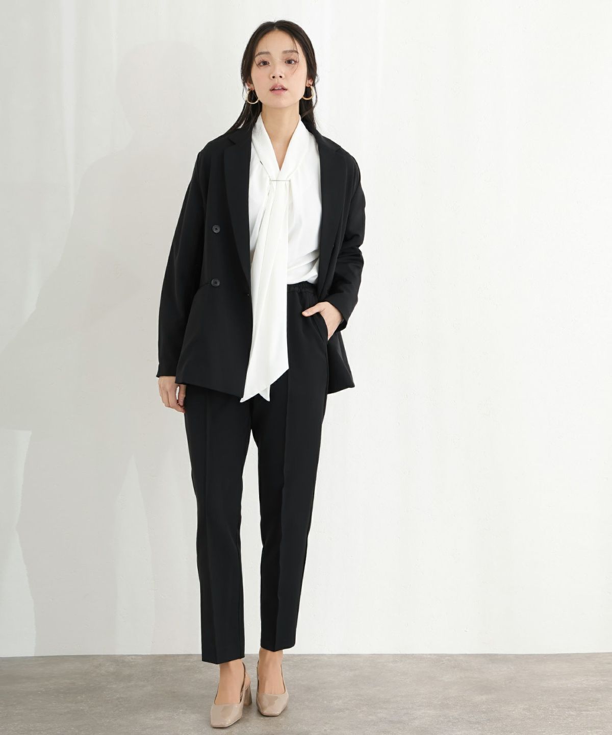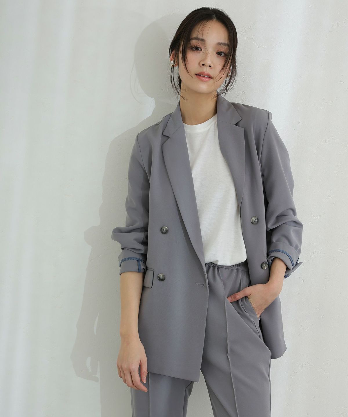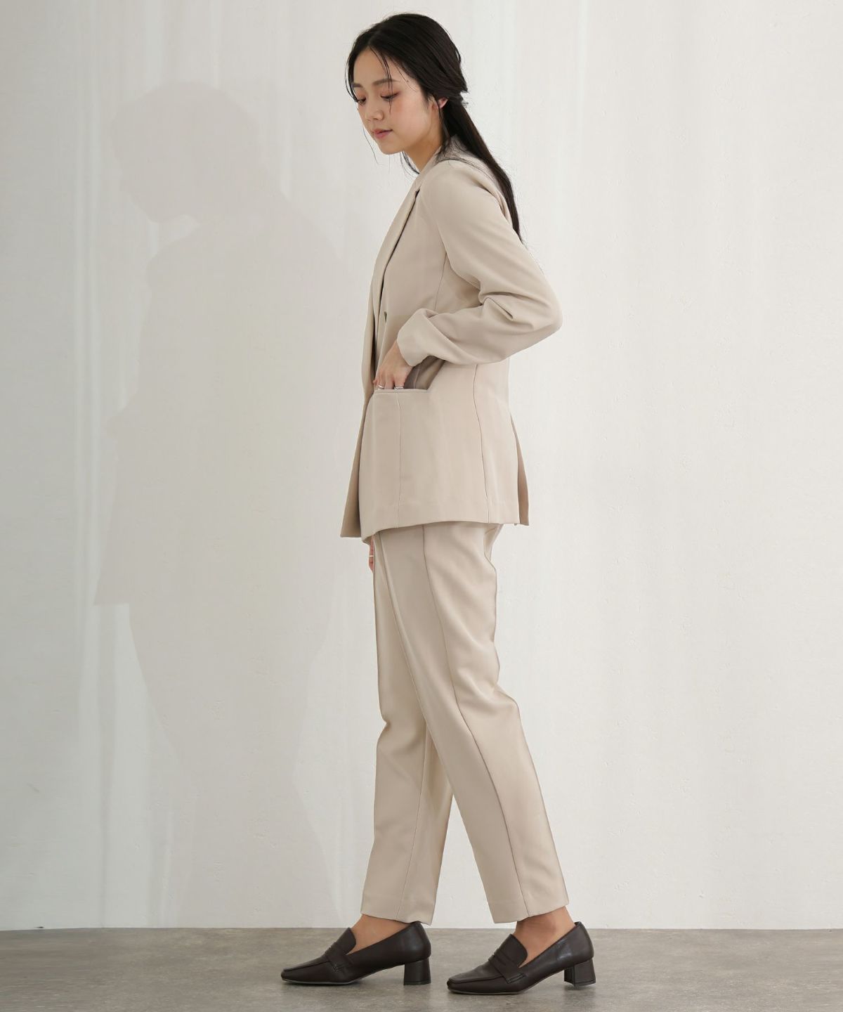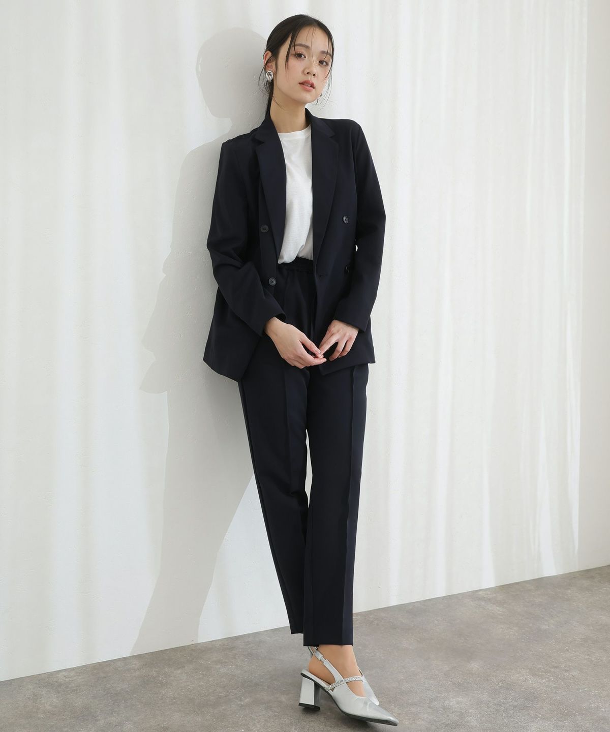 ダブルカラーのジャケットと美しいセンタープレスパンツでスタイリッシュな印象に。