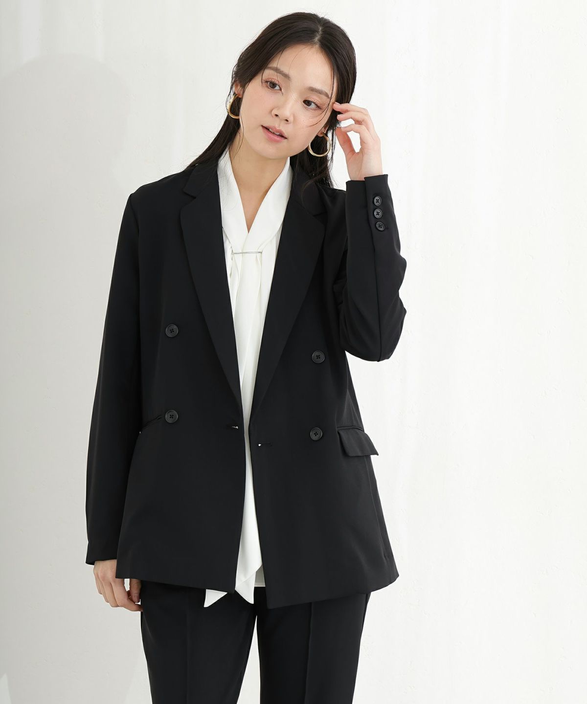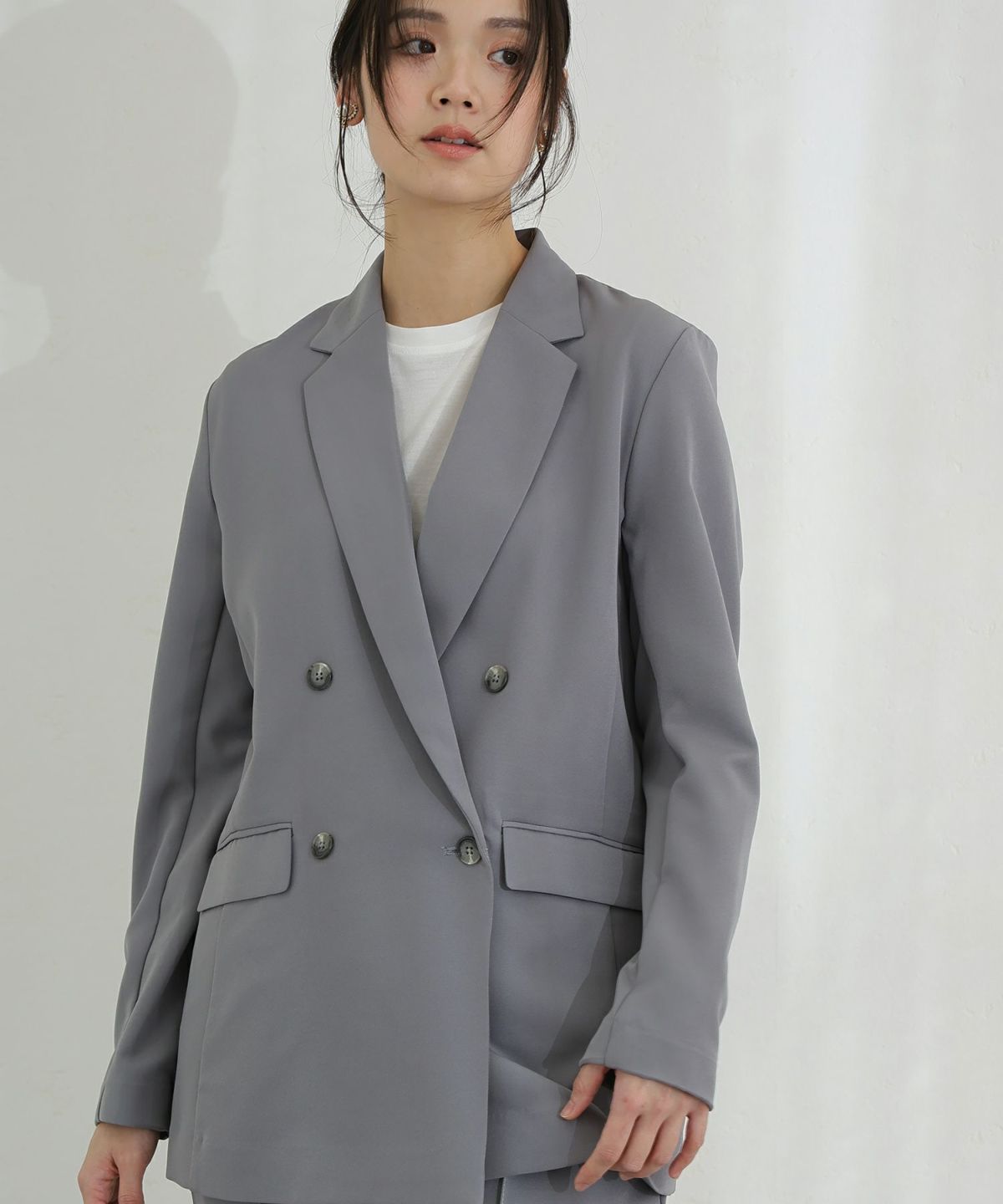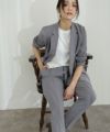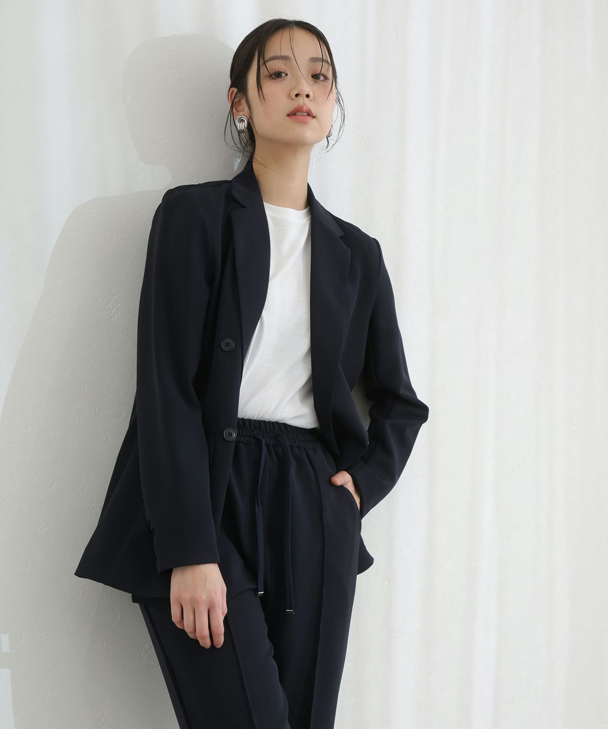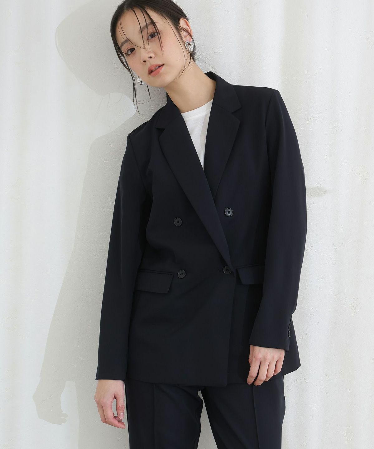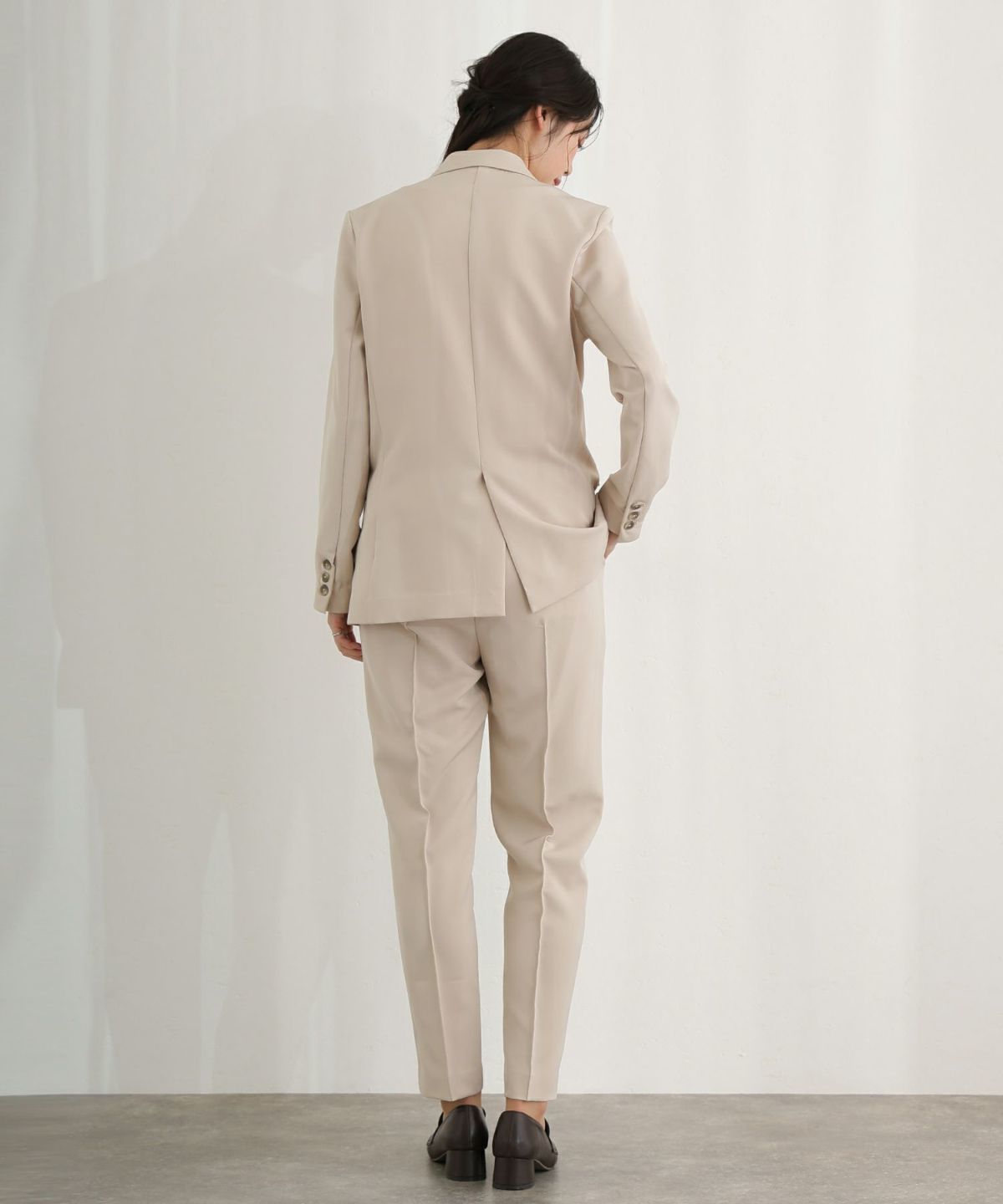 ダブルカラーのジャケットと美しいセンタープレスパンツでスタイリッシュな印象に。