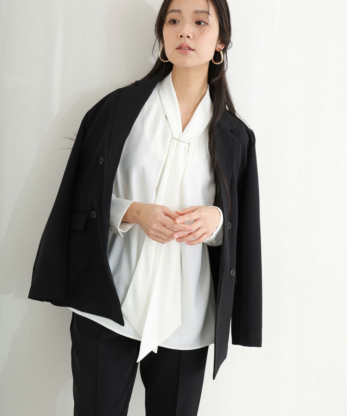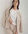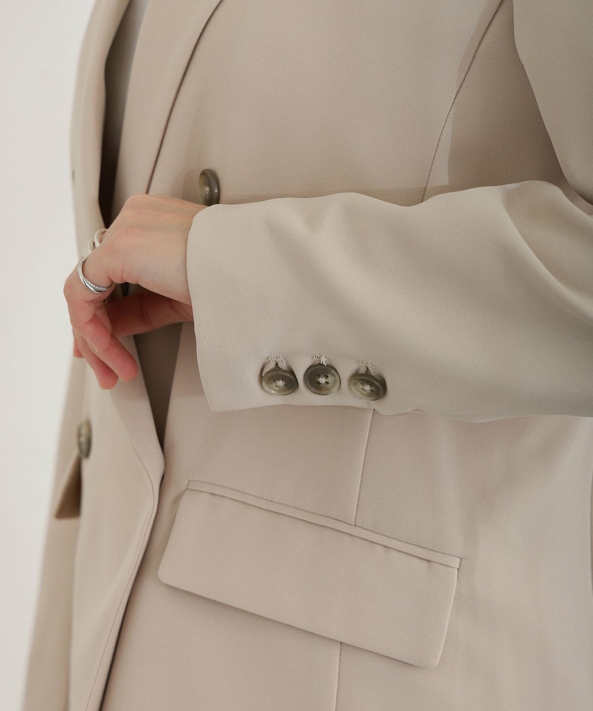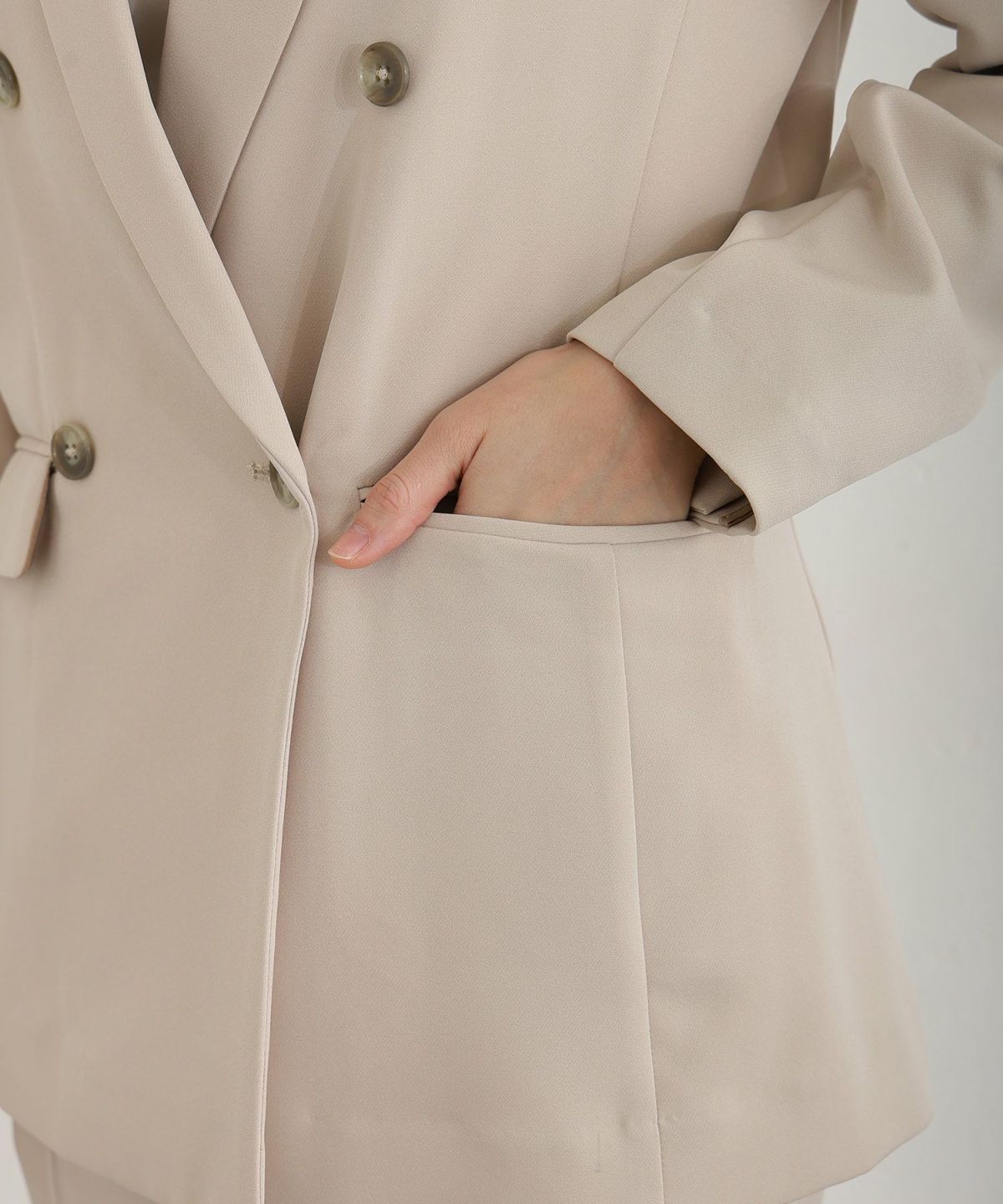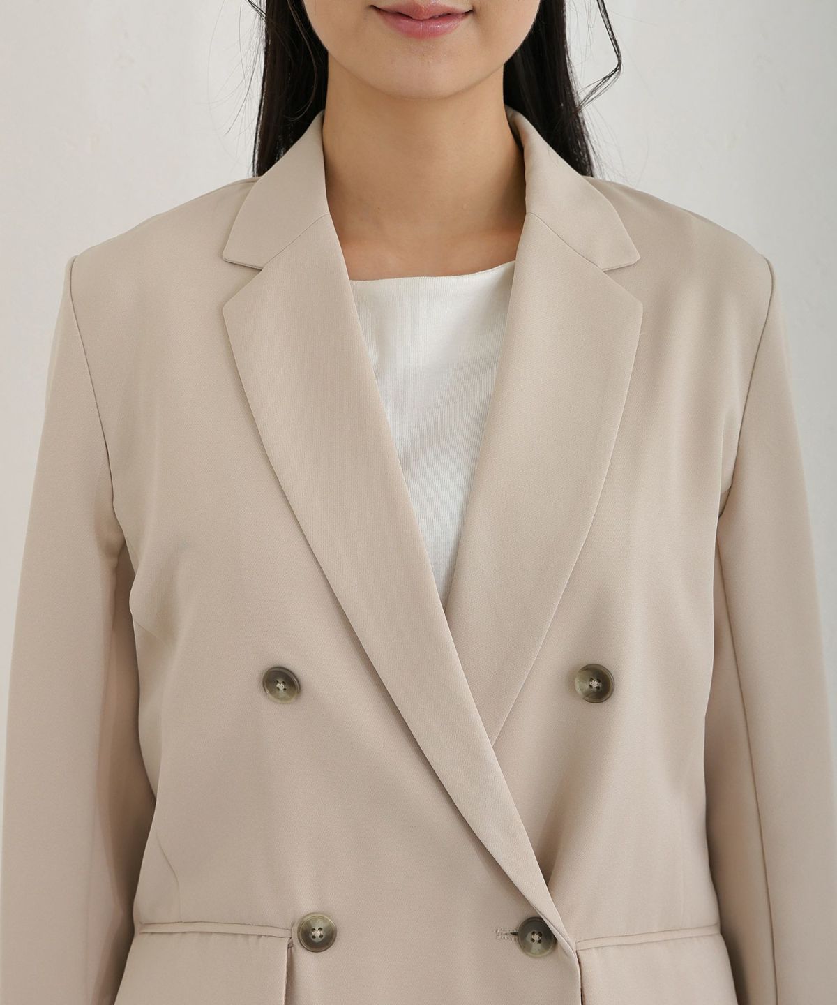 ダブルカラーのジャケットと美しいセンタープレスパンツでスタイリッシュな印象に。