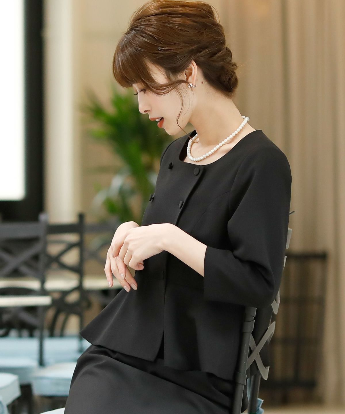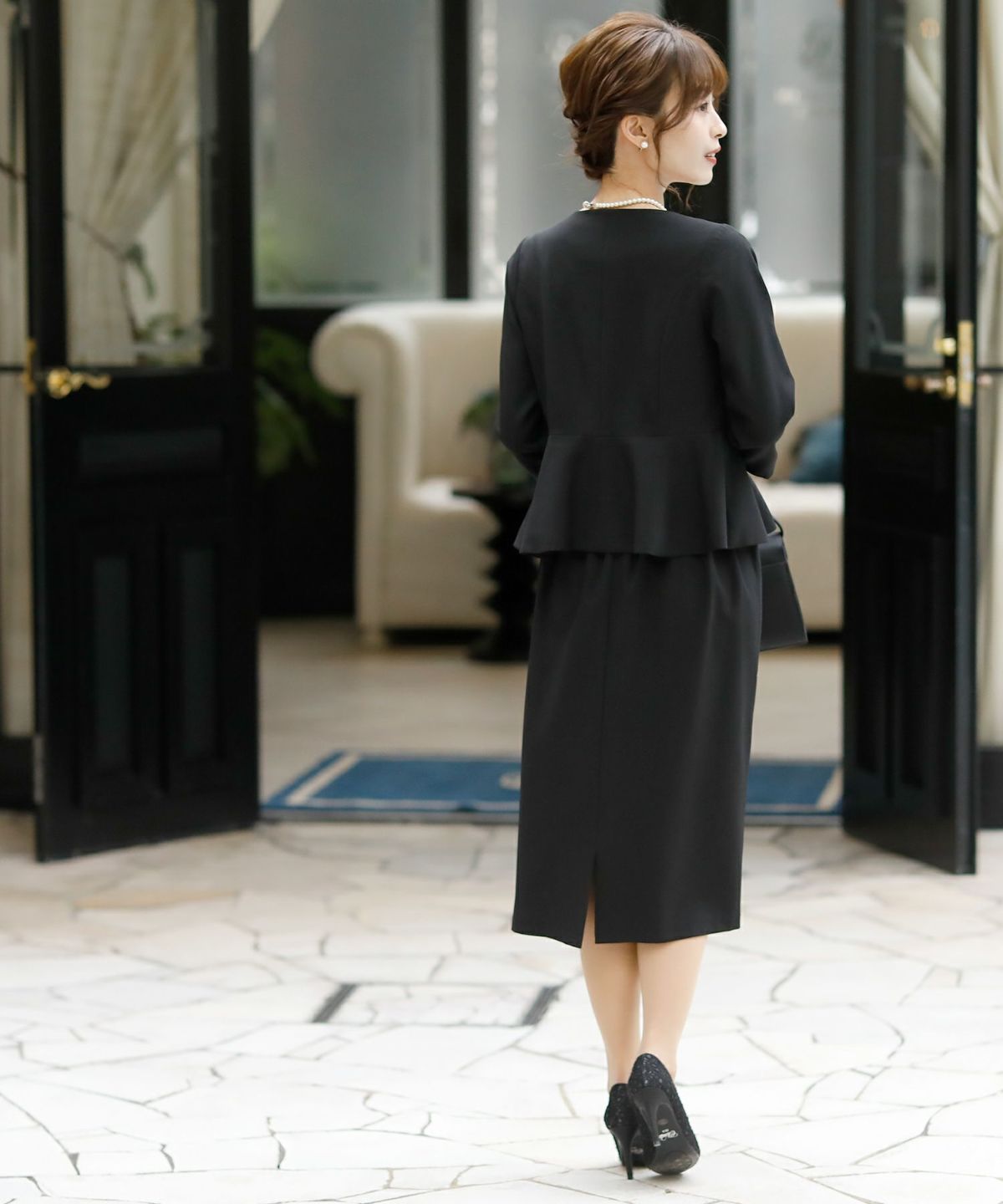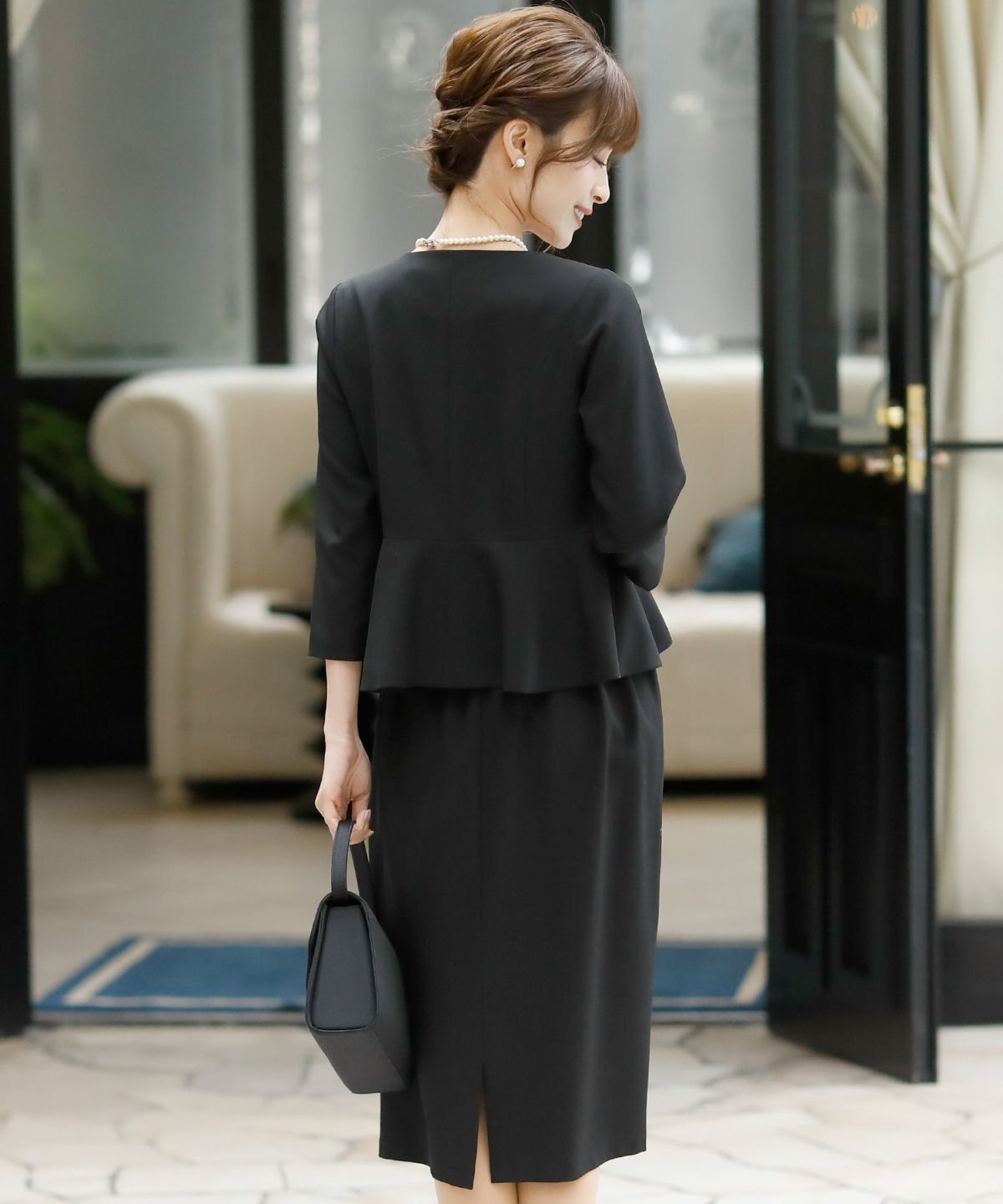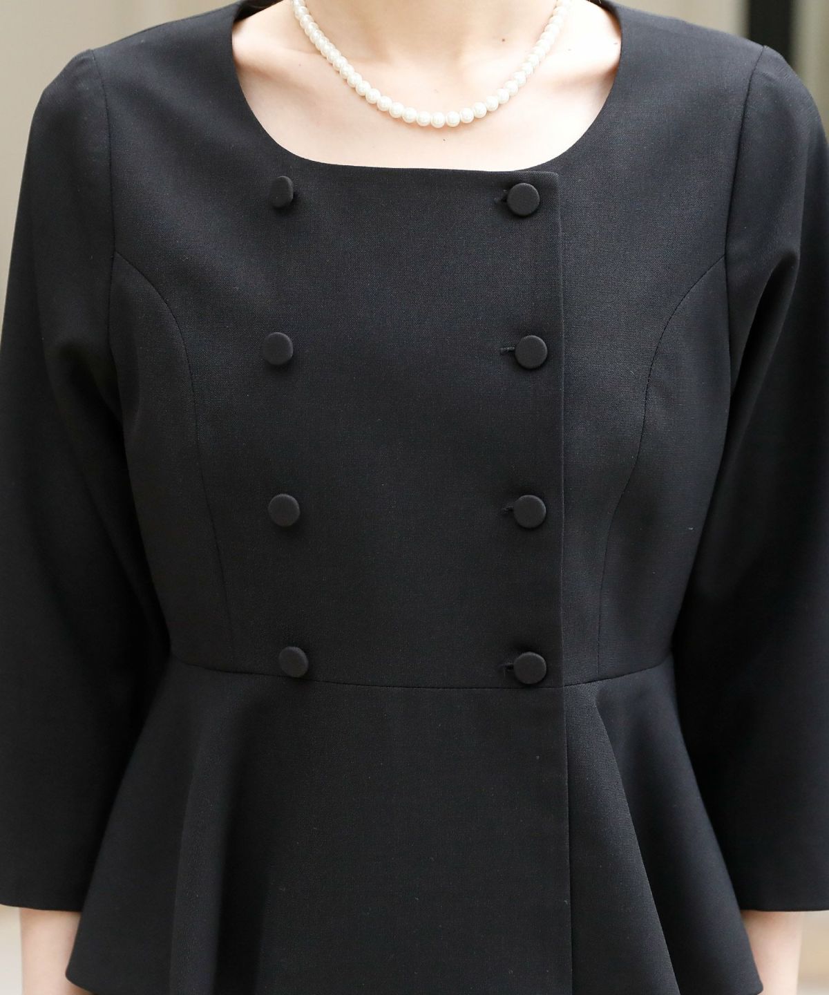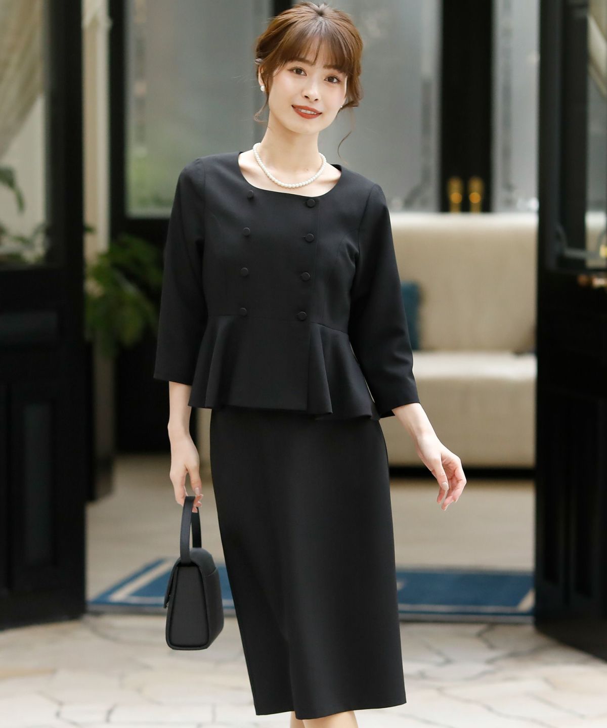★体型カバーポイント------------------------------------------------------------【二の腕】【脚】【ウエスト】【ヒップ】ペプラムジャケットに少し長めのタイトスカートを組み合わせ、着るだけで、スタイリッシュに見えるデザインに仕上げました♪★ペプラムジャケットとスカートの2点セット♪------------------------------------------------------------コーディネートに悩まず、お呼ばれコーデが簡単に完成する嬉しいアンサンブルセット。コサージュを付けると入卒でも使用可能♪冠婚葬祭用でも上品に着こなせるデザインです。★ダブルデザインペプラムジャケット------------------------------------------------------------1枚でもしっかり感と上品さ溢れるジャケットです。ペプラムデザインで気になるお腹周りを隠し、ウエストの一番細い部分に切り替えを入れ、ラインが綺麗に見えるのが嬉しいポイントです☆前開き釦を敢えて小さくし、スッキリ感とラインの綺麗さを演出しました。袖は折り返ししても肘が隠れる上品な丈感で、夏でも涼しく着れるのが◎