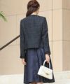 ツイード生地のノーカラージャケットには高級感ある先染め素材使用。